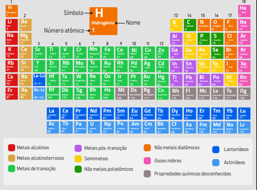 H He Símbolo H 1 2 13 14 15 16 17 2 Li Be Hidrogênio Nome B N F Ne Berilio Oxigênic Fluor 3 4 Número atômico 1 5 6 7 8 9 10 Na Mg Ai Si P S CI Ar Enxofre 11 12 3 4 5 6 7 8 9 10 11 12 13 14 15 16 17 18 Ca Sc Ti V Cr Mn Fe Co Ni Cu Zn Ga Ge As Se Br Kr Potassio Cromo Ferro Cobaito Niquel Cobre Zinco 19 20 21 22 23 24 25 26 27 28 29 30 31 32 33 34 35 36 Rb Sr Y Zr Nb Mo Ru Rh Pd Ag Cd In Sn Sb Te I Xe Rubidio Prata Cadmin Estanho 37 38 39 40 41 42 43 45 46 47 48 49 50 51 52 53 54 Cs Ba La-Lu Hf Ta W Re Os In Pt Au Hg Pb Bi Po At Rn Cesio Platina Ouro Mercurio Talio Chumbo Bismuto 55 56 57-71 72 73 74 75 76 77 78 79 80 81 82 83 84 85 86 Fr Ra Ac-Lr Rf Db Sg Bh Hs Mt Ds Rg Cn Nh Mc Lv Ts 0g Radio 87 89-103 104 105 106 107 108 109 110 111 112 113 115 116 117 118 La Ce Pr Nd Pm Sm Eu Gd Tb Dv Ho Er Tm Yb Lu Promécio Europio 57 5: 59 60 61 62 63 64 65 66 67 68 69 70 71 Ac Th Pa U Np Pu Am Cm Bk Cf Es Em Md No Lr Curio California 89 90 91 92 93 94 95 96 97 98 99 100 101 102 103 Metais alcalinos Metais pós-transição Não metais diatômicos Lantanídeos Metais alcalinoterrosos Semimetais Gases nobres Actinídeos Metais de transição Não metais poliatômicos Propriedades químicas desconhecidas