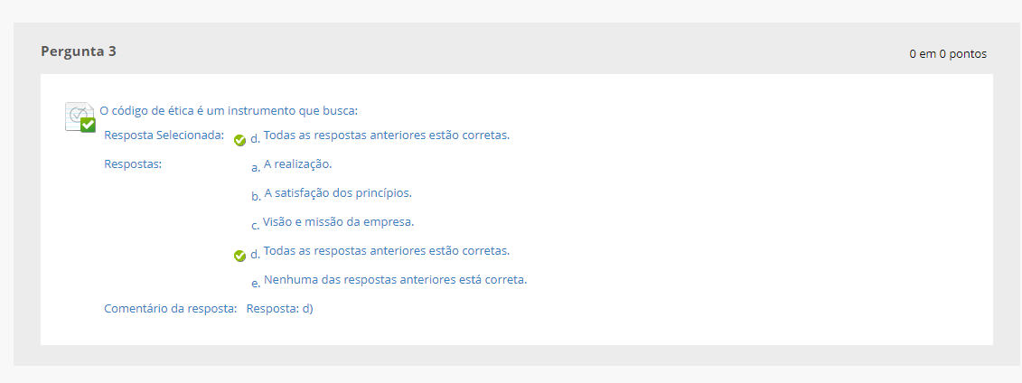Pergunta 3 0 em 0 pontos código de ética é um instrumento que busca: Resposta Selecionada: d. Todas as respostas anteriores estão Respostas: a. A realização. b. A satisfação dos C. Visão e missão da empresa. d. Todas as respostas anteriores estão corretas. e. Nenhuma das respostas anteriores está correta. Comentário da resposta: Resposta: d)