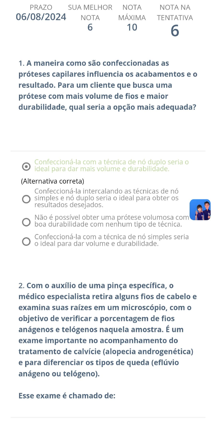 PRAZO 06/08/2024 SUA MELHOR NOTA 6 NOTA MÁXIMA 10 NOTA NA TENTATIVA 6 1.A maneiracomo são confeccionadas as próteses capilares influencia os acabamentos eo resultado. Para um cliente que busca uma prótese com mais volume defios e maior durabilidade, qual seria a opção mais adequada? Confeccioná-la com atécnica de nóduplo seriao O jdeal para dar mais volume edurabilidade. (Alternativacorreta) Confeccionála intercalando as técnicas de nó simplese nóduplo seriao ideal para obter os resultados desejados. Nãoé possívelobter uma prótese volumosa com boa durabilidade com nenhum tipo detécnica. Confeccioná-la com a técnica de nósimples seria oideal para dar volume e durabilidade. 2.Com o auxílio deuma pinça específica,o médico especialista retira algunsfiosdecabelo e examina suas raízes em um microscópio, com o objetivo deverificar a porcentagem defios anágenos etelógenos naquela amostra. Éum exame importante no acompanhamentodo tratamento decalvície (alopecia androgenética) e para diferenciar os tipos de queda (eflúvio anágeno ou telógeno). Esse exame échamado de: biópsia de couro cabeludo. O tricograma. (Alternativa correta) O tricometria. O fototricograma digital. 3.Homensemulheres sofrem com problemas de calvície cada vez mais cedo,por diversos motivos,enão somente por fatores genéticos. Com isso, a procura por próteses capilares aumentou muito.Quais são as características das prótesescapilares de silicone? São confeccionadasem micropelede mais ou menos 0,10mm de espessura,não sendo aconselhável lavar. São confeccionadasem silicone com mais ou O menos 0,14mm e apresentam um efeito muito natural, podendo ser lavadasdiariamente. São confeccionadasem micropele de mais ou menos 0,04mm de espessura,podendo ser fixadas com cola ou fita adesiva; têm ótima durabilidade. (Alternativa correta) São confeccionadasem silicone com espessura de mais ou menos 0,12mm,devendoser fixadas Somentecom cola. 4. Os shampoossão produtos cosméticos capilares que têm como função a higienização dosfios,uma vez que a água, por si só,não é capaz de remover toda a sujidade eoleosidade do cabelo. Em relaçãoaos shampoos, assinale a alternativa correta. Os surfactantes, presentesno shampoo, atuam reduzindo a tensão superficial eremovendoa sujidadee a oleosidadedos fios que aágua não Consegue remover sozinha. (Alternativa correta) Os surfactantes catiônicos são os ingredientes que proporcionam a maior potencialidade de higiene dos cabelos. Quantomais alcalino forum shampoo, maior serásuaação nos fios; o pH não influencia nos danos àhaste capilar, apenas interfere na higienização. Oprincipal ingrediente ativo dos shampoos são OS materiais graxos,responsáveispela limpezae pela remoção da oleosidadedos fios. 5.Toda pessoa que opta por utilizar uma prótese capilar passa por períodos deadaptação, atése acostumar a cuidar, pentear eaté mesmo lavar a peça. Ricardo já estava utilizando a prótese e estava bem adaptado ao método defixação que escolheu.Porém ele retornou dois meses depois da colocação se queixando de mau cheiroe coceira no couro cabeludo. Por que isso pode ter acontecido? Ele ultrapassou otempo de manutenção, o que resultou em fungos. (Alternativa correta) O Acoceira e o mau cheiro são normais. A micropele éde máqualidade,por isso o mau cheiro. A prótese de silicone não deve ser lavada, por �sso ocorreu a COceira. 6.O mercado de cosmética capilar disponibiliza uma sériede produtos destinados aoscuidados diários dos cabelos,considerando a grande importância queestes representam para a autoestima das pessoas. Entretanto, para quecumpram suas funções, ouso deve ser correto. A respeitodo uso de de shampoos, condicionadorese máscaras, assinalea alternativa correta. No uso de máscaras capilares,a aplicação do condicionador não deve ser realizada,üma vez que esses produtos têm os mesmos efeitos nos fios. Oshampoo deve sersempre aplicado primeiramente, uma vez que possui funçãodeO higienização;em seguida,deve ser feita a aplicaçãodo condicionador, com finalidade de hidratação. (Alternativacorreta) Ouso de condicionadores que contenham surfactantes catiónicos dispensa o shampo. O atode esfregar os fiosapós a aplicaç�o do shampoonão interferena higienedo cabelo, O uma vez que aação se dáapenas pelo contato do produto com o cabelo úmido. 7.No mercado de prótese capilar, épossível observar vários modelos confeccionados com diversos materiais. Com relação aosinsumosusados na produção da base de uma prótese, podemos citar: micropele feita em siliconeetela em material O híbrido. siliconecomo materialpara fazer a micropele eoO híbrido. (Alternativa correta) O híbrido para siliconee micropele para tela. O siliconecomo material para fazer a tela. 8.Sob a açãode uma enzima,a 5-alfa-redutase, a testosterona transforma-se em diidrotestosterona (DHT), hormônio responsável pelo afinamentodoscabelos e pela diminuição progressiva dosfolículos, que têm seu ciclo de vida normal encurtado. O resultado final éa calvície. Oresultado desses fenômenos é a queda continuada dos cabelos,levando àrarefação e ao afastamentoda linha de implantação para trás. A progressão do quadro leva àcalvície, caracterizada pela ausência de cabelo na parte superior efrontal da cabeça, poupando as áreas lateraise posterior. Essas características se aplicam à: O alopecia aerata. O alopecia andrognica. (Alternativa correta) O alopecia universal. Oalopecia. .Osprodutos capilares, quando utilizados corretamente, promovem efeitos como higiene, hidratação etratamentodos fios. Entretanto, paraqueesses efeitos sejam garantidos,é necessários que sejam respeitadas as indicações eascontraindicações de cadaum dos produtos. A respeito dessetema,assinalea alternativa correta. Shampooscom surfactantes catiônicos devem ser O indicados para cabelos secos, uma vez que são menos agressivos. Ouso de shampoos pu