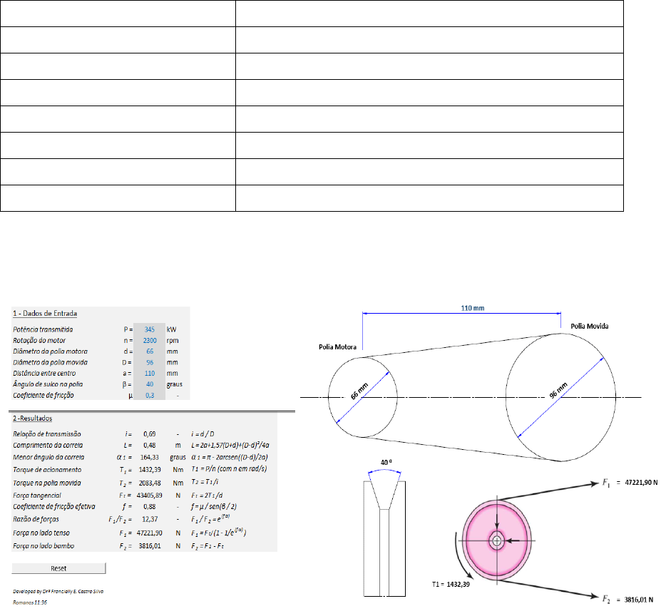 ATIVIDADE PRÁTICA I – PROJETO DE COMPONENTES MECÂNICOS PROJETO DE CORREIAS RAPHAEL APARECIDO XAVIER DE ABREU RU: 3757673 1. ETAPA 1 Parâmetros iniciais Valores utilizados no software e nos cálculos Potência Transmitida (kW) (7+6+7+3) x 15 = 345 Rotação (rpm) (7+6+7+3) x 100 = 2.300 Diâmetro da polia menor (mm) (6+7+3) + 50 = 66 Diâmetro da polia maior (mm) (6+7+3) + 80 = 96 Distância entre centros (mm) (7+3) + 100 = 110 Ângulo do sulco da polia (graus) 40 Coeficiente de fricção/atrito 0,3 2. ETAPA 2 1 - Relação de transmissão: 𝑖 = 𝑑 𝐷 = 66 96 = 0,6875 2 - Comprimento da correia: 𝐿 = 2𝑎 + 1,57 (𝐷 + 𝑑) + (𝐷−𝑑)² 4𝑎 𝐿 = 2.110 + 1,57. (96 + 66) + (96−66)² 4.110 = 476,385 𝑚𝑚 ou 𝐿 = 0,47638 𝑚 3 - Ângulo de abraçamento da polia menor (motora): 𝛼1 = 𝜋 − 2𝑎𝑟𝑐𝑠𝑒𝑛 ( 𝐷−𝑑 2𝑎 ) (𝑟𝑎𝑑): 𝛼1 = 𝜋 − 2𝑎𝑟𝑐𝑠𝑒𝑛 ( 96−66 2.110 ) = 2,8680 𝑟𝑎𝑑 que vezes ( 180 𝜋 ) é igual a 𝜶𝟏 = 164,325° 4 - Torque de acionamento: 𝑇1 = 𝑃 𝑛 = 345.103 ( 2300.2𝜋 60 ) = 1.432,3944 𝑁m 5 - Torque na polia movida: 𝑇2 = 𝑇1 𝑖 = 1432,3944 0,6875 = 2.083,482 𝑁m 6 - Força tangencial: 𝐹𝑡 = 2𝑇1 𝑑 = 2.1432,3944 66.10−3 = 43.405,890 𝑁 ou 𝐹𝑡 = 43,406 𝑘𝑁 7 - Coeficiente de fricção efetiva: 𝑓 = 𝜇 sen( 𝛽 2 ) = 0,3 sen( 40 2 ) = 0,87714 8 - Razão de forças: 𝐹1 𝐹2 = 𝑒(𝑓𝑎1) = 𝑒(0,87714.2,8680) = 12,3744 9 - Força no lado tenso: 𝐹1 = 𝐹𝑡 (1− 1 𝑒(𝑓𝑎1) ) = 43405,890 (1− 1 12,3744 ) = 47.221,993 𝑁 ou 𝐹1 = 47,221 𝑘𝑁 10 - Força no lado bambo: 𝐹2 = 𝐹1 − 𝐹𝑡 = 47221,993 – 43405,890 = 3.816,103 𝑁 ou 𝐹2 = 3,816 𝑘𝑁