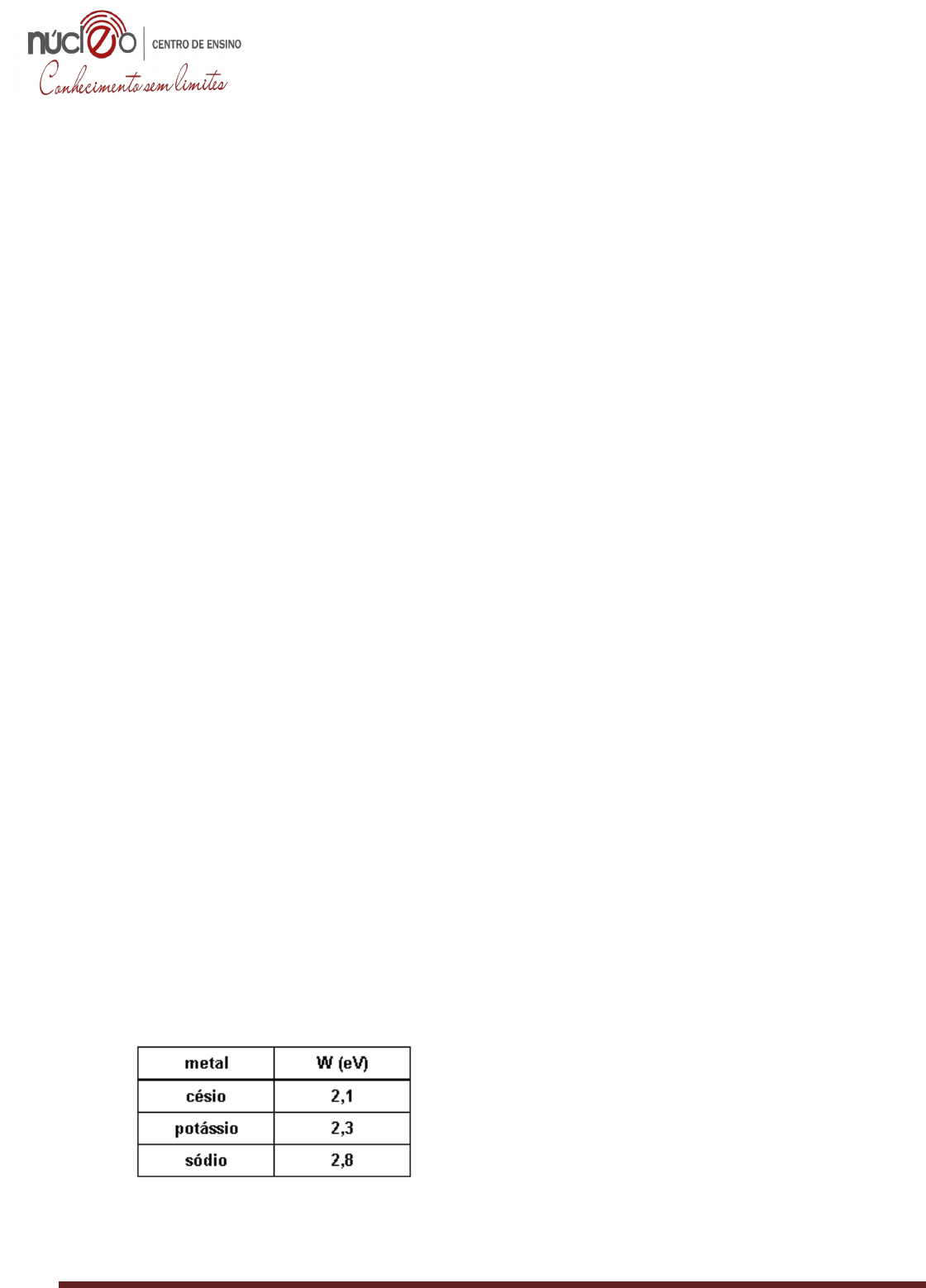 AULA 2 - EFEITO FOTOELÉTRICO 1. A função trabalho de certo metal vale 2,5 eV. a) Verifique se ocorre emissão fotoelétrica quando sobre esse metal incide luz de comprimento de onda 6,0×107m. A constante de Planck é h4,2×1015eV.s e a velocidade da luz no vácuo é c=3,0×108m/s. b) Qual é a frequência mais baixa da luz incidente capaz de arrancar elétrons do metal? 2. Para liberar elétrons da superfície de um metal, é necessário iluminá-lo com luz de comprimento de onda igual ou menor que . Qual o potencial de superfície (também chamado "função trabalho") deste metal, em eV (elétron-volts)? Qual a frequência, em unidades de , necessária para liberar elétrons com energia cinética igual a 3,0 eV? 3. O efeito fotoelétrico, cuja descrição por Albert Einstein está completando 100 anos em 2005 (ano internacional da Física), consiste na emissão de elétrons por um metal no qual incide um feixe de luz. No processo, "pacotes" bem definidos de energia luminosa, chamados fótons, são absorvidos um a um pelos elétrons do metal. O valor da energia de cada fóton é dado por E(fóton) = h.f, onde e V.s é a chamada constante de Planck e f é a frequência da luz incidente. Um elétron só é emitido do interior do metal se a energia do fóton absorvido for maior que uma energia mínima. Para os elétrons mais fracamente ligados ao metal, essa energia mínima é chamada função trabalho (W) e varia de metal para metal (ver a tabela a seguir). Considere c = 300.000 km/s. a) Calcule a energia do fóton (em eV), quando o comprimento de onda da luz incidente for igual a 5.10-7m. b) A luz de 5.10-7m é capaz de arrancar elétrons de quais dos metais apresentados na tabela? c) Qual será a energia cinética de elétrons emitidos pelo potássio, se o comprimento de onda da luz incidente for 3×10-7 m? Considere os elétrons mais fracamente ligados do potássio e que a diferença entre a energia do fóton absorvido e a função trabalho (W) é inteiramente convertida em energia cinética. 4. Considere o texto e as afirmações a seguir. Após inúmeras sugestões e debates, o ano 2005 foi declarado pela ONU o "Ano Mundial da Física". Um dos objetivos dessa designação é comemorar o centenário da publicação dos trabalhos de Albert Einstein, que o projetaram como físico no cenário internacional da época e, posteriormente, trouxeram-lhe fama e reconhecimento. Um dos artigos de Einstein publicado em 1905 era sobre o efeito fotoelétrico, que foi o principal motivo da sua conquista do Prêmio Nobel em 1921. A descrição de Einstein para o efeito fotoelétrico tem origem na quantização da energia proposta por Planck em 1900, o qual considerou a energia eletromagnética irradiada por um corpo negro de forma descontínua, em porções que foram chamadas quanta de energia ou fótons. Einstein deu o passo seguinte admitindo que a energia eletromagnética também se propague de forma descontínua e usou esta hipótese para descrever o efeito fotoelétrico. Em relação ao efeito fotoelétrico numa lâmina metálica, pode-se afirmar que: I. A energia dos elétrons removidos da lâmina metálica pelos fótons não depende do tempo de exposição à luz incidente. II. A energia dos elétrons removidos aumenta com o aumento do comprimento de onda da luz incidente. III. Os fótons incidentes na lâmina metálica, para que removam elétrons da mesma, devem ter uma energia mínima. IV. A energia de cada elétron removido da lâmina metálica é igual à energia do fóton que o removeu. Analisando as afirmativas, conclui-se que somente: a) está correta a afirmativa I. b) está correta a afirmativa IV. c) estão corretas as afirmativas I e III. d) estão corretas as afirmativas II e IV. e) estão corretas as afirmativas III e IV. 5. O efeito fotoelétrico, explorado em sensores, células fotoelétricas e outros detectores eletrônicos de luz, refere-se à capacidade da luz de retirar elétrons da superfície de um metal. Quanto a este efeito, pode-se afirmar que: a) a energia dos elétrons ejetados depende da intensidade da luz incidente. b) a energia dos elétrons ejetados é discreta, correspondendo aos quanta de energia. c) a função trabalho depende do número de elétrons ejetados. d) a velocidade dos elétrons ejetados depende da cor da luz incidente. e) o número de elétrons ejetados depende da cor da luz incidente. 6. Utilizando um controlador, André aumenta a intensidade da luz emitida por uma lâmpada de cor vermelha, sem que esta cor se altere. Com base nessas informações, é CORRETO afirmar que a intensidade da luz aumenta porque a) a frequência da luz emitida pela lâmpada aumenta. b) o comprimento de onda da luz emitida pela lâmpada aumenta. c) a energia de cada fóton emitido pela lâmpada aumenta. d) o número de fótons emitidos pela lâmpada, a cada segundo, aumenta. 7. Considere as seguintes afirmações sobre o efeito fotoelétrico. I - O efeito fotoelétrico consiste na emissão de elétrons por uma superfície metálica atingida por radiação eletromagnética. II - O efeito fotoelétrico pode ser explicado satisfatoriamente com um modelo ondulatório para a luz. III - Uma superfície metálica fotossensível somente emite fotoelétrons quando a frequência da luz incidente nessa superfície excede certo valor mínimo, que depende do metal. Quais estão corretas? a) Apenas I. b) Apenas II. c) Apenas I e II. d) Apenas I e III. e) I, II e III. 8. A intensidade luminosa é a quantidade de energia que a luz transporta por unidade de área transversal à sua direção de propagação e por unidade de tempo. De acordo com Einstein, a luz é constituída por partículas, denominadas fótons, cuja energia é proporcional à sua frequência. Luz monocromática com frequência de 6 x 1014 Hz e intensidade de 0,2 J/m2.s incide perpendicularmente sobre uma superfície de área igual a 1 cm2. Qual o número aproximado de fótons que atinge a superfície em um intervalo 