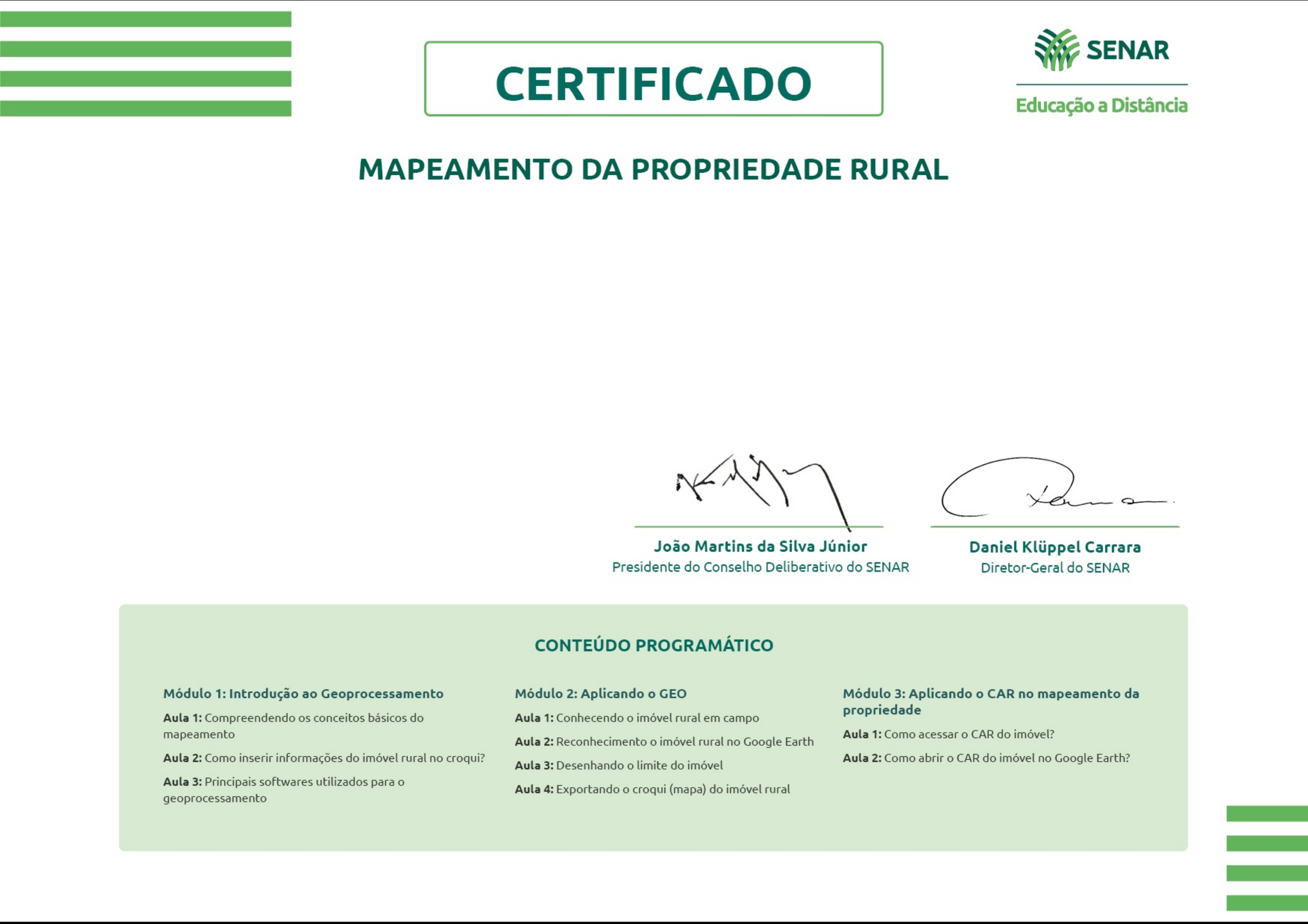 O Serviço Nacional de Aprendizagem Rural - SENAR certifica que Vitor Vidal Oliveira, CPF 13744376621, concluiu o curso à distância Mapeamento da Propriedade Rural, com carga horária de 16 horas, ofertado no Portal de Educação do SENAR no período entre 18/06/2024 e 10/07/2024. Brasília, 01/07/2024. Código de segurança: bfd0539c-081a-42ba-af02-c16c91d85413 Acesse o site: https://senarfic.studionmx.com/external/validate-certificate