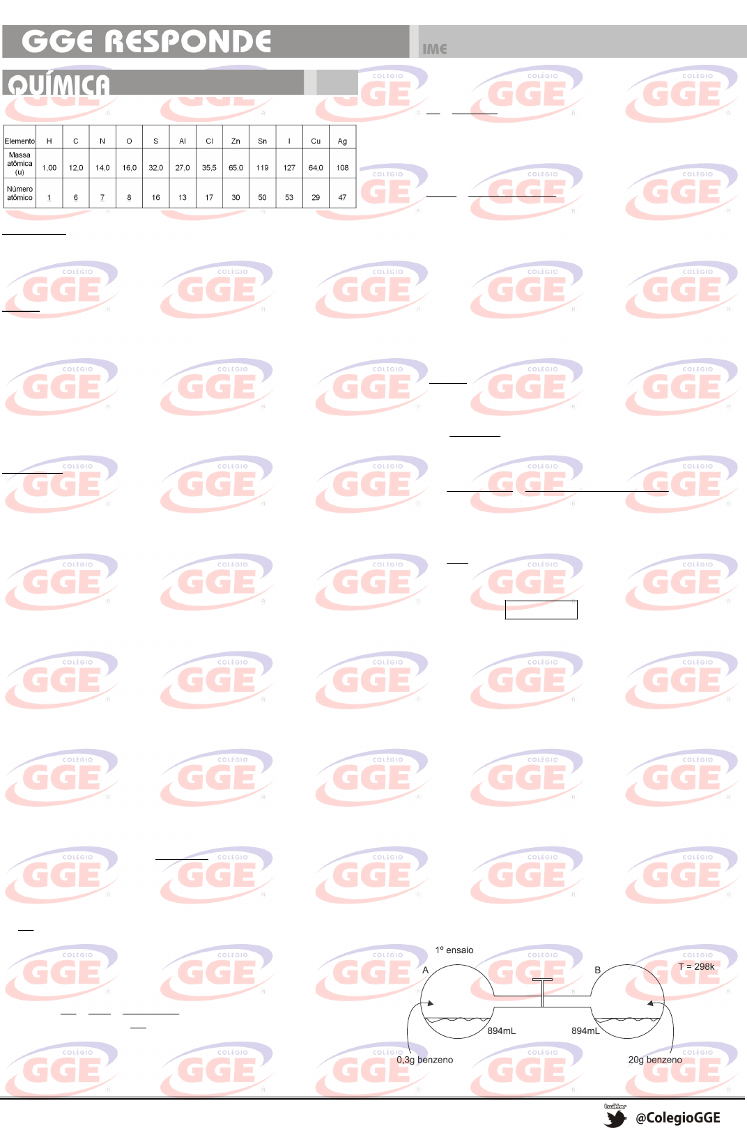 GGE RESPONDE IME 2016 – QUÍMICA Prova Discursiva 1 Informações de Tabela Periódica Constantes: Constante de Faraday: 1 F = 96500 C.mol-1 Constante Universal dos Gases = 0,082 atm·L·K-1·mol-1 = 62,3 mmHg·L·K-1·mol-1 ln 2 = 0,693 ln 1,105 = 0,1 e = 2,72 Dados: Massa específica do estanho = 7000 kg·m-3 Capacidade calorífica média: Cp,CO(g) = 29 J·mol -1·K-1; Cp,CO2(g) = 37 J·mol-1·K-1; Cp,C(s) = 8,5 J·mol -1·K-1 Pressão de vapor do benzeno puro a 298 K: Pvap = 100,0 mmHg Pressão de vapor do tolueno puro a 298 K: Pvap = 30,0 mmHg Entalpia de vaporização da água: HVap = 2260 kJ·kg -1 Entalpia de fusão do gelo: Hfus = 330 kJ·kg -1 Capacidade calorífica específica média da água: CV = 4,2 kJ·kg -1·K-1 Tempo de meia vida: 31H = 12,32 anos; 44 22Ti = 67,00 anos Conversão: T(K) = t (ºC) + 273 01. Em uma célula a combustível, reações de oxidação e redução originam a uma corrente que pode ser aproveitada, por exemplo, para suprir a potência necessária para alimentar um motor elétrico. Considere um sistema formado por uma célula a combustível que utiliza hidrogênio e oxigênio, acoplada ao motor de um veículo elétrico. Sabendo que o sistema opera sem perdas, que a potência do motor é de 30 kW e que o comportamento do gás (H2) é ideal, calcule a pressão em um tanque de 100 L de hidrogênio, mantido a 27ºC, de forma que esse veículo percorra um trajeto de 100 km a uma velocidade média de 90 km/h. Dados a 27°C: H2 (g) → 2 H + (aq) + 2 e- 0,00 V O2 (g) + 4 H + (aq) + 4 e- → 2 H2O (l) 1,23 V Solução: A corrente elétrica que circula no motor é dada por: P E I A diferença de potencial da pilha, por sua vez, é dada por: 2 g aq 22 g aq H 2H 2e E 0,00v E 1,23vO 4H 4e 2H O E 1,23v Sendo assim, calculamos a corrente: PI E Portanto, no tempo de deslocamento do veículo, a carga transferida é dada por: 7S P S 30000 100Q I T I 9,76 10 C90v v E 1,23 3,6 Como 1 mol de H2 perde 2 mols de e-, tem-se: 7 H2 Q 9,76 10n 505,5mol 2F 2 96500 Sendo assim, a pressão no compartimento pode ser calculada pela equação de Clapeyron: H2 H2 n RT 505,5 0,082 300P 124,4 atm V 100 02. O sulfato cúprico anidro é obtido a partir da reação de uma solução aquosa de ácido sulfúrico 98% (em massa), a quente, com cobre. Sabendo que a solução aquosa de ácido sulfúrico tem massa específica 1,84 g/cm3 e que o ácido sulfúrico é o reagente limitante, calcule a massa de sulfato cúprico obtida a partir da reação de 10,87 ml da solução aquosa de ácido sulfúrico. Solução: (s) 2 4(conc) 4(aq) 2 2(g)1Cu H SO 1CuSO 1S0 2H O H SO2 4 Cu n n 2 (I) H SO H SO2 4 2 4n M V (II) H SO2 4 H SO2 4 d 1000M M (III) (III) em (II): 3 H SO2 4 H SO2 4 d 1000 V 0,98 1,84 1000 10,87 10n M 98 H SO2 4n 0,2 mol (IV) (IV) em (I): H SO2 4 CuSO CuSO CuSO4 4 4 CuSO CuSO4 4 0,2n 0,1mol 2 m n M m 0,1 160 m 16g 03. Considere um dispositivo constituído por dois balões de vidro, “A” e “B”, cada um com capacidade de 894 mL, interligados por um tubo de volume interno desprezível, munido de uma torneira. Dois ensaios independentes foram realizados a 298 K. No primeiro ensaio, os balões foram inicialmente evacuados e, logo a seguir, com a torneira fechada, foram introduzidos 0,30 g de benzeno e 20,0 g de tolueno em “A” e “B”, respectivamente, de modo que não houvesse contato entre as duas substâncias. No segundo ensaio, os balões foram novamente evacuados e, na sequência, uma quantidade de benzeno foi introduzida em “A” e outra quantidade de tolueno foi introduzida em “B”. Considerando o comportamento ideal para os gases e para as misturas, atenda aos seguintes pedidos: a) determine a pressão em cada balão, no primeiro ensaio, após o sistema ter atingido o equilíbrio; b) uma vez aberta a torneira no segundo ensaio, calcule as frações molares de benzeno e tolueno na fase gasosa no interior dos balões no momento em que o equilíbrio líquido-vapor é atingido. Um manômetro acoplado ao dispositivo indica, nesse momento, uma pressão interna de 76,2 mmHg. Solução: GGE RESPONDE IME 2016 – QUÍMICA Prova Discursiva 2 M(benzeno) = 78g/mol M(tolueno) = 92g/mol - Calculando o número de Mols benz tol 0,3n 78 20n 92 - Considerando o comportamento ideal dos gases e que ocorreu evaporação total n R TPV n R T P V benzbenz benz benz n R T 0,3 62,3 2 298P P P 79,9mmHg V 78 0,894 toltol tol tol n R T 20 62,3 2 298P P P 4515mmHg V 92 0,894 b) Considere: x → Fração molar na fase líquida y → Fração molar na fase gasosa Pela lei de Raoult, temos: 0 BENZ BENZ BENZ BENZ BENT 0 TOL TOL TOL TOL TOL P P X P 100 X P P X P 30 X Pela lei das pressões parciais de Dalton: BENZ T BENZ BENZ BENZ TOL T TOL TOL TOL P P Y P 76,2 Y P P Y P 76,2 Y Assim: T BENZ TOL BENZ TOL BENZ BENZ BENZ BENZ TOL BENZ TOL P P P 76,2 100 X 30 X 76,2 3076,2 100 X 30(1 X ) X 70 X 0,66 X 1 X X 0,37 BENZ BENZ BENZ BENZ TOL BENZ TOL P 100 0,66 P 66mmHg 66 76,2 Y Y 0,866 Y 1 Y Y 0,134 04. O trítio é produzido na atmosfera por ação de raios cósmicos. Ao combinar-se com o oxigênio e o hidrogênio, precipita-se sob a forma de chuva. Uma vez que a incidência de raios cósmicos varia com a região da Terra, as águas pluviais de regiões diferentes terão diferentes concentrações de trítio. Os dados abaixo correspondem às concentrações de trítio (expressas em número de desintegrações por minuto por litro) em águas pluviais de diferentes regiões do Brasil: Estação pluviométrica Desintegrações do trítio Manaus 11,5 Belém 9,0 Vale do São Francisco 6,0 São Joaquim 16,0 Serra Gaúcha 25,0 Um antigo lote de garrafas de vinho foi encontrado sem rótulos, mas com a data de envasamento na rolha, conferindo ao vinho uma idade de 16 anos. Uma medida atual da concentração de trítio neste vinho indicou 6, Considerando que a concentração de trítio no momento do envasamento do vinho é igual à das águas pluviais de sua região produtora, identifique o local de procedência deste