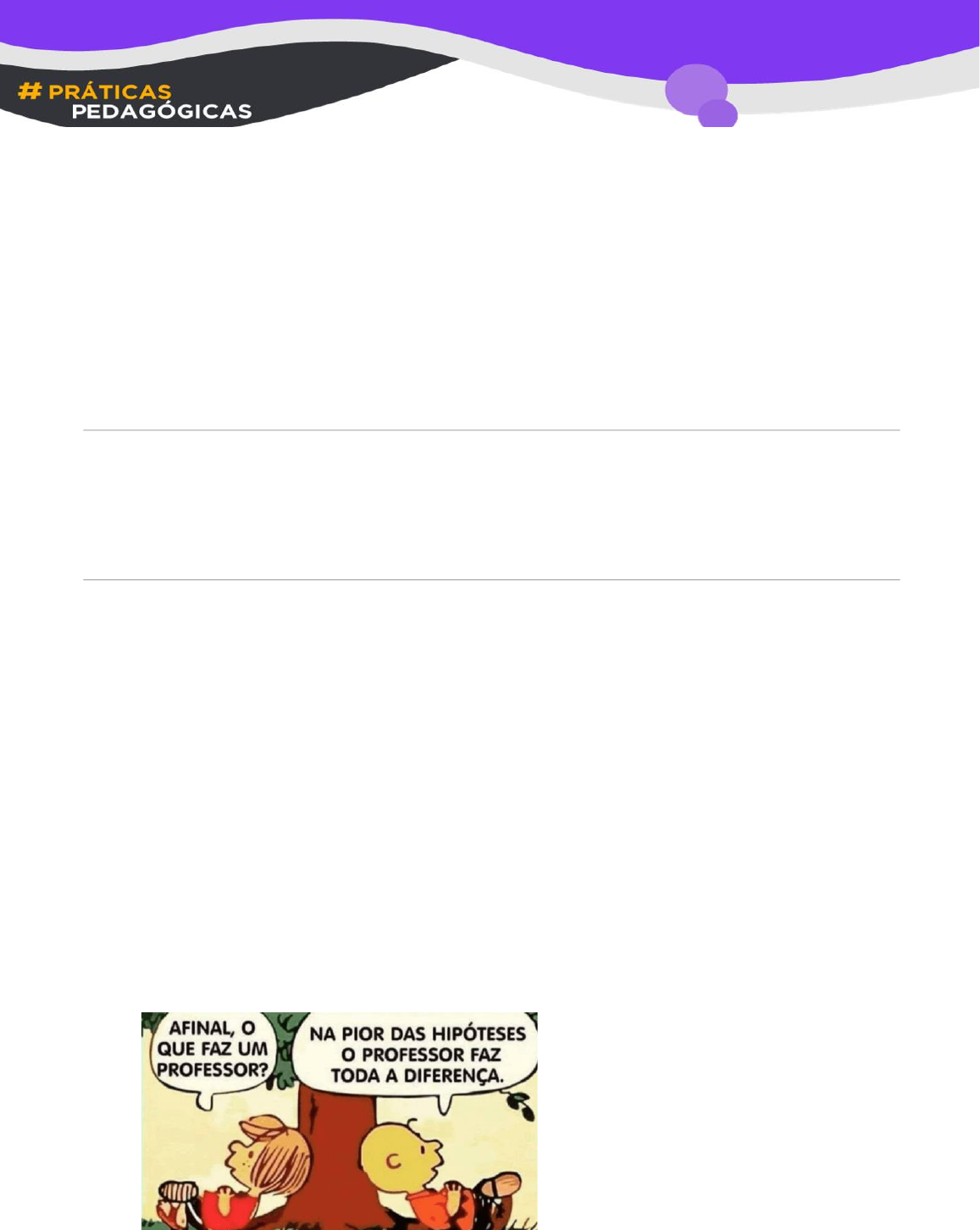 ATV ATIVIDADE PRÁTICA PRÁTICAS PEDAGÓGICAS: IDENTIDADE DOCENTE Olá, estudante! Neste momento, você realizará uma atividade prática relacionada a uma reflexão da atuação do professor. Objetivo Refletir sobre a importância da prática do professor e a construção da identidade docente. Situação-problema Imagine que você é um professor dedicado, imerso na dinâmica desafiadora da educação básica contemporânea. Diante de uma diversidade crescente de alunos, oriundos de diferentes contextos culturais e socioeconômicos, você se vê diante de um complexo desafio: a conciliação entre a preservação dos valores tradicionais e a necessidade de adaptação às demandas contemporâneas. A busca por uma identidade docente autêntica, que respeite a diversidade cultural dos alunos, integre tecnologias emergentes e promova práticas pedagógicas inovadoras, torna-se um dilema para muitos educadores. Como construir uma identidade que preserve a essência do papel do educador, ao mesmo tempo que abraça a evolução constante do cenário educacional? A reflexão sobre este desafio torna-se crucial para promover uma prática docente que seja tanto enraizada em valores fundamentais quanto capaz de inspirar e capacitar os estudantes para os desafios complexos do mundo contemporâneo. Passo 1 Para elaborar a atividade, você precisará: 1. Refeltir sobre a charge, a seguir: Disponivel em: https://blogs.correiobraziliense.com.br/aricunha/profissao-professor/ 2. Ler os textos propostos: ATV ATIVIDADE PRÁTICA Texto 1: DA SILVA, E. P.; CHAKUR, C. R. de S. L. A Tomada de Consciência da Crise de Identidade Profissional em Professores do Ensino Fundamental 1. Schème: Revista Eletrônica de Psicologia e Epistemologia Genéticas, 2009. Disponível em: https://www.marilia.unesp.br/Home/RevistasEletronicas/Scheme/Vol02Num03Art05.pdf. Acesso em: 12 de Dez. 2023. Texto2: LOMBA, Maria Lúcia Resende; FARIA FILHO, Luciano Mendes. Os professores e sua formação profissional: entrevista com António Nóvoa. Educar em Revista, [S.l.], dez. 2022. ISSN 1984-0411. Disponível em: https://revistas.ufpr.br/educar/article/view/88222/48158 . Acesso em: 12 dez. 2023. Passo 2: Elaboração do trabalho para postagem no AVA, contendo: 1) Capa da Instituição, conforme orientação disponível na biblioteca virtual. 2) Desenvolvimento: Texto dissertativo contendo uma análise crítica dos textos 1 e 2, elencados no passo 1, que contemplam a construção da identidade docente na contemporaneidade. A análise crítica compreende uma avaliação clara e fundamentada da validade de uma assertiva por meio da análise dos argumentos que a sustentam. Uma avaliação fundamentada incorpora elementos presentes no texto desenvolvido e recorre a conhecimentos externos bastante aceitos ou demonstrados no próprio texto. 3) Considerações finais: para a finalização do texto, você deve retomar a pergunta da charge presente no passo 1, apresentando seu posicionamento sobre o tema Identidade Docente. NORMAS PARA ENTREGA DA ATIVIDADE PRÁTICA Você deverá postar seu trabalho final no AVA, na pasta específica relacionada à atividade prática, obedecendo o prazo limite de postagem, conforme disposto no AVA. • O trabalho deve ser enviado em formato Word ou PDF, em um ARQUIVO ÚNICO de até 10 MB. • O sistema permite anexar apenas um arquivo. Caso haja mais de uma postagem, será considerada a última versão. IMPORTANTE: • A entrega da atividade, de acordo com a proposta solicitada, é um critério de aprovação na disciplina. • Não há prorrogação para a postagem da atividade. Aproveite essa oportunidade para aprofundar ainda mais seus conhecimentos. Bons estudos!