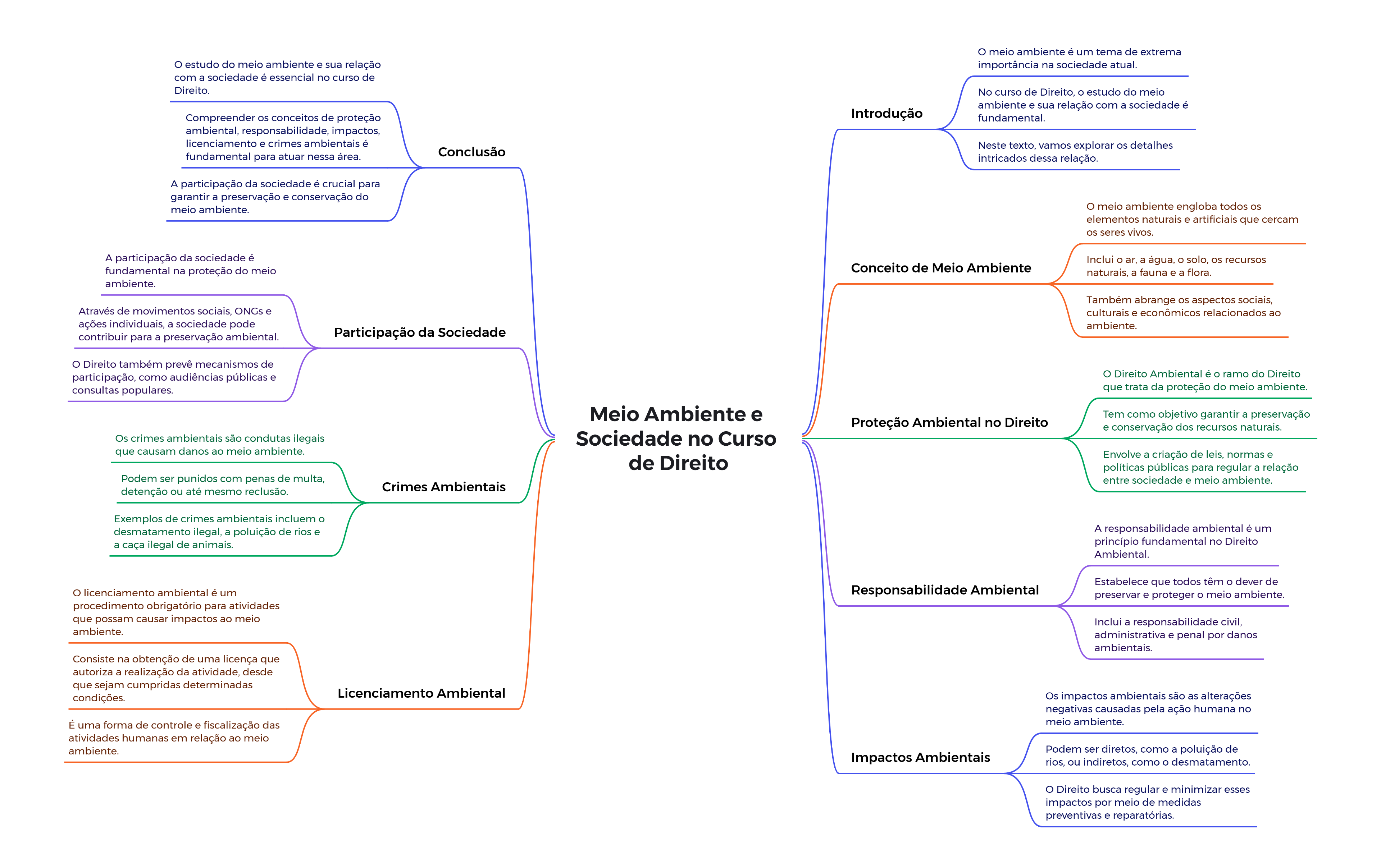 Meio Ambiente e Sociedade no Curso de Direito Introdução O meio ambiente é um tema de extrema importância na sociedade atual. No curso de Direito, o estudo do meio ambiente e sua relação com a sociedade é fundamental. Neste texto, vamos explorar os detalhes intricados dessa relação. Conceito de Meio Ambiente O meio ambiente engloba todos os elementos naturais e artificiais que cercam os seres vivos. Inclui o ar, a água, o solo, os recursos naturais, a fauna e a flora. Também abrange os aspectos sociais, culturais e econômicos relacionados ao ambiente. Proteção Ambiental no Direito O Direito Ambiental é o ramo do Direito que trata da proteção do meio ambiente. Tem como objetivo garantir a preservação e conservação dos recursos naturais. Envolve a criação de leis, normas e políticas públicas para regular a relação entre sociedade e meio ambiente. Responsabilidade Ambiental A responsabilidade ambiental é um princípio fundamental no Direito Ambiental. Estabelece que todos têm o dever de preservar e proteger o meio ambiente. Inclui a responsabilidade civil, administrativa e penal por danos ambientais. Impactos Ambientais Os impactos ambientais são as alterações negativas causadas pela ação humana no meio ambiente. Podem ser diretos, como a poluição de rios, ou indiretos, como o desmatamento. O Direito busca regular e minimizar esses impactos por meio de medidas preventivas e reparatórias. Licenciamento Ambiental O licenciamento ambiental é um procedimento obrigatório para atividades que possam causar impactos ao meio ambiente. Consiste na obtenção de uma licença que autoriza a realização da atividade, desde que sejam cumpridas determinadas condições. É uma forma de controle e fiscalização das atividades humanas em relação ao meio ambiente. Crimes Ambientais Os crimes ambientais são condutas ilegais que causam danos ao meio ambiente. Podem ser punidos com penas de multa, detenção ou até mesmo reclusão. Exemplos de crimes ambientais incluem o desmatamento ilegal, a poluição de rios e a caça ilegal de animais. Participação da Sociedade A participação da sociedade é fundamental na proteção do meio ambiente. Através de movimentos sociais, ONGs e ações individuais, a sociedade pode contribuir para a preservação ambiental. O Direito também prevê mecanismos de participação, como audiências públicas e consultas populares. Conclusão O estudo do meio ambiente e sua relação com a sociedade é essencial no curso de Direito. Compreender os conceitos de proteção ambiental, responsabilidade, impactos, licenciamento e crimes ambientais é fundamental para atuar nessa área. A participação da sociedade é crucial para garantir a preservação e conservação do meio ambiente.