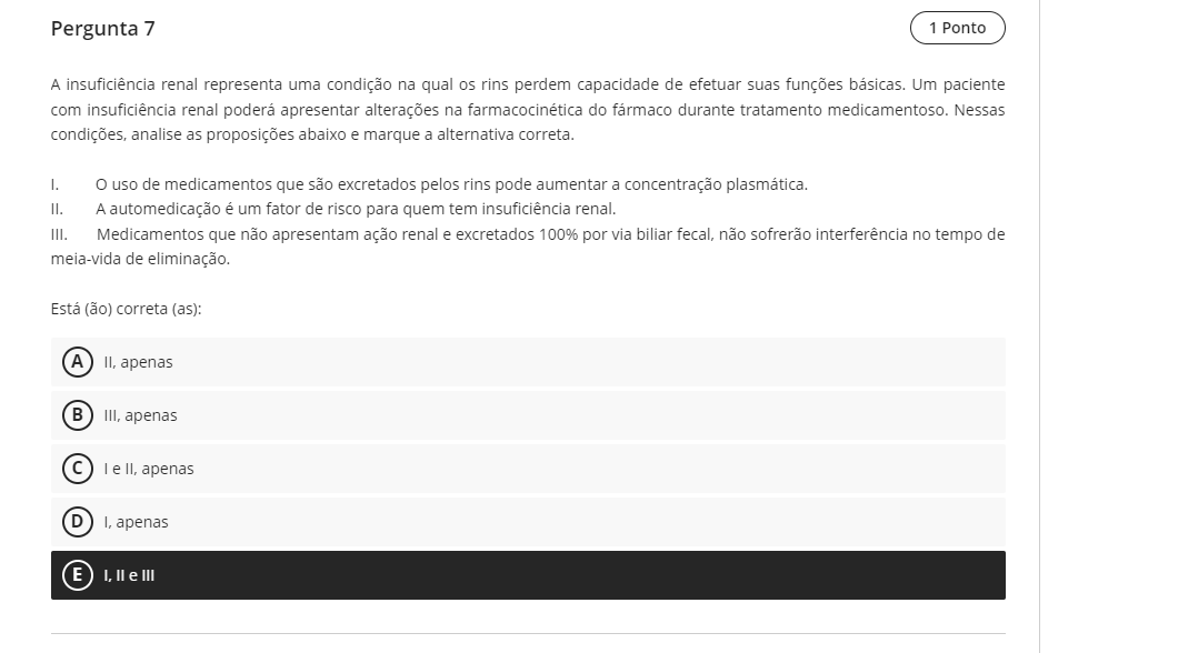 Pergunta 7 1 Ponto A insuficiência renal representa uma condição na qual os rins perdem capacidade de efetuar suas funções Um paciente com insuficiência renal poderá apresentar alterações na farmacocinética do fármaco durante tratamento medicamentoso. Nessas condições, analise as proposições abaixo e marque a alternativa correta. I. uso de medicamentos que são excretados pelos rins pode aumentar a concentração plasmática. II. A automedicação é um fator de risco para quem tem insuficiência renal. III. Medicamentos que não apresentam ação renal e excretados 100% por via fecal, não sofrerão interferência no tempo de meia-vida de eliminação. Está (ão) correta (as): A II, apenas B III, apenas C e II, apenas D I, apenas E I, II e III