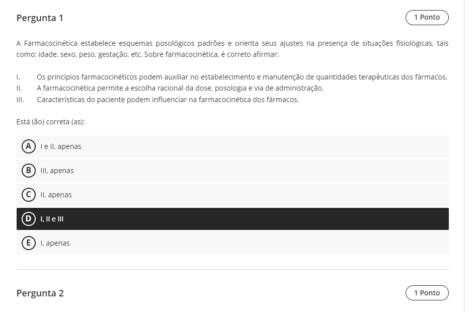 Pergunta 1 1 Ponto A Farmacocinética estabelece esquemas posológicos padrões e orienta seus ajustes na presença de situações fisiológicas, tais como: idade, sexo. peso, gestação, etc. Sobre farmacocinética, é correto Os princípios farmacocinéticos podem auxiliar no estabelecimento e manutenção de quantidades terapêuticas dos II. A farmacocinética permite a escolha racional da dose, posologia e via de administração. III. Características do paciente podem influenciar na farmacocinética dos Está (ão) correta (as): A le II, apenas B III, apenas C II, apenas D I, II e III E I, apenas Pergunta 2 1 Ponto