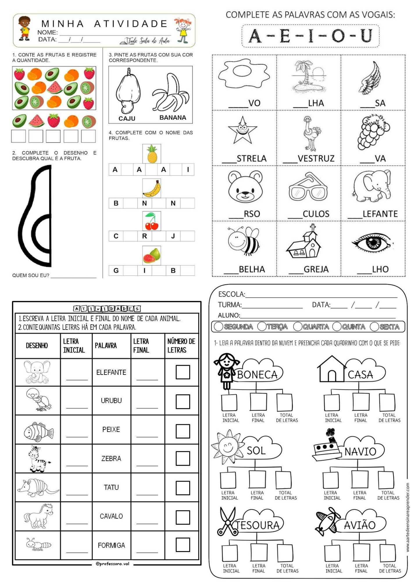 COMPLETE AS PALAVRAS COM AS VOGAIS: MINHA ATIVIDADE NOME: DATA: / / do A-E-I-O-U 1. CONTE AS FRUTAS E REGISTRE 3. PINTE AS FRUTAS COM SUA COR A CORRESPONDENTE VO LHA SA CAJU BANANA 4. COMPLETE COM NOME DAS 2. COMPLETE o DESENHO E DESCUBRA QUAL E A STRELA VESTRUZ VA A AA B N N RSO CULOS LEFANTE C R J G B BELHA GREJA LHO QUEM SOU EU? ESCOLA: TURMA: DATA: / / A D 1.ESCREVA A LETRA INICIAL E FINAL DO NOME DE CADA ANIMAL. ALUNO: 2. CONTE QUANTAS LETRAS HÁ EM CADA PALAVRA. SEGUNDA TERCA QUARTA QUINTA SEXTA LETRA LETRA NÚMERO DE DESENHO PALAVRA 1- LEIA A PALAVRA DENTRO DA NUVEM F PREENCHA CADA QUADRINHO COM 0 QUE SE PEDE: INICIAL FINAL LETRAS ELEFANTE BONECA CASA URUBU LETRA LETRA TOTAL LETRA LETRA TOTAL INICIAL FINAL DE LETRAS INICIAL FINAL DE LETRAS PEIXE SOL NAVIO ZEBRA TATU LETRA LETRA TOTAL LETRA LETRA TOTAL INICIAL FINAL DE LETRAS INICIAL FINAL DE LETRAS CAVALO TESOURA AVIAO FORMIGA LETRA LETRA TOTAL LETRA LETRA TOTAL INICIAL FINAL DE LETRAS INICIAL FINAL DE LETRAS