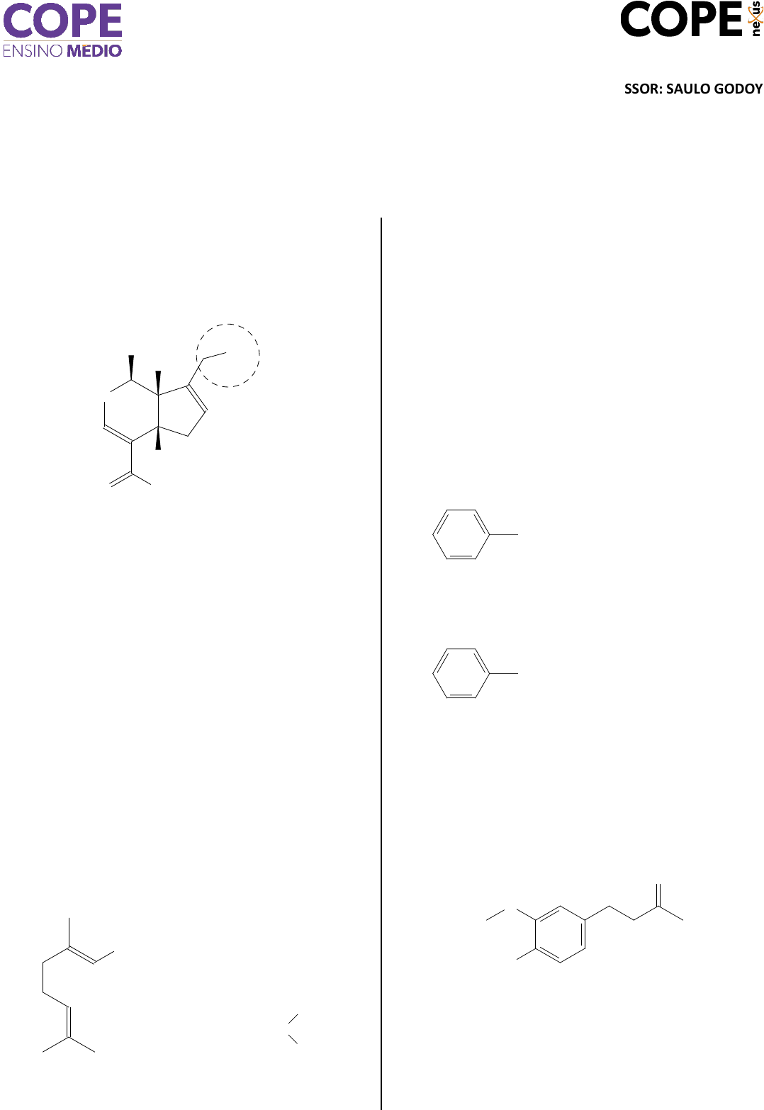 LISTA DE EXERCÍCIOS PROFESSOR: SAULO GODOY Aluno (a): _______________________________________________________________________________________________________ 2ª SÉRIE FUNÇÕES ORGÂNICAS 01 - (UFSCAR SP) Uma das formas de se obter tinta para pintura corporal utilizada por indígenas brasileiros é por meio do fruto verde do jenipapo. A substância responsável pela cor azul intensa dessa tinta é a genipina, cuja estrutura está representada a seguir. O OH O OCH3 OH H H Genipina A estrutura assinalada mostra que a genipina possui, entre outras, a função orgânica a) aldeído. b) álcool. c) cetona. d) ácido carboxílico. e) éter. 02 - (ENEM) Uma forma de organização de um sistema biológico é a presença de sinais diversos utilizados pelos indivíduos para se comunicarem. No caso das abelhas da espécie Apis mellifera, os sinais utilizados podem ser feromônios. Para saírem e voltarem de suas colmeias, usam um feromônio que indica a trilha percorrida por elas (Composto A). Quando pressentem o perigo, expelem um feromônio de alarme (Composto B), que serve de sinal para um combate coletivo. O que diferencia cada um desses sinais utilizados pelas abelhas são as estruturas e funções orgânicas dos feromônios. CH2OH Composto A CH3COO(CH2)CH CH3 CH3 Composto B As funções orgânicas que caracterizam os feromônios de trilha e de alarme são, respectivamente, a) álcool e éster. b) aldeído e cetona. c) éter e hidrocarboneto. d) enol e ácido carboxílico. e) ácido carboxílico e amida. 03 - (Mackenzie SP) Um professor solicitou aos alunos que escrevessem uma sequência de compostos orgânicos, que contivesse, respectivamente, um álcool, um éster, uma cetona e um aldeído. A sequência correta está representada em a) H3C–OH, H3C–O–CH3, H3C–CH2–COO–CH3, H3C–CHO. b) OH, H3C–CH2–COO–CH2–CH3, H3C– CO–CH3, H3C–CHO. c) H3C–CHO, H3C–CO–CH3, HCOOH, H3C–OH. d) H3C–CHO, H3C–COO–CH3, H3C–CO–NH2, H3C–CH2– COO–CH3. e) CH2–OH, H3C–COO–CH3, H3C–CO–CH3, H3C–CHO. 04 - (FCM PB) O gengibre é uma raiz tuberosa que apresenta diferentes ações terapêuticas: bactericida, desintoxicante e ainda melhora o desempenho do sistema digestivo, respiratório e circulatório. A gingerona, estrutura abaixo, é umas das substâncias orgânicas que podem ser extraídas do gengibre. O HO O Sobre a molécula acima, são feitas as afirmações. I. Apresenta anel aromático e heteroátomo. II. O carbono carbonílico apresenta número de oxidação igual a +2. III. Apresenta as funções orgânicas éter, álcool e cetona. Química LAIS Linha LAIS Linha LAIS Linha LAIS Linha LAIS Linha LAIS Linha LAIS Linha LAIS Linha LAIS Linha LAIS Linha É correto o que se afirmar: a) apenas em II e III. b) apenas em I e II. c) apenas em I e III. d) em I, II e III. e) apenas em III. 05 - (UFSCAR SP) O chá de folhas de boldo do Brasil, também chamado de boldo nacional, é usado em todos os estados do Brasil como medicação para tratamento dos males do fígado e de problemas da digestão. A fórmula estrutural representada a seguir é da substância química chamada barbatusol, um dos princípios ativos encontrados nas folhas de boldo nacional. HO OH De acordo com a fórmula estrutural, o barbatusol apresenta grupo funcional característico de a) fenóis. b) éteres. c) álcoois. d) ésteres. e) aldeídos. 06 - (IME RJ) A eritromicina é uma substância antibacteriana do grupo dos macrolídeos muito utilizada no tratamento de diversas infecções. Dada a estrutura da eritromicina abaixo, assinale a alternativa que corresponde às funções orgânicas presentes. a) Álcool, nitrila, amida, ácido carboxílico. b) Álcool, cetona, éter, aldeído, amina. c) Amina, éter, éster, ácido carboxílico, álcool. d) Éter, éster, cetona, amina, álcool. e) Aldeído, éster, cetona, amida, éter. 07 - (UFJF MG) A seguir, está representada a estrutura química do ácido Jiadifenoico C, um potente antiviral de origem terpênica. OH CH3C O HO ácido Jiadifenoico C Sobre a estrutura do ácido Jiadifenoico C, são feitas as seguintes afirmações: I. notam-se nove átomos de carbonos com hibridização sp2. II. as funções orgânicas oxigenadas presentes são álcool e éster. III. o composto possui cinco átomos de carbono quaternário. IV. sua fórmula molecular é C20H26O3. Assinale a alternativa CORRETA. a) Apenas as afirmações I, II e IV são verdadeiras. b) Apenas as afirmações I e IV são verdadeiras. c) Apenas as afirmações I e III são verdadeiras. d) Apenas as afirmações II, III e IV são verdadeiras. e) Apenas as afirmações I e II são verdadeiras. 08 - (Unievangélica GO) Leia o texto a seguir. Acreditem: é tudo natural Advogada paulistana de 51 anos torna-se a representante do Brasil em uma associação internacional de “fisiculturistas naturais”, que rejeita o uso de anabolizantes. Uma exceção raríssima no meio. Veja. Ed. 2360. Ano 47. 12 fev. 2014. p. 15. Os esteróides anabolizantes são drogas relacionadas ao hormônio masculino testosterona. São todos derivados do colesterol. A testosterona tem como funções orgânicas a) a cetona e o fenol; sua fórmula molecular é igual a C18 H30 O, a massa molecular é 262 g/mol, apresenta duas ligações do tipo pi e as demais são ligações sigma. b) a cetona e o éter; sua fórmula molecular é igual a C20H28O2, a massa molecular é 300 g/mol, apresenta duas ligações do tipo sigma e as demais são ligações pi. c) o álcool e a cetona; sua fórmula molecular é igual a C19H28O2, a massa molecular é 288 g/mol, duas ligações são do tipo pi e as demais do tipo sigma. d) o álcool e o aldeído; sua fórmula molecular é igual a C19 H28 O2 , a massa molecular é 288 g/mol, todas a ligações presentes são do tipo sigma. 09 - (ENEM) A baunilha é uma espécie de orquídea. A partir de sua flor, é produzida a vanilina (conforme representação química), que dá origem ao aroma de bauni