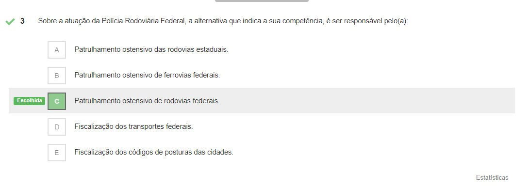 3 Sobre a atuação da Polícia Rodoviária Federal, a alternativa que indica a sua competência, é ser responsável pelo(a): A Patrulhamento ostensivo das rodovias estaduais. B Patrulhamento ostensivo de ferrovias Escolhida C Patrulhamento ostensivo de rodovias federais. D Fiscalização dos transportes federais. E Fiscalização dos códigos de posturas das Estatísticas