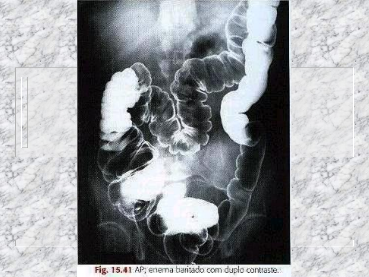 ENEMA OPACO MATEUS ELIAS ENEMA OPACO É um exame contrastado utilizado para estudar radiologicamente a forma e função do intestino grosso, bem como detectar quaisquer condições anormais. Via RETAL Esse exame pode ser com simples ou duplo contraste. Simples = injeção de bário via retal do paciente. Duplo = é injetado ar junto com bário DUPLO E SIMPLES CONTRASTE ENEMA OPACO INTRODUÇÃO DA SONDA RETAL. ENEMA OPACO ESSE É UM EXAME EXTREMAMENTE DELICADO, É SEMPRE BOM RESALTAR TUDO O QUE ESTÁ ACONTECENDO E VAI ACONTECER AO PACIENTE. INTESTINO GROSSO Constitui a parte final do sistema digestivo, sendo mais calibroso e mais curto que o intestino delgado. O intestino grosso se subdivide nos seguintes segmentos: cécum, cólon ascendente, colo transverso, cólon descendente, cólon segmóide e reto. INTESTINO GROSSO CECUM ASCEND TRANSVERSO DESCEN RETO SIGM VARIAÇÕES ANATÔMICAS Existem algumas variações que é necessário conhecer para maior segurança do exame radiográfico. VARIAÇÕES ANATÔMICAS VARIAÇÕES ANATÔMICAS INDICAÇÕES CLÍNICAS Esse exame rotineiramente avalia: colite; neoplasias; diverticulose, diverticulite; volvo; Entre outras CONTRA INDICAÇÕES Em caso de perfuração do intestino. Em caso de cirurgias recentes. E é claro em alguns casos podem existir reações ao contraste.(quando feito com iodo) Câncer em estado delicado. PREPARO DO PACIENTE É necessário limpeza total da porção intestinal do paciente. Durante as 24hs que antecedem o exame a alimentação deve ser a base de líquidos. Deve ser aconselhado a tomar laxantes para facilitar a limpeza do intestino, fazer lavagem intestinal para total limpeza do intestino grosso o médico deve sugerir um medicamento para secar a mucosa do intestino. ENEMA OPACO Ou enema baritado como também é conhecido necessita de alguns materiais especiais para sua realização: sulfato de bário; água filtrada; soro fisiológico; sonda retal;(adulto e infantil) luvas ; gazes; insuflador de ar; pomada anestésica; avental; MATERIAIS ENEMA OPACO Existe uma posição adequada para a introdução do cateter no ânus do paciente, chamada posição de SIMS. Ou posicionar de maneira mais confortável para o paciente, ou melhor ajuste da sonda INTRODUÇÃO DO CATETER CATETER INTRODUZIDO NO PACIENTE INSUFLAÇÃO DE BÁRIO NO PACIENTE RETIRADA DO CATÉTER ENEMA OPACO São realizados 7 radiografias com incidências básicas e 2 especiais BÁSICAS = PA e ou AP, OAD, OAE, Reto lateral, DLD e E, PA pós evacuação. ESPECIAIS = AP ou OPE axial, PA ou OAD axial , a variação com relação ao KV, pode variar de acordo com o aparelho. INCIDÊNCIA PA/AP Paciente em DD ou DV, alinhar o plano médio sagital com a linha média da mesa, usar o filme 35x43cm, o raio central deve incidir na altura da crista ilíaca na distancia de 100cm REALIZAÇÃO DO EXAME INCIDÊNCIA OAD O paciente deve estar em semidecúbito ventral rodado em OAD em 35º a 45º, podendo apoiar a cabeça em um travesseiro. Posicionar a linha média do corpo com a linha mediana da mesa com as margens eqüidistantes com linha central da mesa. Deixar o braço acima da cabeça e o joelho parcialmente fletido para dar apoio e maior conforto ao paciente. O filme usado 35x43. INCIDÊNCIA OAD O raio central deve incidir perpendicular ao filme aproximadamente 2,5cm á esquerda do plano médiossagital, e ao nível das cristas ilíacas.deve-se expor na expiração. INCIDÊNCIA OAE Realizar idêntica a incidência OAD porém para a esquerda. Respeitando o raio central que deve incidir 2,5 a 5 cm acima da crista ilíaca. INCIDÊNCIA OPE e OPD Tamanho do filme usado é o 35x43cm , o paciente deve estar em semidecúbito dorsal, rodada em posição oblíqua posterior direita ou esquerda em 35º á 45º, podendo oferecer um travesseiro para o paciente para melhor conforto, flexionar a parte elevada do cotovelo e posicioná-lo em frente a cabeça, alinhar a plano médio do corpo com a LM mesa. INCIDÊNCIA OPE e OPD Raio central deve incidir perpendicular ao filme na altura das cristas ilíacas 2,5cm lateralmente a parte elevada.radiografar na expiração. INCIDÊNCIA RETO LATERAL Essa incidência pode ser realizada em duas posições, DV ou DL. Alinhar o plano axilar a linha média da mesa no outro caso da apoiar lateral do filme. Flexionar os joelhos no caso de DL, e confirmar que não haja rotação sobrepor os ombros e quadris. O filme a ser usado é o 24x30cm. INCIDÊNCIA RETO LATERAL O raio central deve incidir perpendicular ao filme no caso de DV o raio deve ser em horizontal, centralizar o raio central ao nível da EIAS E PLANO MÉDIO-CORONAL(lano médio entre a EIA e sacro posterior). Radiografar na expiração INCIDÊNCIA DLD AP ou PA O filme utilizado é o 35x43cm o paciente deve estar em DL podendo apoiar sua cabeça em um travesseiro com a parte direita para baixo podendo apoiar o chassi ou suporte nas costas do paciente para uma incidência em AP, ou ventral no caso de PA. Posicionar o filme de acordo que seu centro esteja ao nível das cristas ilíacas, colocar os braços para cima e os joelhos fletidos para melhor apoio do paciente e verificar se não haja rotação do corpo. INCIDÊNCIA DLD AP ou PA O raio central deve incidir horizontalmente perpendicular ao filme a altura das cristas ilíacas e no plano mediossagital. INCIDÊNCIA DLE AP ou PA O tamanho do filme utilizado é o 35x43cm, no sentido longitudinal, o paciente deve estar em decúbito lateral esquerdo, podendo oferecer um travesseiro para maior conforto do paciente. Posicionar o filme de maneira que o chassi fique com o centro na altura da crista ilíaca, colocar os braços para cima e flexionar os joelhos, assegurar que não haja rotação do corpo. INCIDÊNCIA DLE AP ou PA O raio central deve-se incidir perpendicular ao filme horizontalmente centralizar ao nível da crista ilíaca a ao plano mediossagital. Expor na expiração. F.CÓLICA ESQUERDA INCIDÊNCIA PA (AP)- PÓS EVACUAÇÃO É comumente utilizado em 