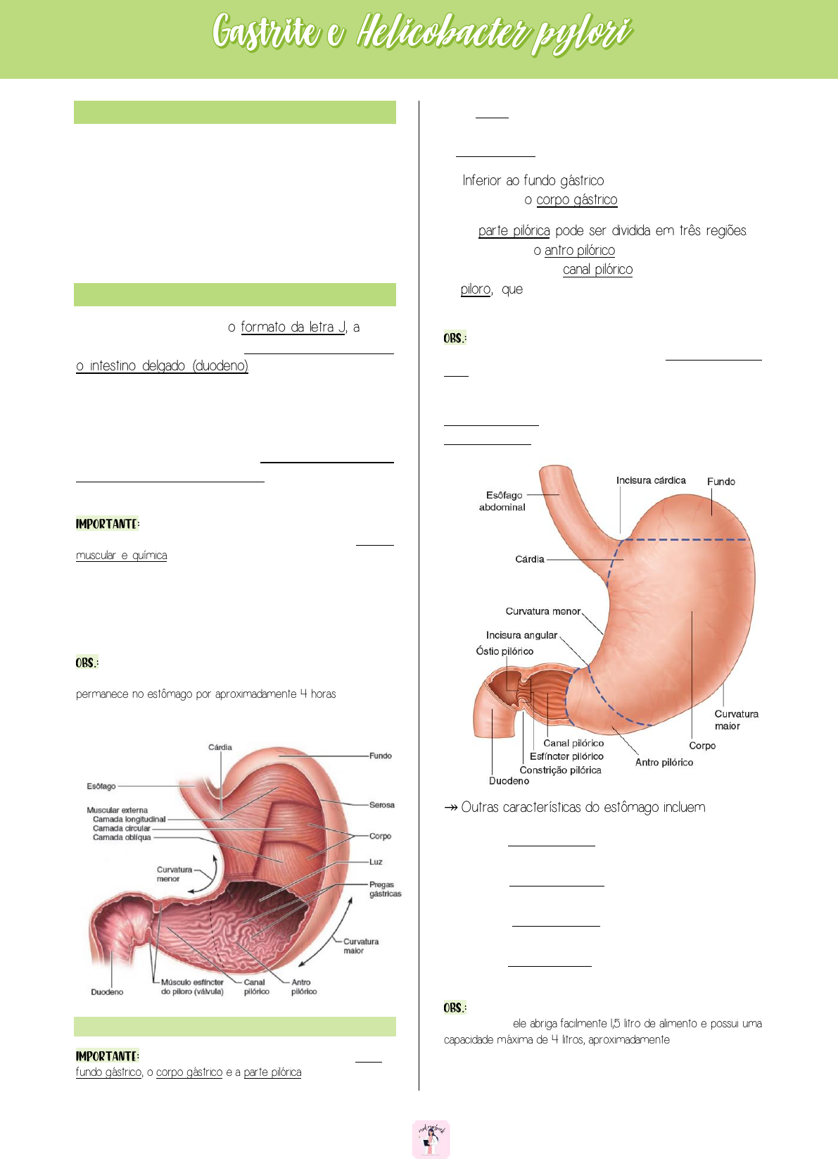 1 Júlia Morbeck – @med.morbeck Objetivos 1- Rever a morfofisiologia do estômago; 2- Discutir sobre a microbiologia da Helicobacter pylori; 3- Estudar sobre a epidemiologia, fatores de risco, etiologia, fisiopatologia, manifestações clínicas e diagnóstico da gastrite aguda e crônica; 4- Entender o tratamento da Helicobacter pylori. Estômago ↠ O estômago, que tem o formato da letra J, a parte mais larga do trato digestório, se estende do esôfago até o intestino delgado (duodeno). O estômago situa-se na parte superior esquerda da cavidade peritoneal, nas regiões do hipocôndrio esquerdo, epigástrico e umbilical do abdome (MARIEB, 7ª ed.). ↠ Ele se situa imediatamente inferior ao diafragma e anterior ao baço e ao pâncreas. Sua parte superior é encoberta pelo lado esquerdo do fígado (MARIEB, 7ª ed.). A função principal do estômago é transformar o bolo alimentar em uma massa viscosa (quimo) por meio da atividade muscular e química. A digestão química se deve a: continuação da digestão de carboidratos iniciada na boca; adição de um fluido ácido (HCl) ao alimento ingerido; digestão parcial de proteínas (ação da pepsina); digestão parcial de triglicerídios (lipases gástrica e lingual). O estômago também produz fator intrínseco e hormônios (JUNQUEIRA & CARNEIRO). Uma das funções do estômago é servir como uma câmara de mistura e reservatório de retenção (TORTORA, 14ª ed.). O alimento permanece no estômago por aproximadamente 4 horas (MARIEB, 7ª ed.). ANATOMIA O estômago tem quatro regiões principais: a cárdia, o fundo gástrico, o corpo gástrico e a parte pilórica (TORTORA, 14ª ed.). ↠ A cárdia circunda a abertura do esôfago ao estômago. A porção arredondada superior e à esquerda da cárdia é o fundo gástrico (TORTORA, 14a ed.). ↠ Inferior ao fundo gástrico está a grande parte central do estômago, o corpo gástrico (TORTORA, 14ª ed.). ↠ A parte pilórica pode ser dividida em três regiões. A primeira região, o antro pilórico, liga o corpo ao estômago. A segunda região, o canal pilórico, leva à terceira região, o piloro, que por sua vez se conecta ao duodeno (TORTORA, 14ª ed.). O piloro se comunica com o duodeno do intestino delgado por meio de um esfíncter de músculo liso chamado músculo esfíncter do piloro (TORTORA, 14ª ed.). ↠ A margem medial côncava do estômago é chamada curvatura menor; a margem lateral convexa é chamada curvatura maior (TORTORA, 14ª ed.). ↠ Outras características do estômago incluem: (GRAY) • A curvatura maior, que é o ponto de fixação do ligamento gastresplênico e do omento maior; • A curvatura menor, que é o ponto de fixação do omento menor; • A incisura cárdica, que é o ângulo superior criado quando o esôfago entra no estômago; • A incisura angular, que é uma curva na pequena curvatura. A estrutura do estômago contribui para a sua grande capacidade de distensão - ele abriga facilmente 1,5 litro de alimento e possui uma capacidade máxima de 4 litros, aproximadamente (MARIEB, 7ª ed.). APG 02 – “É INFECÇÃO OU PREOCUPAÇÃO?” Mobile User 2 Júlia Morbeck – @med.morbeck IRRIGAÇÃO ↠ A irrigação do estômago inclui: (GRAY) • A artéria gástrica esquerda do tronco celíaco; • A artéria gástrica direita, frequentemente originada na artéria hepática comum; • A artéria gastromental direita da artéria gastroduodenal; • A artéria gastromental esquerda da artéria esplênica; • A artéria gástrica posterior da artéria esplênica (uma variante nem sempre presente). HISTOLOGIA Quando o estômago está vazio, a túnica mucosa forma grandes rugas, as pregas gástricas, que podem ser vistas a olho nu (TORTORA, 14ª ed.). ↠ A parede do estômago é composta pelas mesmas camadas básicas que o restante do canal alimentar, com certas modificações (TORTORA, 14ª ed.). MUCOSA ↠ A superfície da túnica mucosa é uma camada de células epiteliais colunares simples, chamada células mucosas da superfície (TORTORA, 14ª ed.). ↠ A túnica mucosa contém a lâmina própria (tecido conjuntivo areolar) e a lâmina muscular da mucosa (músculo liso). As células epiteliais se estendem até a lâmina própria, onde formam colunas de células secretoras chamadas glândulas gástricas (TORTORA, 14ª ed.). ↠ Várias glândulas gástricas se abrem na base de canais estreitos chamadas criptas gástricas. Secreções de várias glândulas gástricas fluem para cada cripta gástrica e, em seguida, para dentro do lúmen do estômago (TORTORA, 14ª ed.). ↠ A superfície da mucosa estomacal é pontilhada por milhões de fossetas gástricas em forma de taça, que se abrem nas glândulas tubulares gástricas. As células mucosas superficiais revestem invariavelmente as fossetas, mas as células que revestem as glândulas gástricas variam entre as diferentes regiões do estômago (MARIEB, 7ª ed.). Nas partes pilórica e cárdica, as células das glândulas são principalmente células mucosas. No fundo e no corpo, por outro lado, as glândulas gástricas contêm três tipos de células secretórias: células mucosas do colo, células parietais (oxínticas) e células principais (zimogênicas) (MARIEB, 7ª ed.). 3 Júlia Morbeck – @med.morbeck ↠ As secreções das células mucosa, parietal e principal gástrica formam o suco gástrico, que totaliza 2.000 a 3.000 m l /dia (TORTORA, 14ª ed.). • Células mucosa do colo: Ocorrem nas extremidades superiores, ou colos, das glândulas gástricas e secretam um tipo diferente de muco em relação ao que é secretado pelas células de superfície (MARIEB, 7ª ed.). • Células parietais: Ocorrem principalmente nas regiões intermediárias das glândulas, produzem o ácido clorídrico (HCl) estomacal bombeando íons de hidrogênio e cloro na luz da glândula. As células oxínticas também secretam fator intrínseco, uma proteína necessária para a absorção da vitamina B12 pelo intesti