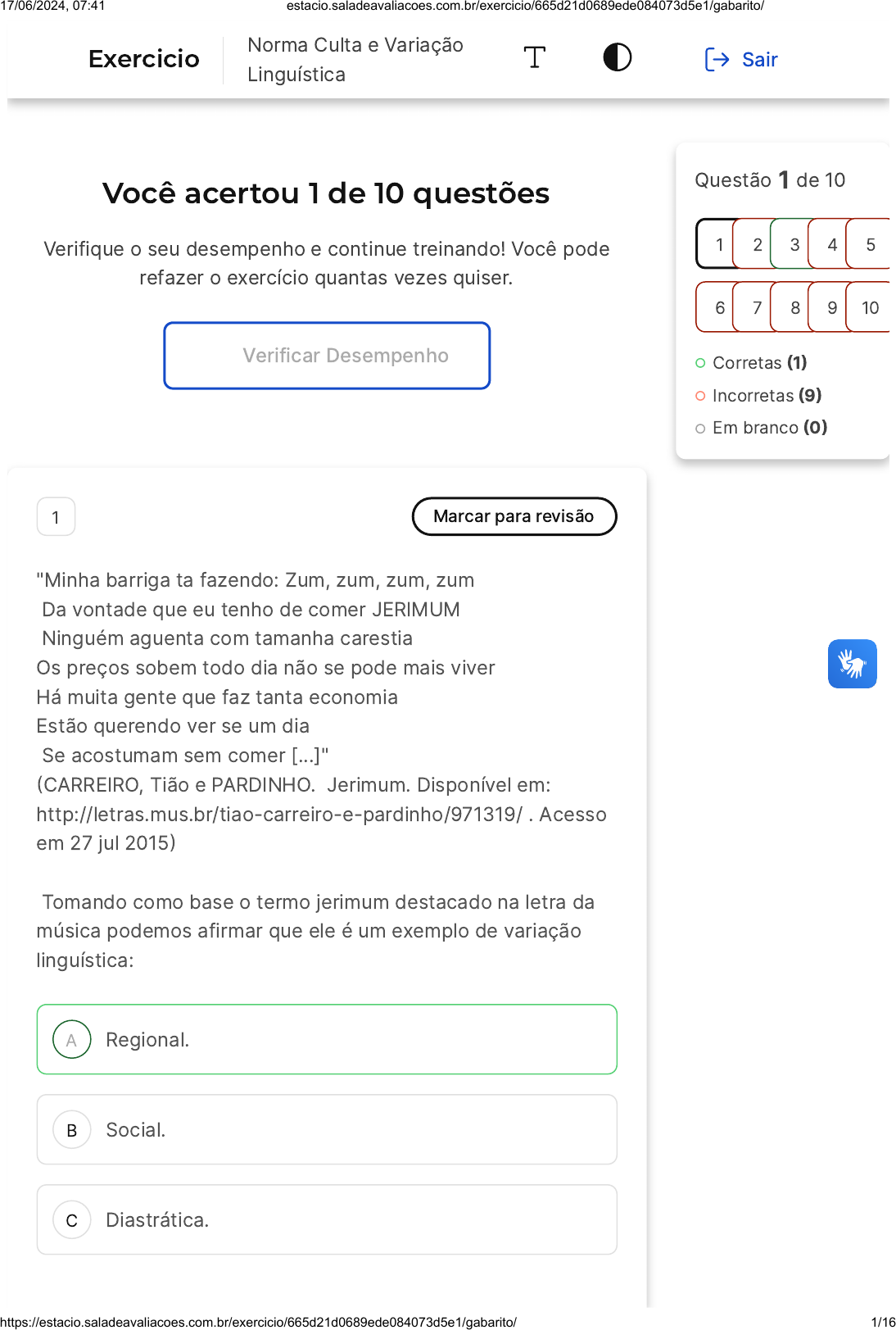 Você acertou 1 de 10 questões Verifique o seu desempenho e continue treinando! Você pode refazer o exercício quantas vezes quiser. Verificar Desempenho A B C 1 Marcar para revisão "Minha barriga ta fazendo: Zum, zum, zum, zum Da vontade que eu tenho de comer JERIMUM Ninguém aguenta com tamanha carestia Os preços sobem todo dia não se pode mais viver Há muita gente que faz tanta economia Estão querendo ver se um dia Se acostumam sem comer [...]" �CARREIRO, Tião e PARDINHO. Jerimum. Disponível em: http://letras.mus.br/tiao-carreiro-e-pardinho/971319/ . Acesso em 27 jul 2015� Tomando como base o termo jerimum destacado na letra da música podemos afirmar que ele é um exemplo de variação linguística: Regional. Social. Diastrática. Questão 1 de 10 Corretas �1� Incorretas �9� Em branco �0� 1 2 3 4 5 6 7 8 9 10 Exercicio Norma Culta e Variação Linguística Sair 17/06/2024, 07:41 estacio.saladeavaliacoes.com.br/exercicio/665d21d0689ede084073d5e1/gabarito/ https://estacio.saladeavaliacoes.com.br/exercicio/665d21d0689ede084073d5e1/gabarito/ 1/16 D E Registro. Diafásica. Resposta incorreta Opa! A alternativa correta é a letra A. Confira o gabarito comentado! Gabarito Comentado A variação linguística regional refere-se às diferenças e particularidades linguísticas que ocorrem em diferentes regiões geográficas. Essas variações podem ser observadas na pronúncia, vocabulário, gramática e até mesmo no uso de expressões e gírias específicas de cada região. Essa diversidade linguística regional é um reflexo da riqueza cultural e das influências históricas presentes em cada localidade. Compreender e valorizar essas variações é fundamental para uma comunicação mais inclusiva e respeitosa, reconhecendo a importância e a legitimidade de cada forma de expressão linguística. 2 Marcar para revisão A noção de variação linguística refere-se à diversidade e às diferentes formas de expressão que existem dentro de uma mesma língua. Cada região, grupo social, faixa etária e contexto possui suas particularidades linguísticas, resultando em variações na pronúncia, vocabulário, gramática e até mesmo no uso de gírias e expressões idiomáticas. A variação linguística não é um fenômeno negativo ou incorreto, mas sim um reflexo da riqueza cultural e social de uma comunidade. Compreender e valorizar as diferentes formas de falar e escrever é fundamental para promover a inclusão e o respeito às diversas identidades linguísticas. A linguagem é dinâmica e está em constante evolução, e a noção de variação linguística 17/06/2024, 07:41 estacio.saladeavaliacoes.com.br/exercicio/665d21d0689ede084073d5e1/gabarito/ https://estacio.saladeavaliacoes.com.br/exercicio/665d21d0689ede084073d5e1/gabarito/ 2/16 A B C D E nos permite reconhecer e apreciar a diversidade linguística em todas as suas formas. Considerando o texto acima, avalie as asserções a seguir e a relação proposta entre elas. I. A noção de variação linguística deve nos levar a reconhecer a legitimidade das diferentes linguagens e evitar o preconceito ou a estigmatização de falares, dialetos ou qualquer variedade linguística. PORQUE II. A língua aprendida na escola corresponde à norma culta, constituindo-se na única forma válida de comunicação em qualquer situação e ambiente. A respeito dessas asserções, assinale a resposta correta. As asserções I e II são proposições verdadeiras, mas a II não é uma justificativa correta da I. As asserções I e II são proposições verdadeiras, e a II é uma justificativa correta da I. A asserção I é uma proposição verdadeira, e a II é uma proposição falsa. A asserção I é uma proposição falsa, e a II é uma proposição verdadeira. As asserções I e II são proposições falsas. Resposta incorreta Opa! A alternativa correta é a letra C. Confira o gabarito comentado! Gabarito Comentado A afirmativa II está incorreta, pois a norma culta não é a única forma válida de comunicação em qualquer situação 17/06/2024, 07:41 estacio.saladeavaliacoes.com.br/exercicio/665d21d0689ede084073d5e1/gabarito/ https://estacio.saladeavaliacoes.com.br/exercicio/665d21d0689ede084073d5e1/gabarito/ 3/16 A B C D E e ambiente. Existem contextos informais, como conversas entre amigos e familiares, em que o uso da norma culta pode soar artificial e distante da linguagem cotidiana. A adequação linguística depende do contexto, das relações interpessoais e dos objetivos comunicativos, e não se restringe apenas à norma culta. 3 Marcar para revisão �FUNDEP / 2023� A linguagem coloquial é uma variação utilizada em situações cotidianas mais informais; a coloquialidade encontra fluidez na oralidade e não segue normas da gramática tradicional. Das alternativas a seguir, a única que não se caracteriza pela presença de linguagem coloquial é: A família tava atrasada, mas foram na missa, mesmo assim. Onde está o meu livro? Ontem o vi na estante do escritório. Você não assistiu o filme? Corre porque ele vai sair de cartaz. Foi eu que fiz a sobremesa; precisei do óculos para ler a receita. A bola passou raspando perto do gol e a plateia estava toda no celular. Resposta correta Parabéns, você selecionou a alternativa correta. Confira o gabarito comentado! 17/06/2024, 07:41 estacio.saladeavaliacoes.com.br/exercicio/665d21d0689ede084073d5e1/gabarito/ https://estacio.saladeavaliacoes.com.br/exercicio/665d21d0689ede084073d5e1/gabarito/ 4/16 Gabarito Comentado A linguagem coloquial é uma forma de comunicação mais informal e espontânea, utilizada no dia a dia e em interações informais. Caracteriza-se pelo uso de expressões populares, gírias, regionalismos e uma estrutura mais simplificada, muitas vezes afastando-se das regras gramaticais mais rigorosas. Essa forma de linguagem busca estabelecer uma conexão direta com o interlocutor, transmitindo uma sensação de proximidade e familiaridade. A