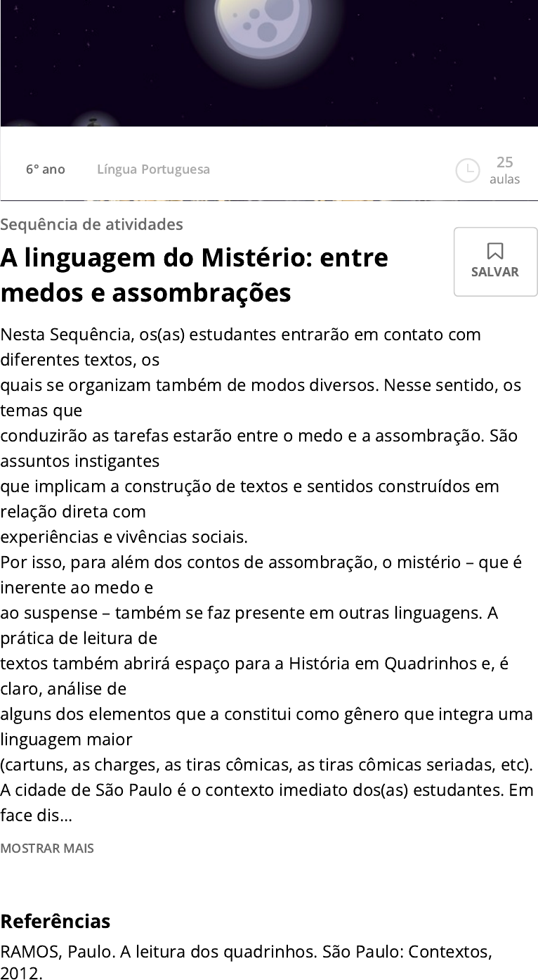26/03/2024, 17:16 Currículo da Cidade de São Paulo https://curriculo.sme.prefeitura.sp.gov.br/imprimir/sequencia/a-linguagem-do-misterio-entre-medos-e-assombracoes 1/66 Sequência de atividades A linguagem do Mistério: entre medos e assombrações SALVAR Nesta Sequência, os(as) estudantes entrarão em contato com diferentes textos, os quais se organizam também de modos diversos. Nesse sentido, os temas que conduzirão as tarefas estarão entre o medo e a assombração. São assuntos instigantes que implicam a construção de textos e sentidos construídos em relação direta com experiências e vivências sociais. Por isso, para além dos contos de assombração, o mistério – que é inerente ao medo e ao suspense – também se faz presente em outras linguagens. A prática de leitura de textos também abrirá espaço para a História em Quadrinhos e, é claro, análise de alguns dos elementos que a constitui como gênero que integra uma linguagem maior (cartuns, as charges, as tiras cômicas, as tiras cômicas seriadas, etc). A cidade de São Paulo é o contexto imediato dos(as) estudantes. Em face dis... MOSTRAR MAIS Referências RAMOS, Paulo. A leitura dos quadrinhos. São Paulo: Contextos, 2012. 6° ano Língua Portuguesa 25 aulas 26/03/2024, 17:16 Currículo da Cidade de São Paulo https://curriculo.sme.prefeitura.sp.gov.br/imprimir/sequencia/a-linguagem-do-misterio-entre-medos-e-assombracoes 2/66 CASCUDO, Luís da Câmara. Dicionário do folclore brasileiro. São Paulo: Global, 2000. p. 28 NORA, Pierre. Entre memória e história: a problemática dos lugares. Projeto História, São Paulo, n.10, p.7-28, dez.1993. RAMA, Angela; VERGUEIRO, Waldomiro. Como usar os quadrinhos na sala de aula. 3 ed. São Paulo: Contexto, 2007. CAGNIN, Antônio Luis. Os quadrinhos. São Paulo: Ática, 1975. GANCHO, Cândida Vilares. Como analisar narrativas. São Paulo: Ática, 2007 GARCIA, Othon M. Comunicação em prosa: aprenda a escrever, aprendendo a pensar. Rio de Janeiro: Editora FGV, 2007, p. 149. BRAIT, Beth. A personagem. São Paulo: Contexto, 2017. ROJO, Roxane. Letramentos múltiplos, escola e inclusão social. São Paulo: Parábola, 2009. p. 78 COSTA, Felipe de Souza. Literatura em sala de aula: desa�os de hoje e sempre. In: Conhecimento Prático: Literatura, Ano 8, Edição 76, p. 54-59 https://revistatrip.uol.com.br/tpm/melinda-gates- -fala-sobre- igualdade-de-genero-e-divisao-de-tarefas-domesticas https://www.geledes.org.br/quem-e-o-homem-o- -que-divisao-de- tarefas-domesticas-revela-sobre- -questoes-de-genero/ https://www.youtube.com/watch?v=LBXd0DrG210 https://petisco.org/ http://michaelis.uol.com.br/moderno-portugues/busca/portugues- brasileiro/ revis%C3%A3o/ http://michaelis.uol.com.br/moderno-portugues/busca/portugues- brasileiro/ edi%C3%A7%C3%A3o/. São Paulo (SP). Secretaria Municipal de Educação. Coordenadoria Pedagógica. Caderno da cidade: saberes e aprendizagens: Língua Portuguesa – livro do(a) professor(a) – 6º ano – volume 1. – São Paulo: SME / COPED, 2019 https://revistatrip.uol.com.br/tpm/melinda-gates-%20-fala-sobre-igualdade-de-genero-e-divisao-de-tarefas-domesticas https://revistatrip.uol.com.br/tpm/melinda-gates-%20-fala-sobre-igualdade-de-genero-e-divisao-de-tarefas-domesticas https://www.geledes.org.br/quem-e-o-homem-o-%20-que-divisao-de-tarefas-domesticas-revela-sobre-%20-questoes-de-genero/ https://www.geledes.org.br/quem-e-o-homem-o-%20-que-divisao-de-tarefas-domesticas-revela-sobre-%20-questoes-de-genero/ https://www.youtube.com/watch?v=LBXd0DrG210 https://petisco.org/ http://michaelis.uol.com.br/moderno-portugues/busca/portugues-brasileiro/%20revis%C3%A3o/ http://michaelis.uol.com.br/moderno-portugues/busca/portugues-brasileiro/%20revis%C3%A3o/ http://michaelis.uol.com.br/moderno-portugues/busca/portugues-brasileiro/%20edi%C3%A7%C3%A3o/.%C2%A0 http://michaelis.uol.com.br/moderno-portugues/busca/portugues-brasileiro/%20edi%C3%A7%C3%A3o/.%C2%A0 26/03/2024, 17:16 Currículo da Cidade de São Paulo https://curriculo.sme.prefeitura.sp.gov.br/imprimir/sequencia/a-linguagem-do-misterio-entre-medos-e-assombracoes 3/66 SÃO PAULO (SP). Secretaria Municipal de Educação. Coordenadoria Pedagógica. Currículo da Cidade: Ensino Fundamental: Língua Portuguesa. São Paulo: SME/COPED, 2017. Disponível em: http://portal.sme.prefeitura.sp.gov.br/Portals/1/Files/44690.pdf. Acesso em:07/03/2019. SÃO PAULO (SP). Secretaria Municipal de Educação. Coordenadoria Pedagógica. Orientações didáticas do currículo da cidade: Língua Portuguesa. São Paulo: SME/COPED, 2018. Disponível em: http://portal.sme.prefeitura.sp.gov.br/Portals/1/Files/45064.pdf. Acesso em:07/03/2019. 4 Atividades Atividade 1 Assombração, mistério e cidade na linguagem dos quadrinhos Ambiente Interno Objetivos de aprendizagem (EF06LP02) Comparar registros linguísticos presentes em textos de diferentes esferas (literária, de consumo, jurídica, acadêmica, jornalística, cientí�ca, entre outras), reconhecendo a especi�cidade do registro literário. (EF06LP03) Ler obras mais extensas de modo programado e sob orientação do professor, identi�cando recursos e estratégias discursivas apresentados e posicionando-se criticamente diante do texto. (EF06LP11) Identi�car recursos utilizados para provocar efeitos de sentido em quadrinhos, como charges, tiras, HQs, graphic novels, mangás e outros textos 6° ano Língua Portuguesa 8 aulas http://portal.sme.prefeitura.sp.gov.br/Portals/1/Files/44690.pdf http://portal.sme.prefeitura.sp.gov.br/Portals/1/Files/45064.pdf 26/03/2024, 17:16 Currículo da Cidade de São Paulo https://curriculo.sme.prefeitura.sp.gov.br/imprimir/sequencia/a-linguagem-do-misterio-entre-medos-e-assombracoes 4/66 correlatos de culturas locais, regionais e globais, impressos ou digitais. (EF06LP12) Identi�car a multimodalidade em textos das diferentes áreas do conhecimento que estejam relacionados ao desenvolvimento de projetos interdisciplinares. (EF06LP30) A