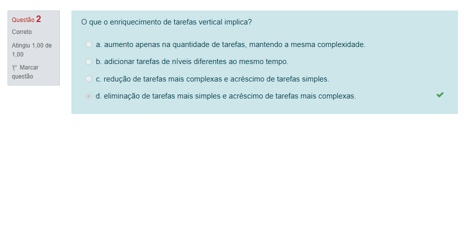 Questão 2 que enriquecimento de tarefas vertical implica? Correto Atingiu 1,00 de a. aumento apenas na quantidade de tarefas, mantendo a mesma complexidade. 1,00 b. adicionar tarefas de níveis diferentes ao mesmo tempo. Marcar questão redução de tarefas mais complexas e acréscimo de tarefas simples. d. eliminação de tarefas mais simples e acréscimo de tarefas mais complexas.