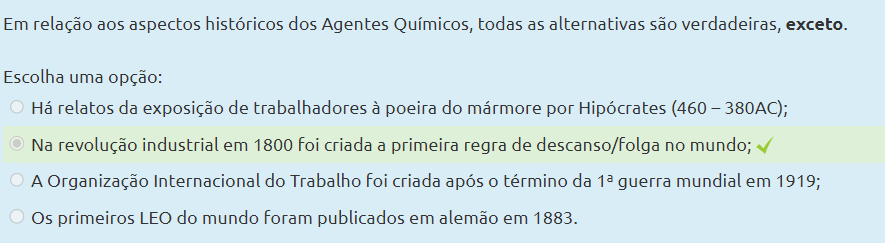 Em relação aos aspectos históricos dos Agentes Químicos, todas as alternativas são verdadeiras, exceto. Escolha uma opção: Há relatos da exposição de trabalhadores à poeira do mármore por Hipócrates (460 - 380AC); Na revolução industrial em 1800 foi criada a primeira regra de descanso/folga no mundo; A Organização Internacional do Trabalho foi criada após o término da guerra mundial em 1919; Os primeiros LEO do mundo foram publicados em alemão em 1883.