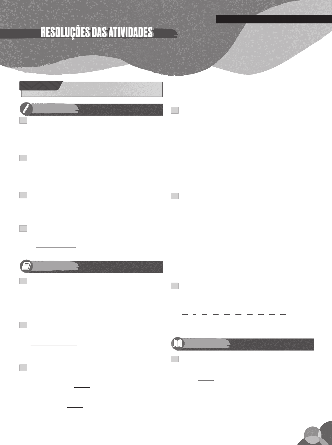 AULA 2 Tabelas e grá� cos – Exercícios ESSENCIAISESSENCIAISATIVIDADES 01 D Considerando pontos consecutivos do grá� co, a resposta é o intervalo de 9/dez. a 30/dez, pois é o período em que a inclinação do segmento de reta é maior. 02 D O período corresponde ao intervalo entre dois vales (pon- tos mínimos do grá� co). Esse intervalo corresponde a 16h – 8h = 8 horas. 03 B A porcentagem de acertos referentes a palavras e � guras foi de 84 90 250 100 69 6 � � �% , %. 04 C Com base nos dados do grá� co, a porcentagem pedida é: 4 5 4 5 3 1 2 5 100 45 � � � � � � � �% %. PROPOSTASPROPOSTASATIVIDADES 01 C As letras mais frequentes no texto do romance, em ordem decrescente de frequência, são A, E, O e S. De acordo com a tabela, no texto codi� cado, tais letras correspondem, respectivamente, a D, H, R e V. 02 D De acordo com a tabela, a porcentagem pedida é: 10200000 1300000 1300000 100 700 � � �% % 03 C I. (F) O aumento da produção de 2014, em relação à de 2012, foi de 86 80 80 100 7 5 � � �% , %. II. (F) Houve um aumento na produção, de 2012 para 2013, de 84 80 80 100 5 � � �% %. III. (V) De fato, o aumento da produção de 2016, em rela- ção à de 2012, foi de 84 80 80 100 5 � � �% %. 04 D Os volumes em cada reservatório, em bilhões de litros, são: Reservatório I: 0,2 ⋅ 105 = 21; Reservatório II: 0,3 ⋅ 100 = 30; Reservatório III: 0,5 ⋅ 20 = 10; Reservatório IV: 0,4 ⋅ 80 = 32; Reservatório V: 0,6 ⋅ 40 = 24. Portanto, o reservatório com maior volume é o IV. 05 C Os valores apresentados pelo grá� co referem-se às por- centagens de crescimento e decrescimento do IPCA, no período considerado. Analisando as alternativas, tem-se: a) (F) Há 10 crescimentos e apenas 2 decrescimentos. b) (F) Há 10 intervalos em que houve crescimento. c) (V) Houve crescimento maior que 1% em dezembro de 2020. d) (F) Existe um período de estabilidade entre out./20 e nov./2020. e) (F) Há 10 intervalos em que houve crescimento. 06 E Analisando as razões entre o número de fumantes e o total de entrevistados em cada empresa, tem-se: 3 28 1 8 2 16 3 24 6 40 3 20 4 20 3 15 5 25 5 23 � � � � � � � � � Logo, a empresa com o menor percentual é a V. APROFUNDAMENTOAPROFUNDAMENTOATIVIDADES DE 01 A a) (V) b) (F) 80 60 60 33 3333 � � , % . c) (F) 106 70 70 36 70 50 � � � %. d) (F) O grá� co se mantém constante. e) (F) O número de casos aumentou. M A T E M Á T I C A 1 P R É- U N I V E R S I TÁ R I O – L I V R O 1 1 02 E O grá� co que corresponde ao resultado do exame do paciente que apresentou ausência de descenso noturno é o da alternativa E. De fato, 0,9 · 150 = 135, e a pressão arterial sistólica registrada entre o período de vigília e o período de sono desse paciente � cou acima de 140. 03 B Como a última linha do infográ� co possui 20 pessoas, cal- cula-se a área procurada: A A� � � � � � � � � � � �0 003 20 2 2 0 19 2 2, , mm� 04 D a) (F) Acima de F = 0,6, praticamente todos os sábados superaram o valor de 380 (nm/s)2. b) (F) Em vários dias úteis da semana o valor de F superou 0,8, o que indica que menos de 20% das pessoas permaneceram em casa. c) (F) Em nenhum dia de domingo ou feriado a energia sísmica média foi maior que 600 (nm/s)2. d) (V) Para o mesmo número de pessoas que saiu de casa em um dia, esse fato realmente pode ser observado. e) (F) Esse valor indica que 40% das pessoas ou menos saíram de casa nesse dia. ATIVIDADES DISCURSIVASDISCURSIVAS 01 Pelo novo critério de classi� cação, a pontuação do México será igual a 37 ⋅ 3 + 36 ⋅ 2 + 63 = 246, enquanto a do Canadá será 35 ⋅ 3 + 64 ⋅ 2 + 53 = 286. EUA e Brasil � cam nas mesmas posições que estavam, Canadá troca de posi- ção com México e Argentina troca de posição com Cuba. Os demais países permaneceriam na mesma posição. 02 Considerando valores aproximados, tem-se: De 2000 a 2003: 6,5 + 6 + 6,7 + 7,8 = 27; Nos três maiores: 11 + 10 + 9,6 = 30,6. Como 27 < 30,6, nota-se que a soma das quantidades de couro adquiridas nos primeiros trimestres dos anos de 2000, 2001, 2002 e 2003 foi menor do que a soma das quantidades adquiridas de couro nos três primeiros tri- mestres com maior aquisição de couro. P R É- U N I V E R S I TÁ R I O – L I V R O 1 M A T E M Á T I C A 1 2