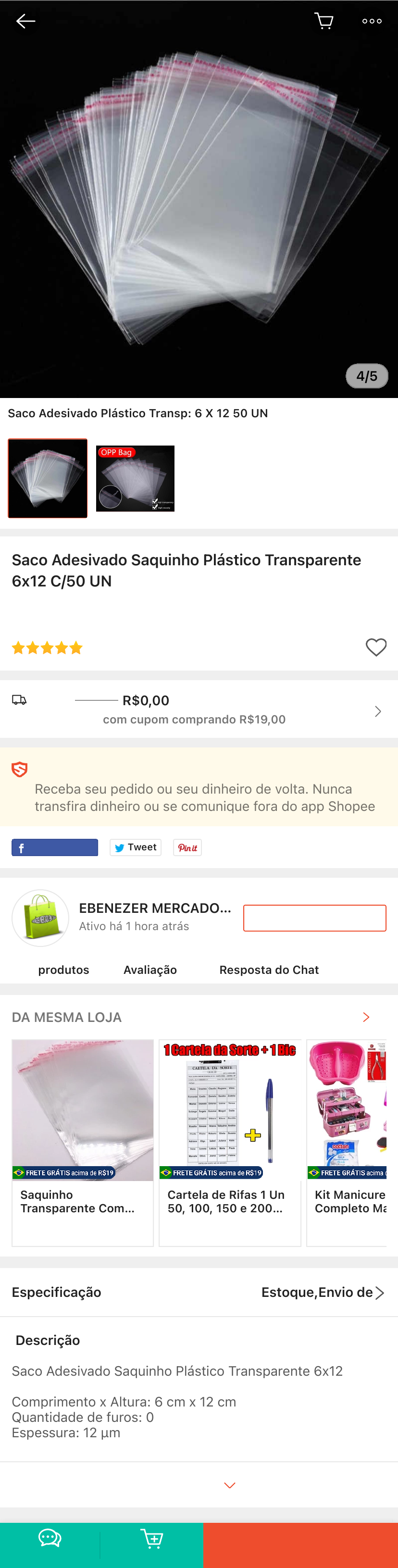 Saco Adesivado Saquinho Plástico Transparente 6x12 C/50 UN R$12,99 - R$19,99 4.9 Compartilhar Tweet EBENEZER MERCADO… Ativo há 1 hora atrás 650 produtos 4.9 Avaliação 90% Resposta do Chat Especificação Estoque,Envio de Descrição Ver Mais Saco Adesivado Plástico Transp: 6 X 12 50 UN Frete: R$7,18 R$0,00 Frete grátis com cupom comprando R$19,00 Garantia Shopee Receba seu pedido ou seu dinheiro de volta. Nunca transfira dinheiro ou se comunique fora do app Shopee Ver página da Loja DA MESMA LOJA Ver tudo Saquinho Transparente Com… Adesivo saco adesivado 100 Unidades Tamanhos (7x7cm) (10x15cm) R$8,90 Cartela de Rifas 1 Un 50, 100, 150 e 200… nomes +1 Un Caneta BicR$13,99 Kit Manicure Completo Maleta… Caixa Organizadora Feminina Esmaltes Impala E Outros Alicate Mundial 522 R$210,00 Saco Adesivado Saquinho Plástico Transparente 6x12 Comprimento x Altura: 6 cm x 12 cm Quantidade de furos: 0 Espessura: 12 µm Saco plástico transparente em Polipropileno.(BOPP) 4/5 Conversar agora Adicionar ao carrinho Compre agora 10/07/2024, 08:23 Página 1 de 1