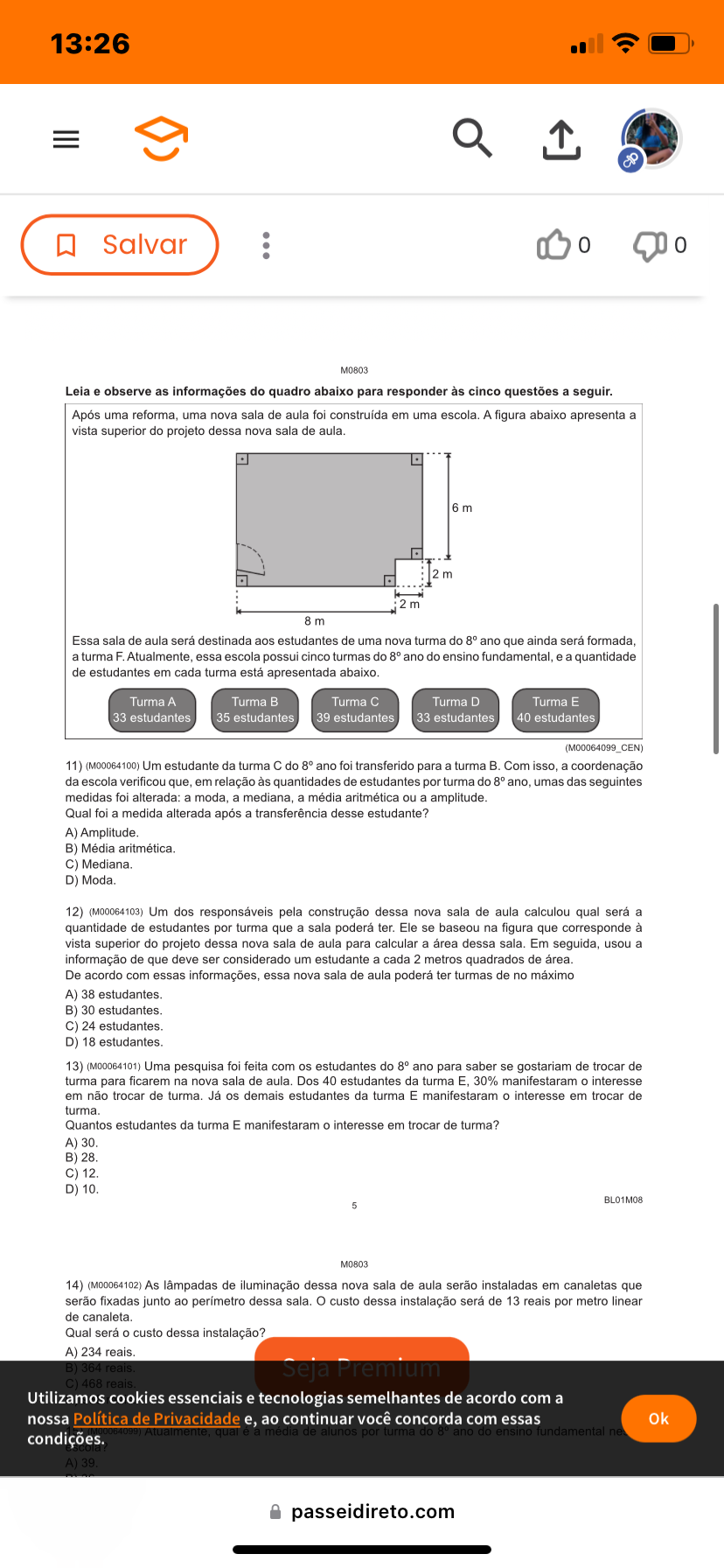 13:26 Salvar 0 0 M0803 Leia e observe as informações do quadro abaixo para responder às cinco questões a seguir. Após uma reforma, uma nova sala de aula foi construída em uma escola. A figura abaixo apresenta a vista superior do projeto dessa nova sala de aula. . 6 . 2 m . 8 m Essa sala de aula será destinada aos estudantes de uma nova turma do 8° ano que ainda será formada, a turma F. Atualmente, essa escola possui cinco turmas do 8° ano do ensino fundamental, e a quantidade de estudantes em cada turma está apresentada abaixo. Turma A Turma B Turma C Turma D Turma E 33 estudantes 35 estudantes 39 estudantes 33 estudantes 40 estudantes (M00064099_CEN) 11) (M00064100) Um estudante da turma C do ano foi transferido para a turma B. Com isso, a coordenação da escola verificou que, em relação às quantidades de estudantes por turma do 8° ano, umas das seguintes medidas foi alterada: a moda, a mediana, a média aritmética ou a amplitude. Qual foi a medida alterada após a transferência desse estudante? A) B) Média aritmética. C) Mediana D) Moda. 12) (M00064103) Um dos responsáveis pela construção dessa nova sala de aula calculou qual será a quantidade de estudantes por turma que a sala poderá ter. Ele se baseou na figura que corresponde à vista superior do projeto dessa nova sala de aula para calcular a área dessa sala. Em seguida, usou a informação de que deve ser considerado um estudante a cada 2 metros quadrados de área. De acordo com essas informações, essa nova sala de aula poderá ter turmas de no máximo A) 38 estudantes. B) 30 estudantes. C) 24 estudantes. D) 18 13) (M00064101) Uma pesquisa foi feita com os estudantes do 8° ano para saber se gostariam de trocar de turma para ficarem na nova sala de aula. Dos 40 estudantes da turma 30% manifestaram interesse em não trocar de turma. Já os demais estudantes da turma E manifestaram interesse em trocar de turma. Quantos estudantes da turma E manifestaram o interesse em trocar de turma? A) 30. B) 28. C) 12. D) 10. BL01M08 5 M0803 14) (M00064102) As lâmpadas de iluminação dessa nova sala de aula serão instaladas em canaletas que serão fixadas junto ao perímetro dessa sala. custo dessa instalação será de 13 reais por metro linear de Qual será o custo dessa instalação? A) 234 reais. Seja Premium C) 468 reais Utilizamos cookies essenciais e tecnologias semelhantes de acordo com a nossa Política de Privacidade e, ao continuar você concorda com essas Ok condições. Atualmente, qual de do ensino fundamental ne A) 39 passeidireto.com