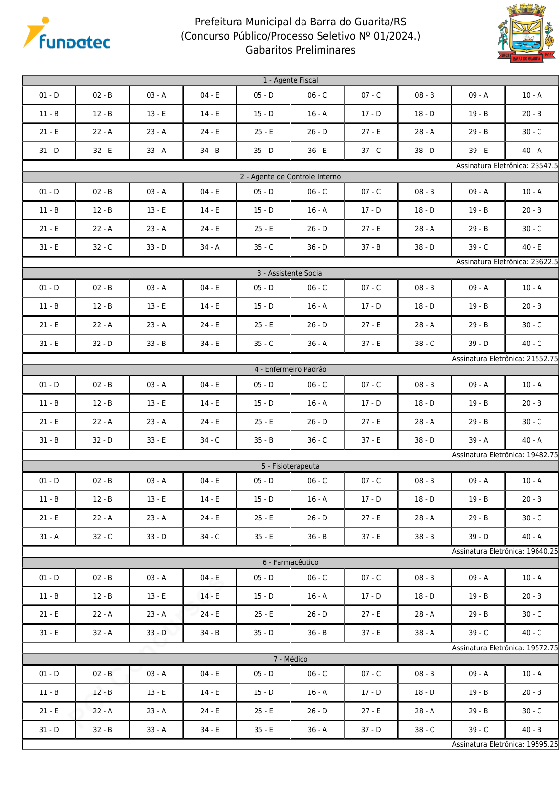 pcimarkpci MDAwMDowMDAwOjAwMDA6MDAwMDowMDAwOmZmZmY6YmFmOToyZDFl:VGh1LCAwOCBBdWcgMjAyNCAxMzo0MjozNCAtMDMwMA== www.pciconcursos.com.br Prefeitura Municipal da Barra do Guarita/RS (Concurso Público/Processo Seletivo Nº 01/2024.) Gabaritos Preliminares 1 - Agente Fiscal 01 - D 02 - B 03 - A 04 - E 05 - D 06 - C 07 - C 08 - B 09 - A 10 - A 11 - B 12 - B 13 - E 14 - E 15 - D 16 - A 17 - D 18 - D 19 - B 20 - B 21 - E 22 - A 23 - A 24 - E 25 - E 26 - D 27 - E 28 - A 29 - B 30 - C 31 - D 32 - E 33 - A 34 - B 35 - D 36 - E 37 - C 38 - D 39 - E 40 - A Assinatura Eletrônica: 23547.5 2 - Agente de Controle Interno 01 - D 02 - B 03 - A 04 - E 05 - D 06 - C 07 - C 08 - B 09 - A 10 - A 11 - B 12 - B 13 - E 14 - E 15 - D 16 - A 17 - D 18 - D 19 - B 20 - B 21 - E 22 - A 23 - A 24 - E 25 - E 26 - D 27 - E 28 - A 29 - B 30 - C 31 - E 32 - C 33 - D 34 - A 35 - C 36 - D 37 - B 38 - D 39 - C 40 - E Assinatura Eletrônica: 23622.5 3 - Assistente Social 01 - D 02 - B 03 - A 04 - E 05 - D 06 - C 07 - C 08 - B 09 - A 10 - A 11 - B 12 - B 13 - E 14 - E 15 - D 16 - A 17 - D 18 - D 19 - B 20 - B 21 - E 22 - A 23 - A 24 - E 25 - E 26 - D 27 - E 28 - A 29 - B 30 - C 31 - E 32 - D 33 - B 34 - E 35 - C 36 - A 37 - E 38 - C 39 - D 40 - C Assinatura Eletrônica: 21552.75 4 - Enfermeiro Padrão 01 - D 02 - B 03 - A 04 - E 05 - D 06 - C 07 - C 08 - B 09 - A 10 - A 11 - B 12 - B 13 - E 14 - E 15 - D 16 - A 17 - D 18 - D 19 - B 20 - B 21 - E 22 - A 23 - A 24 - E 25 - E 26 - D 27 - E 28 - A 29 - B 30 - C 31 - B 32 - D 33 - E 34 - C 35 - B 36 - C 37 - E 38 - D 39 - A 40 - A Assinatura Eletrônica: 19482.75 5 - Fisioterapeuta 01 - D 02 - B 03 - A 04 - E 05 - D 06 - C 07 - C 08 - B 09 - A 10 - A 11 - B 12 - B 13 - E 14 - E 15 - D 16 - A 17 - D 18 - D 19 - B 20 - B 21 - E 22 - A 23 - A 24 - E 25 - E 26 - D 27 - E 28 - A 29 - B 30 - C 31 - A 32 - C 33 - D 34 - C 35 - E 36 - B 37 - E 38 - B 39 - D 40 - A Assinatura Eletrônica: 19640.25 6 - Farmacêutico 01 - D 02 - B 03 - A 04 - E 05 - D 06 - C 07 - C 08 - B 09 - A 10 - A 11 - B 12 - B 13 - E 14 - E 15 - D 16 - A 17 - D 18 - D 19 - B 20 - B 21 - E 22 - A 23 - A 24 - E 25 - E 26 - D 27 - E 28 - A 29 - B 30 - C 31 - E 32 - A 33 - D 34 - B 35 - D 36 - B 37 - E 38 - A 39 - C 40 - C Assinatura Eletrônica: 19572.75 7 - Médico 01 - D 02 - B 03 - A 04 - E 05 - D 06 - C 07 - C 08 - B 09 - A 10 - A 11 - B 12 - B 13 - E 14 - E 15 - D 16 - A 17 - D 18 - D 19 - B 20 - B 21 - E 22 - A 23 - A 24 - E 25 - E 26 - D 27 - E 28 - A 29 - B 30 - C 31 - D 32 - B 33 - A 34 - E 35 - E 36 - A 37 - D 38 - C 39 - C 40 - B Assinatura Eletrônica: 19595.25 pcimarkpci MDAwMDowMDAwOjAwMDA6MDAwMDowMDAwOmZmZmY6YmFmOToyZDFl:VGh1LCAwOCBBdWcgMjAyNCAxMzo0MjozNCAtMDMwMA== www.pciconcursos.com.br Prefeitura Municipal da Barra do Guarita/RS (Concurso Público/Processo Seletivo Nº 01/2024.) Gabaritos Preliminares 8 - Médico Veterinário 01 - D 02 - B 03 - A 04 - E 05 - D 06 - C 07 - C 08 - B 09 - A 10 - A 11 - B 12 - B 13 - E 14 - E 15 - D 16 - A 17 - D 18 - D 19 - B 20 - B 21 - E 22 - A 23 - A 24 - E 25 - E 26 - D 27 - E 28 - A 29 - B 30 - C 31 - B 32 - D 33 - C 34 - B 35 - C 36 - A 37 - E 38 - D 39 - A 40 - E Assinatura Eletrônica: 19741.5 9 - Nutricionista 01 - D 02 - B 03 - A 04 - E 05 - D 06 - C 07 - C 08 - B 09 - A 10 - A 11 - B 12 - B 13 - E 14 - E 15 - D 16 - A 17 - D 18 - D 19 - B 20 - B 21 - E 22 - A 23 - A 24 - E 25 - E 26 - D 27 - E 28 - A 29 - B 30 - C 31 - D 32 - B 33 - C 34 - D 35 - D 36 - E 37 - B 38 - E 39 - C 40 - A Assinatura Eletrônica: 20754 10 - Odontólogo 01 - D 02 - B 03 - A 04 - E 05 - D 06 - C 07 - C 08 - B 09 - A 10 - A 11 - B 12 - B 13 - E 14 - E 15 - D 16 - A 17 - D 18 - D 19 - B 20 - B 21 - E 22 - A 23 - A 24 - E 25 - E 26 - D 27 - E 28 - A 29 - B 30 - C 31 - B 32 - E 33 - C 34 - D 35 - A 36 - B 37 - C 38 - E 39 - D 40 - A Assinatura Eletrônica: 19595.25 11 - Oficial Administrativo 01 - D 02 - B 03 - A 04 - E 05 - D 06 - C 07 - C 08 - B 09 - A 10 - A 11 - B 12 - B 13 - E 14 - E 15 - D 16 - A 17 - D 18 - D 19 - B 20 - B 21 - E 22 - A 23 - A 24 - E 25 - E 26 - D 27 - E 28 - A 29 - B 30 - C 31 - C 32 - D 33 - D 34 - E 35 - A 36 - C 37 - A 38 - B 39 - B 40 - E Assinatura Eletrônica: 21722.5 12 - Professor Anos Iniciais 01 - D 02 - B 03 - A 04 - E 05 - D 06 - C 07 - C 08 - B 09 - A 10 - A 11 - B 12 - B 13 - E 14 - E 15 - D 16 - B 17 - C 18 - B 19 - D 20 - D 21 - C 22 - B 23 - B 24 - A 25 - A 26 - E 27 - C 28 - A 29 - C 30 - D 31 - A 32 - C 33 - D 34 - C 35 - B 36 - E 37 - B 38 - A 39 - D 40 - C Assinatura Eletrônica: 28550.25 13 - Professor de Arte 01 - D 02 - B 03 - A 04 - E 05 - D 06 - C 07 - C 08 - B 09 - A 10 - A 11 - B 12 - B 13 - E 14 - E 15 - D 16 - B 17 - C 18 - B 19 - D 20 - D 21 - C 22 - B 23 - B 24 - A 25 - A 26 - E 27 - C 28 - A 29 - C 30 - D 31 - A 32 - C 33 - D 34 - C 35 - B 36 - C 37 - E 38 - A 39 - B 40 - D Assinatura Eletrônica: 28561.5 14 - Professor de Ciências 01 - D 02 - B 03 - A 04 - E 05 - D 06 - C 07 - C 08 - B 09 - A 10 - A 11 - B 12 - B 13 - E 14 - E 15 - D 16 - B 17 - C 18 - B 19 - D 20 - D 21 - C 22 - B 23 - B 24 - A 25 - A 26 - E 27 - C 28 - A 29 - C 30 - D 31 - A 32 - C 33 - D 34 - C 35 - B 36 - B 37 - D 38 - C 39 - E 40 - A Assinatura Eletrônica: 28561.5 pcimarkpci MDAwMDowMDAwOjAwMDA6MDAwMDowMDAwOmZmZmY6YmFmOToyZDFl:VGh1LCAwOCBBdWcgMjAyNCAxMzo0MjozNCAtMDMwMA== www.pciconcursos.com.br Prefeitura Municipal da Barra do Guarita/RS (Concurso Público/Processo Seletivo Nº 01/2024.) Gabaritos Preliminares 15 - Professor de Inglês 01 - D 02 - B 03 - A 04 - E 05 - D 06 - C 07 - C 08 - B 09 - A 10 - A 11 - B 12 - B 13 - E 14 - E 15 - D 16 - B 17 - C 18 - B 19 - D 20 - D 21 - C 22 - B 23 - B 24 - A 25 - A 26 - E 27 - C 28 - A 29 - C 30 - D 31 - A 32 - C 33 - D 34 - C 35 - B 36 - E 37 - A 38 - C 39 - D 40 - B Assinatura Eletrônica: 28539 16 - Professor de Educação Infantil 01 - D 02 - B 03 - A 04 - E 05 - D 06 - C 07 - C 08 - B 09 - A 10 - A 11 - B 12 - B 13 - E 14 - E 15 - D 16 - B 17 - C 18 - B 19 - D 20 - D 21 - C 22 - B 23 - B 24 - A 25 - A 26 - E 27 - C 