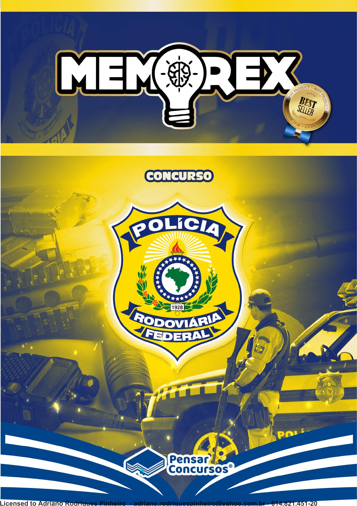 Memorex PRF - Rodada 01 1 Licensed to Adriano Rodrigues Pinheiro - adriano.rodriguespinheiro@yahoo.com.br - 614.821.451-20 Memorex PRF - Rodada 01 2 Parabéns por ter dado esse passo importante na sua preparação, meu amigo(a). Temos TOTAL certeza de que este material vai te fazer ganhar muitas questões e garantir a sua aprovação. Você está tendo acesso agora à Rodada 01. As outras 05 rodadas serão disponibilizadas na sua área de membros conforme o cronograma abaixo: Material Data Rodada 01 Disponível Imediatamente Rodada 02 10/02 Rodada 03 17/02 Rodada 04 24/02 Rodada 05 03/03 Rodada 06 10/03 Convém mencionar que todos que adquirirem o material completo irão receber TODAS AS RODADAS já disponíveis, independente da data de compra. Nesse material focamos também nos temas mais simples e com mais DECOREBA, pois, muitas vezes, os deixamos de lado e isso pode, infelizmente, custar inúmeras posições no resultado final. Lembre-se: uma boa revisão é o segredo da APROVAÇÃO. Portanto, utilize o nosso material com todo o seu esforço, estudando e aprofundando cada uma das dicas. Se houver qualquer dúvida, você pode entrar em contato conosco enviando suas dúvidas para: atendimento@pensarconcursos.com Licensed to Adriano Rodrigues Pinheiro - adriano.rodriguespinheiro@yahoo.com.br - 614.821.451-20 Memorex PRF - Rodada 01 3 ÍNDICE LÍNGUA PORTUGUESA ..................................................................................................... 4 RACIOCÍNIO LÓGICO - MATEMÁTICO .................................................................. 13 INFORMÁTICA .................................................................................................................... 15 FÍSICA ..................................................................................................................................... 19 ÉTICA E CIDADANIA ....................................................................................................... 21 GEOPOLÍTICA ..................................................................................................................... 23 LÍNGUA INGLESA .............................................................................................................. 25 LÍNGUA ESPANHOLA ...................................................................................................... 28 LEGISLAÇÃO DE TRÂNSITO ........................................................................................ 31 DIREITO ADMINISTRATIVO ....................................................................................... 43 DIREITO CONSTITUCIONAL ....................................................................................... 51 DIREITO PROCESSUAL PENAL .................................................................................. 66 LEGISLAÇÃO ESPECIAL ................................................................................................. 73 DIREITOS HUMANOS ...................................................................................................... 78 Licensed to Adriano Rodrigues Pinheiro - adriano.rodriguespinheiro@yahoo.com.br - 614.821.451-20 Memorex PRF - Rodada 01 4 LÍNGUA PORTUGUESA DICA 01 TEXTO DISSERTATIVO * Processo em que o emissor BUSCA DEFENDER UMA IDEIA, transmite conhecimento, relata, discorre sobre determinado assunto e argumenta; * sua ESTRUTURA é dividida em TRÊS PARTES FUNDAMENTAIS: TESE (introdução), ANTÍTESE (desenvolvimento) e NOVA TESE (conclusão). * Define o modelo básico para apresentar uma tese (ideia, tema, assunto), EXPLORAR ARGUMENTOS CONTRA E A FAVOR (antítese) e, por fim, sugerir uma nova tese, ou seja, uma nova ideia para concluir sua fundamentação. * Os TEXTOS DISSERTATIVOS-ARGUMENTATIVOS, além de ser um texto opinativo, BUSCAM PERSUADIR O LEITOR. DICA 02 ESTRUTURA DO TEXTO DISSERTATIVO INTRODUÇÃO: é o parágrafo que abre a discussão ou simplesmente EXPÕE A INFORMAÇÃO PRINCIPAL. Também chamada de "Tese", nesse momento, o mais importante é EXPOR A IDEIA CENTRAL SOBRE O TEMA DE MANEIRA CLARA. Importante lembrar que a Introdução é a parte MAIS IMPORTANTE DO TEXTO e por isso deve conter a informações que logo serão desenvolvidas. DESENVOLVIMENTO: Nessa parte do texto é que se DESENVOLVE A ARGUMENTAÇÃO POR MEIO DE OPINIÕES, DADOS, LEVANTAMENTOS, ESTATÍSTICAS, FATOS E EXEMPLOS SOBRE O TEMA, a fim de que sua tese (ideia central) seja defendida com propriedade. CONCLUSÃO: é o fechamento da informação, seja ela crítica ou não. Muitas vezes iniciadas com elementos como “PORTANTO”, “EM SUMA”, “ENFIM”, ETC. Nela há normalmente a RATIFICAÇÃO, CONFIRMAÇÃO DA TESE, tomando por base os argumentos dos parágrafos anteriores. DICA 03 TIPOS DE DISSERTAÇÃO Existem DOIS TIPOS DE DISSERTAÇÃO: TEXTO DISSERTATIVO OPINATIVO-ARGUMENTATIVO: Nessa modalidade, a intenção é persuadir o leitor, CONVENCÊ-LO DE SUA TESE (ideia central) a partir de coerente ARGUMENTAÇÃO, EXEMPLOS, FATOS. TEXTO DISSERTATIVO EXPOSITIVO: Com o INTUITO DE INFORMAR E ESCLARECER, o texto dissertativo-expositivo é caracterizado por utilizar uma LINGUAGEM CLARA E OBJETIVA. O AUTOR adota a postura de “PORTA-VOZ” de uma opinião. Ex.: “Locução adjetiva é um conjunto de duas ou mais palavras que, juntas, atuam como um adjetivo, caracterizando um substantivo. ” Licensed to Adriano Rodrigues Pinheiro - adriano.rodriguespinheiro@yahoo.com.br - 614.821.451-20 Memorex PRF - Rodada 01 5 DICA 04 RECURSOS ARGUMENTATIVOS - ARGUMENTO DE AUTORIDADE: * É construído com base em uma AFIRMAÇÃO DE SABER NOTÓRIO, de conhecimento público. * É uma forma de GARANTIR A CREDIBILIDADE DA AUTORIDADE citada no texto. - ARGUMENTO DE CONSENSO: NÃO PRECISA DE PROVAS, pois seu conteúdo é aceito como verdade dentro de um grupo ou espaço sociocultural. DICA 05 TEXTO NARRATIVO * Existência de um ENREDO, do qual se DESENVOLVEM AS AÇÕES das personagens, marcadas pelo TEMPO E PELO 