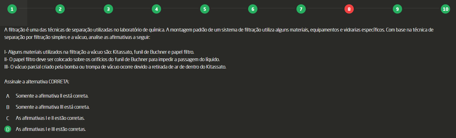 1 2 3 4 5 6 7 8 9 10 A filtração é uma das técnicas de separação utilizadas no laboratório de química. A montagem padrão de um sistema de filtração utiliza alguns materiais, equipamentos e vidrarias específicos. Com base na técnica de separação por filtração simples e a vácuo, analise as afirmativas a Alguns materiais utilizados na filtração a vácuo são: Kitassato, funil de Buchner e papel filtro. II- 0 papel filtro deve ser colocado sobre orifícios do funil de Buchner para impedir a passagem do líquido. III- vácuo parcial criado pela bomba trompa de vácuo ocorre devido a retirada de de dentro do Kitassato. Assinale a alternativa CORRETA: A Somente a afirmativa II está correta. B Somente a afirmativa III está correta. C As afirmativas e II estão corretas. D As afirmativas I e III estão corretas.