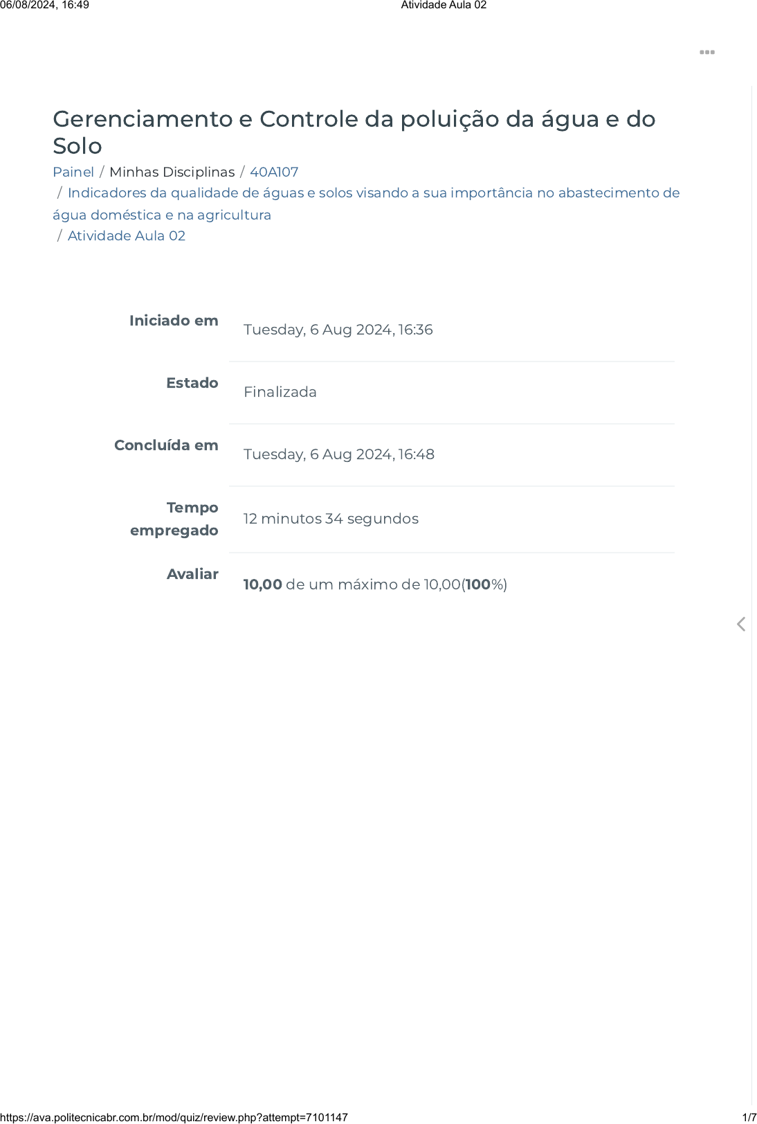 Painel / Minhas Disciplinas / 40A107 / Indicadores da qualidade de águas e solos visando a sua importância no abastecimento de água doméstica e na agricultura / Atividade Aula 02 Gerenciamento e Controle da poluição da água e do Solo Iniciado em Tuesday, 6 Aug 2024, 16:36 Estado Finalizada Concluída em Tuesday, 6 Aug 2024, 16:48 Tempo empregado 12 minutos 34 segundos Avaliar 10,00 de um máximo de 10,00(100%) 06/08/2024, 16:49 Atividade Aula 02 https://ava.politecnicabr.com.br/mod/quiz/review.php?attempt=7101147 1/7 https://ava.politecnicabr.com.br/my/ https://ava.politecnicabr.com.br/my/ https://ava.politecnicabr.com.br/course/view.php?id=1048 https://ava.politecnicabr.com.br/course/view.php?id=1048#section-3 https://ava.politecnicabr.com.br/course/view.php?id=1048#section-3 https://ava.politecnicabr.com.br/mod/quiz/view.php?id=27436 https://ava.politecnicabr.com.br/ Questão 1 Correto Atingiu 2,00 de 2,00 O Decreto 8.384, de 29 de dezembro de 2014, que dispõe sobre a inspeção e �scalização da produção e do comércio de fertilizantes, corretivos, inoculantes, ou biofertilizantes, remineralizadores e substratos para plantas destinados à agricultura traz as diretrizes de controle de qualidade dos solos no Brasil. O referido decreto apresenta as seguintes considerações e de�nições. Art. 2 Para os �ns deste Regulamento, considera-se: produto que contém princípio ativo ou agente orgânico, isento de substâncias agrotóxicas, capaz de atuar, direta ou indiretamente, sobre o todo ou parte das plantas cultivadas, elevando a sua produtividade, sem ter em conta o seu valor hormonal ou estimulante. porção representativa de um lote ou partida de fertilizante, inoculante, corretivo, biofertilizante, remineralizador e substrato para plantas su�cientemente homogênea e corretamente identi�cada, retirada por �scal federal agropecuário ou sob sua supervisão ou aprovação e obtida por método de�nido pelo Ministério da Agricultura, Pecuária e Abastecimento. substância mineral ou orgânica, natural ou sintética, fornecedora de um ou mais nutrientes de plantas. toda sobra de fertilizantes, sem padrão de�nido, resultante da limpeza de equipamento de produção, instalações ou movimentação de produtos, quando do seu carregamento ou ensaque. material adicionado em mistura de fertilizantes, para o ajuste de formulação, que não inter�ra na ação destes e pelo qual não se ofereçam garantias em nutrientes no produto �nal. qualquer substância adicionada intencionalmente ao produto para melhorar sua ação, aplicabilidade, função, durabilidade, estabilidade e detecção ou para facilitar o processo de produção. o biofe amos fertili varre carga aditiv 06/08/2024, 16:49 Atividade Aula 02 https://ava.politecnicabr.com.br/mod/quiz/review.php?attempt=7101147 2/7 https://ava.politecnicabr.com.br/ Questão 2 Correto Atingiu 2,00 de 2,00 O abastecimento de água doméstica é importante se ater ao que descreve o artigo 5° da Portaria MS 2.914/2011. As principais de�nições pela referida Portaria são: é a interrupção do serviço de abastecimento de água, sistemática ou não, que se repete ao longo de determinado período, com duração igual ou superior a seis horas em cada ocorrência. água submetida a processos físicos, químicos ou combinação destes, visando atender ao padrão de potabilidade. conjunto de parâmetros caracterizados por provocar estímulos sensoriais que afetam a aceitação para consumo humano, mas que não necessariamente implicam risco à saúde. água que atenda ao padrão de potabilidade estabelecido nesta Portaria e que não ofereça riscos à saúde. instalação composta por um conjunto de obras civis, materiais e equipamentos, desde a zona de captação até as ligações prediais, destinada à produção e ao fornecimento coletivo de água potável, por meio de rede de distribuição. conjunto de atividades exercidas regularmente pelo responsável pelo sistema ou por solução alternativa coletiva de abastecimento de água, destinado a veri�car se a água fornecida à população é potável, de forma a assegurar a manutenção desta condição. intermitênc água tratad padrão orga água potáve sistema de controle da 06/08/2024, 16:49 Atividade Aula 02 https://ava.politecnicabr.com.br/mod/quiz/review.php?attempt=7101147 3/7 https://ava.politecnicabr.com.br/ Questão 3 Correto Atingiu 2,00 de 2,00 Assinale corretamente conforme o texto a seguir: Em atenção especial aos povos indígenas brasileiros foi criada em 2010 a Secretaria Especial de Saúde Indígena (Sesai/MS), que tem como competência executar, diretamente ou mediante parcerias, incluída a contratação de prestadores de serviços, as ações de vigilância e controle da qualidade da água para consumo humano nos sistemas e soluções alternativas de abastecimento de água das aldeias indígenas. Compete à Fundação Nacional de Saúde (Funasa) apoiar as ações de controle da qualidade da água para consumo humano proveniente de sistema ou solução alternativa de abastecimento de água para consumo humano, em seu âmbito de atuação, conforme os critérios e parâmetros estabelecidos na supracitada portaria. Em Portaria interna da Funasa, 190/2014, �xa-se a orientação ao Apoio ao Controle da Qualidade da Água (ACQA) como um conjunto de ações exercidas pelas Unidades Regionais de Controle da Qualidade da Água (URCQA), instaladas nas superintendências da Funasa junto aos Estados, podendo ser traduzidas como a análise laboratorial, visita e orientação técnica, capacitação, suporte técnico, orientação acerca das alternativas e tecnologias apropriadas ao tratamento e à análise de água para consumo humano, inclusive em áreas de interesse do Governo Federal, como as comunidades quilombolas, reservas extrativistas, assentamentos rurais e populações ribeirinhas. Por �m, na esfera federal, a Agência Nacional de Vigilância Sani
