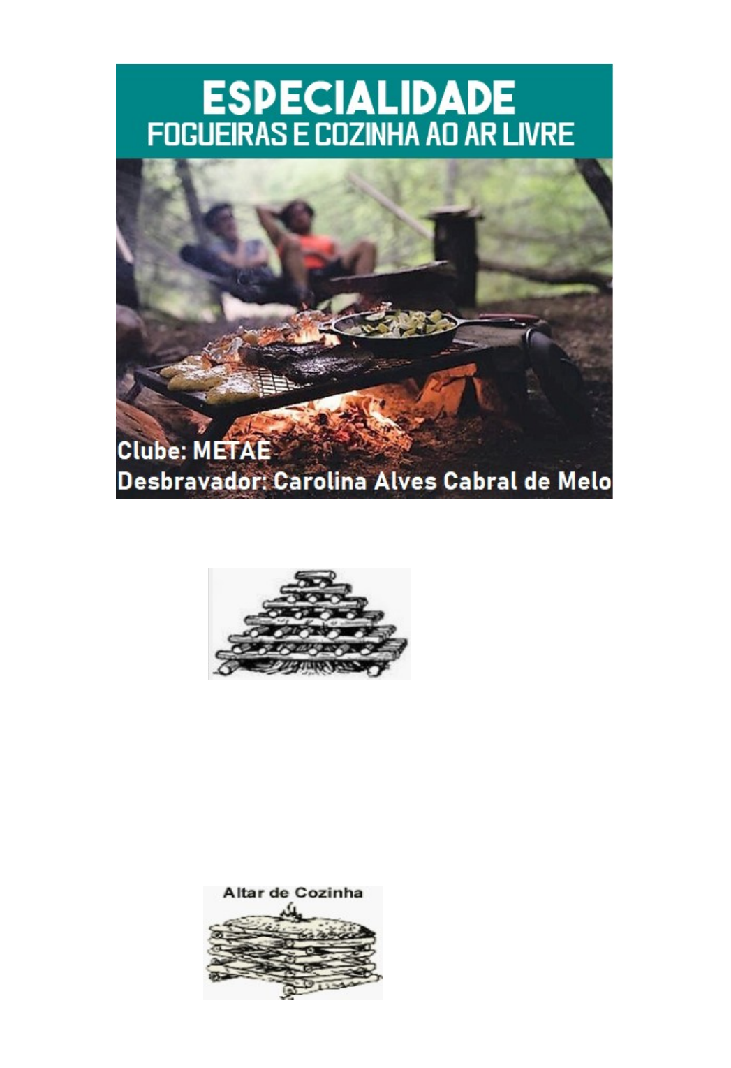 Especialidade de Fogueiras e Cozinha ao Ar Livre 1.Preparar, entre as seguir, cinco diferentes tipos de fogueiras e saber o uso específico de cada uma. Dois destes devem ser próprios para cozinhar alimentos: a)Fogo do Conselho. R: O Fogo de Conselho é uma cerimônia, durante a qual, diante de um fogo simbólico, todos os membros ouvem, com reverência e atenção, conselhos de líderes experientes, narrativas amenas e alegres de outros chefes e líderes, instruem e divertem, expondo fatos e histórias aproveitáveis com fundos espirituais, lembrando anedotas espirituosas e humorismos sadios, interpretando canções, recitando e declamando poesias e prosas de fundo educativo, executando jogos e iniciativas de real proveito para a vida prática. b) Altar de Cozinha. R: Cozinhar. Fica no nível da cintura e é mais fácil de lidar com o cozido. c) Fogo de Trincheira. R: Cozinhar. Fácil de fazer e não deixa vestígios. Bom para locais com muito vento. d) Cercadura de Pedra. ou R: Cozinhar. Também para locais com muito vento. e) Cama Rápida. R: Cozinhar. Prática e fácil de fazer, acompanhado de um fogo estrela ou indígena. f) Fogo Estrela. R: Aquecer. Bom para quando falta madeira. Serve também para cozinhar se tiver suporte. g) Fogo de Caçador. R: Cozinhar. Muito útil no apoio das panelas na hora de preparar o alimento. h) Fogo Refletor. R: Aquecer. Utilizado em regiões com vento e frio. Pode-se cozinhar nele também. 2. Preparar madeira e gravetos com segurança. Item prático. Procurar gravetos e madeira, próprios com o tipo de fogueira que se quer. Preparar a isca com folhas ou palha. gravetinhos finos e depois gravetos maiores. Montar o fogo de maneira a proteger o inicio da chama. Proteger a lenhas e separar os tipos: Lenha grossa, gravetos grossos, gravetos, folhas secas e palha. 3. Demonstrar as técnicas corretas de começar uma fogueira. Item prático. Preparar a isca com palha seca ou folhas secas montando essa isca na base da fogueira. Fazer a Chama inicial e ir colocando gravetos mais grossos até firmar bem o fogo. Depois ir acrescentando lenha de acordo com a necessidade. 4. Começar uma fogueira com um palito de fósforo e mantê-la acesa por, no mínimo, 10 minutos. Item prático. Conhecer e praticar cinco regras de segurança. 1. Não use combustível (álcool, gasolina ou outro solvente) é muito perigoso. 2. Tenha a autorização do dono do local para ascender uma fogueira. 3. Limpe a área, tire todas as folhas secas ou grama seca ou todo material que seja inflamável. 4. Não faça fogueiras com fogo alto muito calor, sendo perigoso fagulhas voarem. 5. Nunca faça fogueira em baixo de árvores. 6. Fogueira para calor, tome cuidado com o vento forte, coloque sua barraca numa posição que você receba calor mas cuidado com a direção do vento 7. Nunca ascenda sua fogueira em local que tenha risco 8. Tenha sempre uma pá para jogar terra sobre a fogueira em caso de emergência. 9. Apague a fogueira com água e com terra ou areia, tenha certeza que você apagou o fogo por completo. 10. Vigie sempre a fogueira, nunca deixe ela sozinha. 11. Tenha sempre alguém de segurança próximo ao local da fogueira com água, areia e pá, para quaisquer emergências. 12. Verifique se o local em que está não é uma reserva ambiental. Nestes lugares é proibido fazer fogo. 13. Não queimar embalagens plásticos no fogo. Leve seu lixo com você. image6.png image7.png image8.png image9.png image10.png image11.png image1.png image2.png image3.png image4.png image5.png