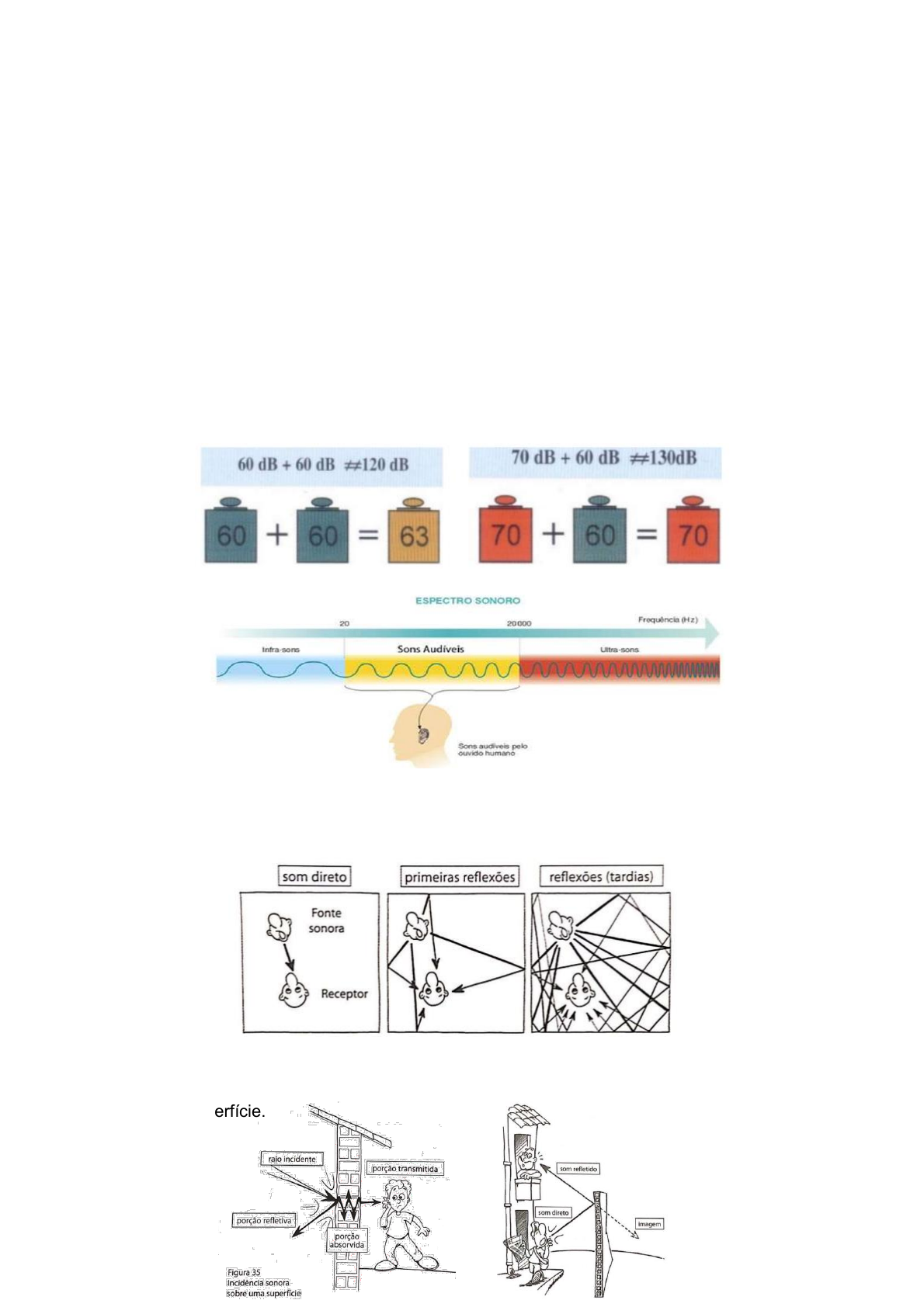 CONORTO ACÚSTICO O QUE É ACÚSTICA? É a ciência que estuda o som. • A Acústica Arquitetônica estuda o fenômeno sonoro que consiste na produção, propagação e recepção do som no espaço construído. SOM: • Sensação produzida no sistema auditivo; • Precisa de um meio líquido, gasoso ou sólido para se propagar; • Não se propaga no vácuo; • Transporta energia, sem que, a rigor, haja transferência de matéria. RUÍDO: • Som incômodo, de natureza negativa, indesejável. PRESSÃO SONORA: • Variação da pressão ambiente, em determinado ponto, expressa em pascal. POTÊNCIA SONORA: • Capacidade de energia possível de ser liberada por uma fonte (w). INTENSIDADE SONORA: • Quantidade de energia transmitida por unidade de superfície normal de deslocamento (w/m²). VELOCIDADE DO SOM: a 20ºC o som se move a 344 m/s. ADIÇÃO DE NÍVEIS SONOROS: ESPECTRO SONORO: FENÔMENOS SONOROS: REFLEXÃO: • O som que nosso ouvido percebe é a composição do som direto da fonte e as subsequentes reflexões sofridas pela onda sonora. • Ao incidir sobre uma superfície, parte da energia sonora é refletida, enquanto outra parte é absorvida pelo material. Normalmente, quanto mais poroso o material, maior a absorção. Cada vez que o raio sonoro sofre uma reflexão, tende a perder energia, em uma porcentagem que varia conforme o coeficiente de absorção do material da superfície. REFRAÇÃO: • Quando a onda passa de um meio para outro com índice de refração diferente; • ocorrendo, dessa forma, a variação da velocidade de propagação e a variação do comprimento de onda, mas nunca a variação da frequência, pois se trata de uma característica da fonte que está emitindo a onda. DIFRAÇÃO: • Capacidade de uma onda sonora transpor obstáculos, mudando sua direção e diminuindo sua intensidade. • Ao passarem o obstáculo, as ondas sofrem um desvio de propagação, transpondo o obstáculo. INTERFERÊNCIA OU SUPERPOSIÇÃO: • Quando ondas de fontes diferentes se chocam. RESONÂNCIA: • Vibração de um corpo com influência de outro (mesma frequência). • Se a estrutura for submetida a uma força externa periódica cuja frequência coincida com uma das frequências naturais, a amplitude da oscilação atingirá valores elevados que podem levar ao colapso da estrutura. Este fenômeno é denominado ressonância. EFEITO DOPPLER: • Movimento relativo entre a fonte sonora e o receptor. • Por exemplo, a sirene de uma ambulância passando por um ouvinte parado na calçada. Nota-se que, à medida que a fonte se aproxima, o som vai se tornando mais agudo e, à medida que a fonte se afasta, o som vai se tornando mais grave. DIFUSÃO: • as ondas sonoras se espalham em diversas direções, promovendo uma distribuição mais uniforme da pressão sonora e um ganho no conforto acústico. REVERBERAÇÃO: • Tempo que uma fonte sonora leva para se dissipar no ambiente; • ocorre quando a diferença entre os instantes de recebimento dos dois sons, propagando-se no ar, é pouco inferior a 0,1 segundos. Ou seja, o obstáculo deve estar a uma distância menor de 17 metros. ECO: • Percepção tardia do som; • ocorre quando os dois sons, direto e refletido, são recebidos num intervalo de tempo superior a 0,1 segundos. Ou seja, o obstáculo que refletirá o som, no ar, deve estar a uma distância maior de 17 metros. TRANSMISSÃO X ABSORÇÃO: ABSORÇÃO SONORA: • Fonte e receptor no mesmo ambiente; • determinante da qualidade acústica interna do local analisado. TRANSMISSÃO SONORA: • Fonte e receptor em ambientes distintos; • Quando o som atinge uma superfície: parte da fonte sonora reflete, parte é retida (vira calor), parte é transmita. • Quando uma onda que se propaga num dado meio encontra uma superfície que separa esse meio de outro (interface), essa onda pode retornar ao meio em que estava se propagando (reflexão) e/ou propagar-se no outro meio (refração). • Ao ar livre, a alteração da velocidade do som, na atmosfera, por variações de temperatura, pode provocar a refração das ondas sonoras, ocasionando um ligeiro desvio na trajetória original. • O ar a 0° C transporta o som a 1180 km/h; à temperatura de uma sala (20° C) o som viaja a 1250 km/h. • Para aumentar o isolamento acústico da parede deve-se aumentar a sua massa, aplicando a Lei de massa para calcular seu desempenho ou deve-se criar outra parede, transformando-a em parede dupla (executar a outra parede, deixando uma câmara de ar entre elas) e nesse caso aplicando a Lei de massa-mola-massa para calcular seu desempenho. RUÍDO AÉREO: • Chama-se ruído aéreo, todo ruído que se propaga pelo ar. A velocidade de transmissão no ar é de aproximadamente 340 m/s (metros por segundo). RUÍDO ESTRUTURAL: • O ruído estrutural se propaga pela estrutura das edificações, sendo gerado pelas vibrações de máquinas e equipamentos ou por impactos que atingem a estrutura do prédio. O ruído estrutural possui uma velocidade de propagação maior do que a do ar, sendo da ordem de: 4.000 a 6.000 m/s. TRATAMENTO ACÚSTICO: • Se procura dar a um recinto, pela finalidade a que se destina, condições que permitam boa audição às pessoas nele presentes. • Compreende o isolamento acústico e/ ou condicionamento acústico. ISOLAMENTO ACÚSTICO: • Pode ser utilizada uma combinação de materiais isolantes, para o caso de queda de nível de som (Δ) elevada; e deve-se levar em conta a natureza dos ruídos ou sons a isolar (aéreos ou de impactos). CONDICONAMENTO ACÚSTICO: • Estabelecido o nível de som do recinto deve ser feito o estudo geométrico-acústico e determinado o tempo de reverberação. MEDIÇÃO DE PRESSÃO SONORA EM ÁREAS HABITACIONAIS: SONÔMETRO: • medidor integrador de nível sonoro. CALIBRADOR DE NÍVEL SONORO: • Utilizado integrado ao sonômetro. MICROFONE: • Outro tipo de medidor. REQUISITOS AMBIENTAIS: • Não se deve realizar medições em 