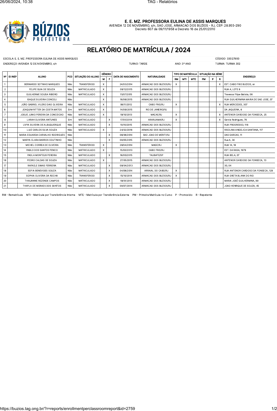 E. E. MZ. PROFESSORA EULINA DE ASSIS MARQUES AVENIDA 12 DE NOVEMBRO, s/n, SAO JOSE, ARMACAO DOS BUZIOS � RJ, CEP� 28.955�290 Decreto 607 de 09/11/1958 e Decreto 16 de 25/01/2010 RELATÓRIO DE MATRÍCULA / 2024 RM � Rematrícula MTI � Matrícula por Transferência Interna MTE � Matrícula por Transferência Externa PM � Primeira Matrícula no Curso P � Promovido R � Repetente ESCOLA� E. E. MZ. PROFESSORA EULINA DE ASSIS MARQUES CÓDIGO� 33027900 ENDEREÇO� AVENIDA 12 DE NOVEMBRO, s/n TURNO� TARDE ANO� 3º ANO TURMA� TURMA 302 Nº ID INEP ALUNO PCD SITUAÇÃO DO ALUNO GÊNERO DATA DE NASCIMENTO NATURALIDADE TIPO DE MATRÍCULA SITUAÇÃO NA SÉRIE ENDEREÇO M F RM MTI MTE PM P R 1 BERNARDO SOTINHO MARQUES Não TRANSFERIDO X 24/03/2014 ARMACAO DOS BUZIOS/RJ X X EST. CABO FRIO BUZIOS, sn 2 FELIPE GUIA DE SOUZA Não MATRICULADO X 09/12/2015 ARMACAO DOS BUZIOS/RJ RUA A, LOTE 8 3 GUILHERME SOUSA RIBEIRO Não MATRICULADO X 15/07/2015 ARMACAO DOS BUZIOS/RJ Travessa Filipe Batista, 06 4 ISAQUE SILVEIRA CONCOLI Não X 16/06/2015 ARMACAO DOS BUZIOS/RJ RUA GUILHERMINA MARIA DE SAO JOSE, 07 5 JOÃO GABRIEL VILERO DIAS OLIVEIRA Não MATRICULADO X 08/11/2012 CABO FRIO/RJ X X RUA MERCEDES, 307 6 JOAQUIM RITTER DA COSTA MATOS Sim MATRICULADO X 14/09/2015 RIO DE JANEIRO/RJ DA JAQUEIRA, 6 7 JOSUE JUNIO PEREIRA DA CONCEICAO Não MATRICULADO X 19/10/2013 MACAE/RJ X X ANTENOR CARDOSO DA FONSECA, 25 8 LARAH OLIVEIRA ANTUNES Sim MATRICULADO X 17/01/2014 ARARUAMA/RJ X X Garcia Rodrigues, 76 9 LIVYA SILVEIRA DE ALBUQUERQUE Não MATRICULADO X 10/10/2015 ARMACAO DOS BUZIOS/RJ RUA PROGRESSO, 116 10 LUIZ CARLOS SILVA SOUZA Não MATRICULADO X 24/02/2016 ARMACAO DOS BUZIOS/RJ RISOLINA ANGELICA SANTANA, 117 11 MARIA EDUARDA CARVALHO RODRIGUES Não X 08/06/2014 SAO JOAO DE MERITI/RJ DAS GARCAS, 11 12 MARYA CLARA BARROS COUTINHO Não X 09/05/2015 ARMACAO DOS BUZIOS/RJ Rua A, 34 13 MICHEL CORREA DE OLIVEIRA Não TRANSFERIDO X 28/04/2014 MAGE/RJ X RUA 14, 18 14 PABLO DOS SANTOS PENCO Não MATRICULADO X 15/03/2013 CABO FRIO/RJ EST. DA RASA, 1979 15 PAOLA MONTEUX PEREIRA Não MATRICULADO X 18/05/2015 TAUBATE/SP RUA BELA, 07 16 PEDRO CALDAS DE SOUZA Não MATRICULADO X 27/05/2015 ARMACAO DOS BUZIOS/RJ ANTENOR CARDOSO DA FONSECA, 13 17 RAFAELE SIMAS FERREIRA Não MATRICULADO X 09/04/2013 ARMACAO DOS BUZIOS/RJ 30, 04 18 SOFIA BENEVIDES SOUZA Não MATRICULADO X 04/08/2014 ARRAIAL DO CABO/RJ X RUA ANTENOR CARDOSO DA FONSECA, 129 19 SOPHIA OLIVEIRA DA ROCHA Não TRANSFERIDO X 15/10/2014 ARMACAO DOS BUZIOS/RJ X RUA GRETA BLANK DO RIO 20 THAUANNE REZENDE CAMPOS Não MATRICULADO X 19/01/2013 ARMACAO DOS BUZIOS/RJ MARIA JOSÉ GUILHERMINA, 99 21 THAYLA DE MORAES DOS SANTOS Não MATRICULADO X 09/07/2014 ARMACAO DOS BUZIOS/RJ JOAO HENRIQUE DE SOUZA, 45 26/06/2024, 10:38 TAG - Relatórios https://buzios.tag.ong.br/?r=reports/enrollmentperclassroomreport&id=2759 1/2 ________________________________________________________ ASSINATURA DO DIRETOR�A� RM � Rematrícula MTI � Matrícula por Transferência Interna MTE � Matrícula por Transferência Externa PM � Primeira Matrícula no Curso P � Promovido R � Repetente ______________________________ Armacao Dos Buzios, 26 De Junho de 2024. ________________________________________________________ ASSINATURA DO SECRETÁRIO�A� Documento autenticado digitalmente pelo sistema de informação TAG em: 26/06/2024 � 10�36h e deve ser conferido na Internet no endereço http://verificador.tag.ong.br Código de Verificação: 330279002406261036�21 Nº ID INEP ALUNO PCD SITUAÇÃO DO ALUNO GÊNERO DATA DE NASCIMENTO NATURALIDADE TIPO DE MATRÍCULA SITUAÇÃO NA SÉRIE ENDEREÇO M F RM MTI MTE PM P R 22 YASMIN DE OLIVEIRA MOREIRA Não MATRICULADO X 06/11/2015 ARMACAO DOS BUZIOS/RJ DOS SUSPIROS, 27 23 MARIANNA KALY GABRIEL DE ABREU Não TRANSFERIDO X 21/09/2015 FORTALEZA/CE TRAV. GAROPA, 17 24 KAMYLLA JOANA MACHADO SILVA Não MATRICULADO X 06/01/2013 CABO FRIO/RJ GUILHERMINA MARIA DE SÃO JOSÉ, 14 26/06/2024, 10:38 TAG - Relatórios https://buzios.tag.ong.br/?r=reports/enrollmentperclassroomreport&id=2759 2/2