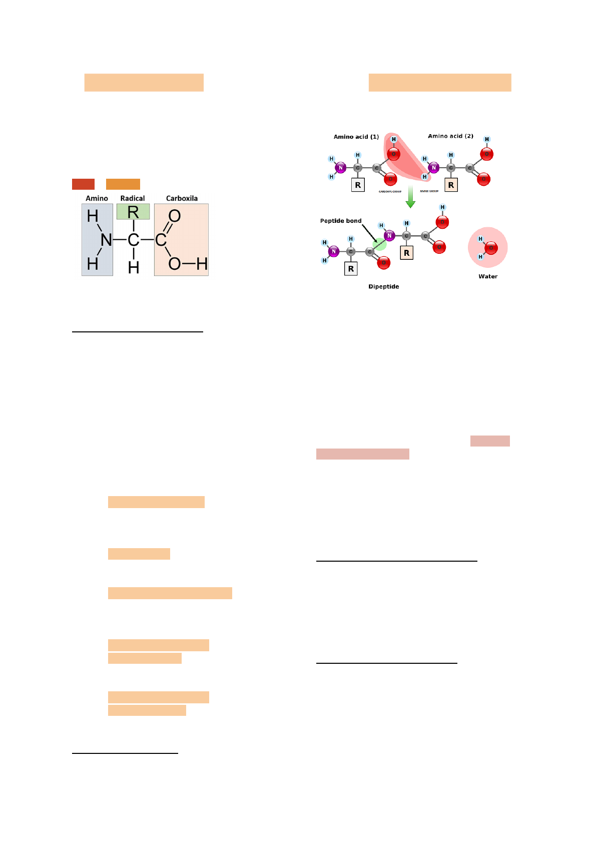 Bioquímic� - Revisã� p�. 2 Aminoácido Quebrando um pouco temos: Amino -> NH2 Ácido carboxílico -> COOH NH2 + COOH = Aminoácido O que é o R na estrutura? Significa Radical, ou seja, pode variar. TIPOS DE AMINOÁCIDOS Aminoácidos naturais: o corpo produz Aminoácidos essenciais: Alimentação Aminoácidos semi-essenciais: produzidos pelo corpo em pequena quantidade, então precisa ser consumida na alimentação. Ex.: Histidina e Arginina. Classificaçã� d� acord� co� � grup� R ● Alifáticos apolares (glicina, alanina, prolina, valina, leucina, isoleucina e metionina) ● Aromáticos (fenilalanina, tirosina e triptofano) ● Polares não carregados (serina, treonina, cisteína, asparagina e glutamina) ● Polares carregados positivamente (lisina, histidina e arginina) ● Polares carregados negativamente (aspartato e glutamato). LIGAÇÃO PEPTÍDICA É a ligação entre os aminoácidos. Essa ligação vai liberar uma molécula de água, já que H2O é o mesmo que H + OH H-> Hidrogênio OH-> Hidroxila A hidroxila do ácido carboxílico (COOH) + o hidrogênio no grupo Amina (NH2) gera uma molécula de água. Essa ligação é conhecida por síntese por desidratação. Sabendo disso, o que é a PROTEÍNA? A proteína é um polipeptídeo, ou seja, ela é formada por vários aminoácidos. A polimerização de aminoácidos. CONTAGEM DE AMINOÁCIDOS Quantidades de ligações peptídicas = quantidades de aminoácidos + 1 Quantidade de aminoácidos = quantidade de ligações peptídicas - 1 FUNÇÕES DAS PROTEÍNAS ● Energética ● Estrutural ● Transporte ● Nutrição ● Atividade enzimática ● Defesa ESTRUTURAS Primária: linear Secundária: hélice Terciária: globular Quaternária: junção de proteínas globulares