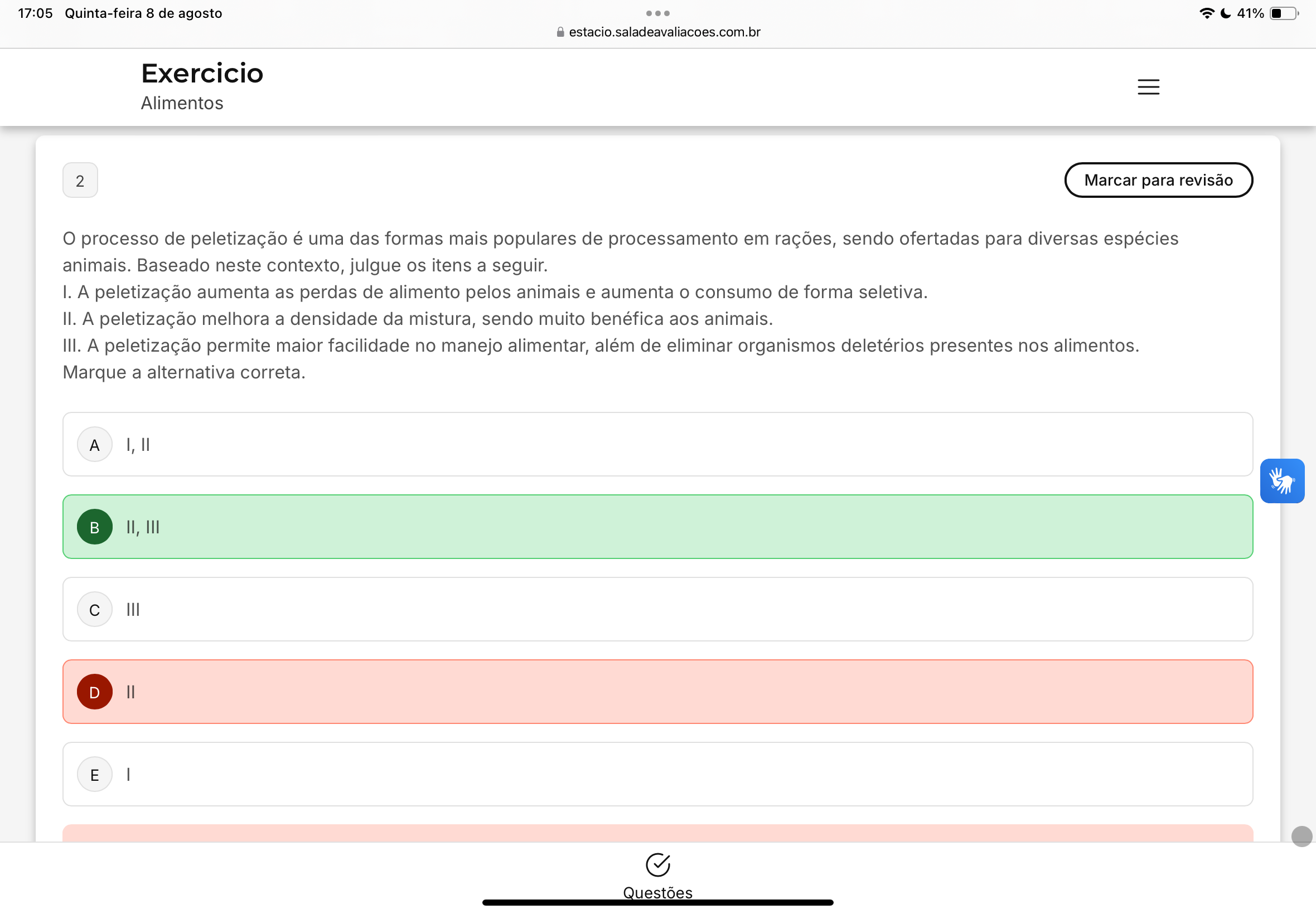17:05 Quinta-feira 8 de agosto 41% 8 estacio.saladeavaliacoes.com.br Exercicio Alimentos 2 Marcar para revisão processo de peletização é uma das formas mais populares de processamento em rações, sendo ofertadas para diversas espécies animais. Baseado neste contexto, julgue os itens a seguir. I. A peletização aumenta as perdas de alimento pelos animais e aumenta o consumo de forma seletiva. II. A peletização melhora a densidade da mistura, sendo muito benéfica aos animais. III. A peletização permite maior facilidade no manejo alimentar, além de eliminar organismos deletérios presentes nos alimentos. Marque a alternativa correta. A I, C III D E Questões