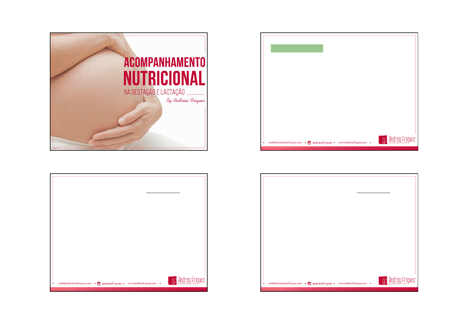 26/06/2019 1 | Revisar aspectos nutricionais e metabólicos da gestação. | Aplicar, de forma prática, os conhecimentos adquiridos sobre gestação, programação metabólica, nutrição. | Propor estratégias de ação para as situações clínicas mais comuns no consultório. | Promover discussão baseada no raciocínio clínico crítico, na abordagem preventiva e na promoção da saúde. OBJETIVOS DA AULA ACOMPANHAMENTO NUTRICIONAL NA GESTAÇÃO & LACTAÇÃO By Andreia Friques ● Gestação e seus desafios ● Acompanhamento nutricional Aspectos fisiológicos Nutrientes fundamentais Consultas Anamnese Recomendações Exames Laboratoriais ACOMPANHAMENTO NUTRICIONAL NA GESTAÇÃO & LACTAÇÃO By Andreia Friques ● Gestação e seus desafios ● Acompanhamento nutricional Aspectos fisiológicos Nutrientes fundamentais Consultas Anamnese Recomendações Exames Laboratoriais 26/06/2019 2 Impacto nos mecanismos de controle fisiológicos Crescimento Metabolismo Controle do Apetite Programações das DCNT Período reprodutivo NutriçãoNutrição Estado nutricional inadequado = Prejuízo para a saúde materno infantil CONSEQUÊNCIAS NA VIDA ADULTA Cardiocirculatórias GESTAÇÃO Período de Transformações Gastrointestinais Hematológicas Respiratórias Metabólicas Emocionais Sociais Espirituais Psicológicas Comportamentais ● DESAFIOS NA REALIZAÇÃO DE PESQUISAS DE ALTA QUALIDADE NA GESTAÇÃO Muitas mudanças fisiológicas que acontecem durante o período. Eating for two? The unresolved question of optimal diet in pregnancy. Am J Clin Nutr. 2014 Variações individuais na adaptação materna à gestação. Muitas janelas sobre os impactos da nutrição e o desenvolvimento. Questões éticas e práticas da pesquisa na gestação. ● DESAFIOS NA REALIZAÇÃO DE PESQUISAS DE ALTA QUALIDADE NA GESTAÇÃO Muitas mudanças fisiológicas que acontecem durante o período. Variações individuais na adaptação materna à gestação. Muitas janelas sobre os impactos da nutrição e o desenvolvimento. Questões éticas e práticas da pesquisa na gestação. Eating for two? The unresolved question of optimal diet in pregnancy. Am J Clin Nutr. 2014 - RESULTADO - MUITAS PERGUNTAS AINDA SEM RESPOSTAS! 26/06/2019 3 “ No dramático momento que uma célula masculina, microscópica e serpenteante, encaminha-se para uma célula ovo muito maior e liga-se a ela, um ser humano começa a existir e a nutrição tem início.” Roger J. Williams ACOMPANHAMENTO NUTRICIONAL NA GESTAÇÃO & LACTAÇÃO By Andreia Friques ● Gestação e seus desafios ● Acompanhamento nutricional Aspectos fisiológicos Nutrientes fundamentais Consultas Anamnese Recomendações Exames Laboratoriais Obesidade Fumo Idade Exposição Química Metilação em células do cordão umbilical Imprinting metabólico em diversos genes Incapacidade do esperma em reparar o dano ao DNA Ca e doenças neurológicas Fluido oviductal | ENM | Desenvolvimento adaptado Dieta na concepção: MAIOR impacto na programação metabólica Parenting from before conception, Science, 2014 26/06/2019 4 Desequilíbrio nutricional| efeito persiste através da implantação, influencia o desenvolvimento placentário e capacidade de transferência de nutrientes RN| maior ganho de peso, mais chances de hipertensão e transtornos de ansiedade Desequilíbrio nutricional| efeito persiste através da implantação, influencia o desenvolvimento placentário e capacidade de transferência de nutrientes RN| maior ganho de peso, mais chances de hipertensão e transtornos de ansiedade - MICROCOSMOS - REFLETE O MUNDO EXTERIOR “Estímulo ou agravo em fases críticas do desenvolvimento que leva a efeitos futuros na fisiologia ou morfologia de determinado órgão.” ● PROGRAMAÇÃO METABÓLICA Gunter Doner, 1974. 20h após a fusão 5º dia 26/06/2019 5 Sangue da mãe começa a alimentar o filho! PROGESTERONA| prepara o endométrio para alimentar o ovo (adicional de glicogênio e outras substâncias nutritivas). BLASTOCISTO Faz contato com o endométrio: células do trofoblasto destroem as células endomentriais Difusão simples: Eletrólitos (Na, K, Cl), AG livres, Gases (O2 CO2), V. lipossolúveis Difusão facilitada: Glicose Transporte ativo: PTN carreadora: Aas, V. hidros., Ca, Fe ● NUTRIÇÃO INTRA-UTERINA PRIMEIRA SEMANA APÓS A IMPLANTAÇÃO| células endometriais (até 8 semanas) UMA SEMANA APÓS A IMPLANTAÇÃO| células trofoblásticas subjacentes proliferam e com células do endométrio materno, formam a placenta e diversas membranas. Começa a fornecer nutrientes a partir do 16º dia de fecundação. PLACENTA | Difusão de substâncias alimentares do sangue da mãe para o feto | Difusão dos produtos de excreção do feto para a mãe | Produção de substâncias e hormônios: crescimento e desenvolvimento do feto ● PLACENTA ◌ Secretado concomitantemente ao desenvolvimento das células trofoblásticas ◌ Impede a involução normal do corpo lúteo ◌ Auxilia o corpo lúteo a secretar estrogênios e progesterona, enquanto a placenta ainda não os produz em quantidade suficiente ◌ Detectável no sangue 8 dias após a fecundação, 15 dias na urina ● PRODUÇÃO DE HORMÔNIOS... Gonadotropina Coriônica Humana (HCG) 26/06/2019 6 ◌ Aumenta secreções das trompas uterinas e do útero: nutrientes para mórula e blastocisto ◌ Desenvolvimento de células deciduais no endométrio: nutrição do embrião ◌ Diminui a contratilidade do útero gravídico, relaxamento da musculatura lisa: evita abortamento ◌ Relaxamento da musculatura lisa do intestino (constipação): maior tempo para absorção de nutrientes ◌ Favorece deposição de gordura, interfere no metabolismo de ácido fólico e participa da mamogênese ● ... PROGESTERONA ● ... ◌Mamogênese ◌ Deposição de proteínas nos tecidos ◌Menor utilização de glicose pela mãe (mais disponível para o feto) ◌ Liberação de ácidos graxos livres das reservas adiposas da mãe (alterna