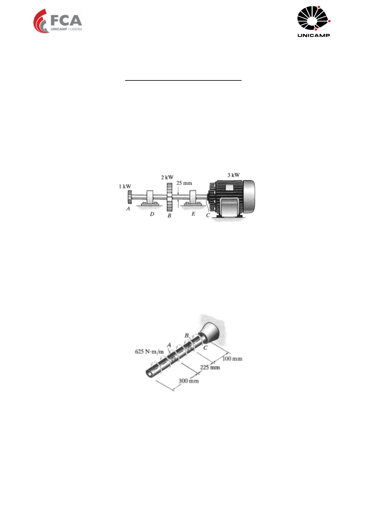Universidade Estadual de Campinas FCA - Faculdade de Ciências Aplicadas Cursos de Engenharia de Produção e Manufatura Lista 5 - Torção dos Eixos Circulares 1. O eixo maciço de aço AC tem diâmetro de 25 mm e está apoiado nos mancais lisos em D e E. O eixo está acoplado a um motor em C, que transmite 3kW de potência ao eixo quando está girando a 50 rev/s. Se as engrenagens A e B absorverem 1 kW e 2 kW, respectivamente, determine a tensão de cisalhamento máxima desenvolvida no eixo ao interior das regiões AB e BC. O eixo é livre para girar em seus mancais de apoio D e E. 2. Se um tubo de cobre tem diâmetro externo de 62,5 mm e diâmetro interno de 57,5 mm. Se estiver firmemente preso à parede em C e for submetido ao torque uniformemente distribuído, como mostra a figura abaixo, determine a tensão de cisalhamento desenvolvida nos pontos A e B. Esses pontos se encontram na superfície externa do tubo. Faça um rascunho da tensão de cisalhamento sobre os elementos de volume localizados em A e B. Respostas: 1) (τ 𝐴𝐵 ) 𝑚á𝑥 = 1, 04 𝑀𝑃𝑎 (τ 𝐵𝐶 ) 𝑚á𝑥 = 3, 11 𝑀𝑃𝑎 2) τ 𝐴 = 13, 79 𝑀𝑃𝑎 τ 𝐵 = 24, 14 𝑀𝑃𝑎