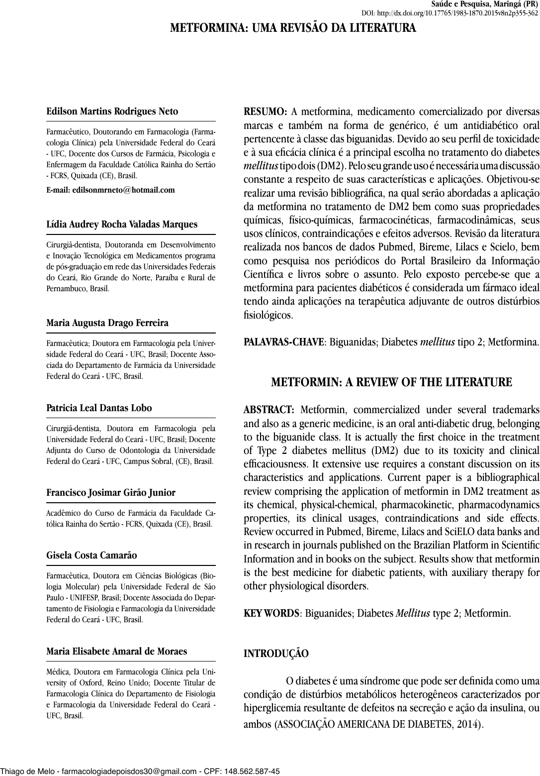 Edilson Martins Rodrigues Neto Farmacêutico, Doutorando em Farmacologia (Farma- cologia Clínica) pela Universidade Federal do Ceará - UFC, Docente dos Cursos de Farmácia, Psicologia e Enfermagem da Faculdade Católica Rainha do Sertão - FCRS, Quixada (CE), Brasil. E-mail: edilsonmrneto@hotmail.com Lídia Audrey Rocha Valadas Marques Cirurgiã-dentista, Doutoranda em Desenvolvimento e Inovação Tecnológica em Medicamentos programa de pós-graduação em rede das Universidades Federais do Ceará, Rio Grande do Norte, Paraíba e Rural de Pernambuco, Brasil. Maria Augusta Drago Ferreira Farmacêutica; Doutora em Farmacologia pela Univer- sidade Federal do Ceará - UFC, Brasil; Docente Asso- ciada do Departamento de Farmácia da Universidade Federal do Ceará - UFC, Brasil. Patricia Leal Dantas Lobo Cirurgiã-dentista, Doutora em Farmacologia pela Universidade Federal do Ceará - UFC, Brasil; Docente Adjunta do Curso de Odontologia da Universidade Federal do Ceará - UFC, Campus Sobral, (CE), Brasil. Francisco Josimar Girão Junior Acadêmico do Curso de Farmácia da Faculdade Ca- tólica Rainha do Sertão - FCRS, Quixada (CE), Brasil. Gisela Costa Camarão Farmacêutica, Doutora em Ciências Biológicas (Bio- logia Molecular) pela Universidade Federal de São Paulo - UNIFESP, Brasil; Docente Associada do Depar- tamento de Fisiologia e Farmacologia da Universidade Federal do Ceará - UFC, Brasil. Maria Elisabete Amaral de Moraes Médica, Doutora em Farmacologia Clínica pela Uni- versity of Oxford, Reino Unido; Docente Titular de Farmacologia Clínica do Departamento de Fisiologia e Farmacologia da Universidade Federal do Ceará - UFC, Brasil. METFORMINA: UMA REVISÃO DA LITERATURA RESUMO: A metformina, medicamento comercializado por diversas marcas e também na forma de genérico, é um antidiabético oral pertencente à classe das biguanidas. Devido ao seu perfil de toxicidade e à sua eficácia clínica é a principal escolha no tratamento do diabetes mellitus tipo dois (DM2). Pelo seu grande uso é necessária uma discussão constante a respeito de suas características e aplicações. Objetivou-se realizar uma revisão bibliográfica, na qual serão abordadas a aplicação da metformina no tratamento de DM2 bem como suas propriedades químicas, físico-químicas, farmacocinéticas, farmacodinâmicas, seus usos clínicos, contraindicações e efeitos adversos. Revisão da literatura realizada nos bancos de dados Pubmed, Bireme, Lilacs e Scielo, bem como pesquisa nos periódicos do Portal Brasileiro da Informação Científica e livros sobre o assunto. Pelo exposto percebe-se que a metformina para pacientes diabéticos é considerada um fármaco ideal tendo ainda aplicações na terapêutica adjuvante de outros distúrbios fisiológicos. PALAVRAS-CHAVE: Biguanidas; Diabetes mellitus tipo 2; Metformina. METFORMIN: A REVIEW OF THE LITERATURE ABSTRACT: Metformin, commercialized under several trademarks and also as a generic medicine, is an oral anti-diabetic drug, belonging to the biguanide class. It is actually the first choice in the treatment of Type 2 diabetes mellitus (DM2) due to its toxicity and clinical efficaciousness. It extensive use requires a constant discussion on its characteristics and applications. Current paper is a bibliographical review comprising the application of metformin in DM2 treatment as its chemical, physical-chemical, pharmacokinetic, pharmacodynamics properties, its clinical usages, contraindications and side effects. Review occurred in Pubmed, Bireme, Lilacs and SciELO data banks and in research in journals published on the Brazilian Platform in Scientific Information and in books on the subject. Results show that metformin is the best medicine for diabetic patients, with auxiliary therapy for other physiological disorders. KEY WORDS: Biguanides; Diabetes Mellitus type 2; Metformin. INTRODUÇÃO O diabetes é uma síndrome que pode ser definida como uma condição de distúrbios metabólicos heterogêneos caracterizados por hiperglicemia resultante de defeitos na secreção e ação da insulina, ou ambos (ASSOCIAÇÃO AMERICANA DE DIABETES, 2014). Saúde e Pesquisa, Maringá (PR) DOI: http://dx.doi.org/10.17765/1983-1870.2015v8n2p355-362 Thiago de Melo - farmacologiadepoisdos30@gmail.com - CPF: 148.562.587-45 Conteúdo licenciado para Thaís Alves Silva - 118.951.636-50 356 Metformina: uma revisão da literatura Revista Saúde e Pesquisa, v. 8, n. 2, p. 355-362, maio/ago. 2015 - ISSN 1983-1870 - e-ISSN 2176-9206 O diabetes mellitus tipo dois (DM2) é a manifestação majoritária do diabetes, cursando com 90% dos casos em nível mundial. No ano de 2013 foi declarado, pela Federação Internacional de Diabetes, que 382 milhões de pessoas no mundo convivem com a doença, de forma que 46% destas não foram diagnosticadas; há uma previsão de 592 milhões de portadores para o ano de 2035 (IDF, 2013). Em 2012 a Sociedade Brasileira de Diabetes anunciou que 12.054.827 indivíduos eram diabéticos no país (SOCIEDADE BRASILEIRA DE DIABETES, 2014). Essa condição crônica aumenta o risco de desenvolvimento de doenças cardíacas, acidente vascular cerebral e complicações microvasculares. Como manifestações frequentes, pode-se citar a cegueira, falência renal e neuropatia periférica. Atualmente o DM2 é um dos principais agravos de saúde pública em nível global, tendo grande impacto na economia dos governos e dos indivíduos portadores (ASHCROFT; RORSMAN, 2012). Vários mecanismos estão envolvidos na fisiopatologia da doença, pelo menos oito irregularidades metabólicas ou hormonais podem contribuir para o desenvolvimento da hiperglicemia, entre elas a baixa secreção de insulina, o efeito diminuído da incretina, alta lipólise, reabsorção de glicose nos rins, baixa reabsorção de glicose no músculo esquelético, disfunção de neurotransmissores, produção hepática de glicose aumentada e aumento na secreção de glucagon (DEFRONZO; DAVIDSON