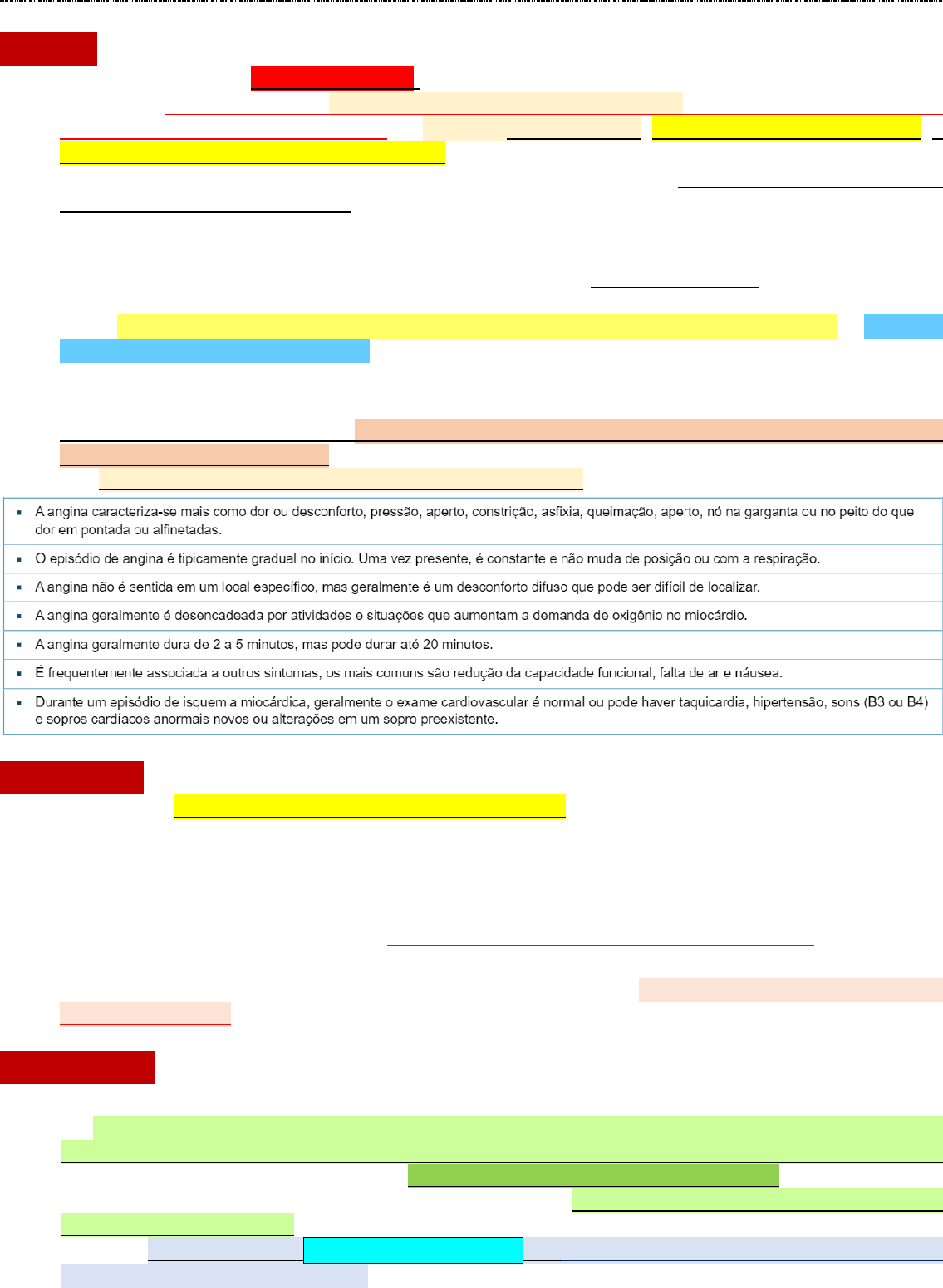 Angina estável ●Conceito: A angina estável é uma SÍNDROME CLÍNICA; Geralmente definida como um desconforto torácico ou áreas adjacentes (tórax, epigástrio, mandíbula, ombro, dorso ou membros superiores) que ocorre de forma previsível (duração média de 1 a 5 minutos) e reproduzível em determinado nível de esforço, quando surge uma incompatibilidade entre as necessidades de oxigênio do miocárdio e o suprimento de oxigênio do miocárdio, sendo atenuada com a interrupção do fator provocador ou nitroglicerina, cujas características NÃO se alteram no período de 2 meses. A angina caracteriza-se mais como dor ou desconforto, pressão, aperto, constrição, asfixia, queimação, aperto, nó na garganta ou no peito. A angina não é sentida em local específico, mas geralmente é um desconforto DIFUSO que pode ser difícil de localizar. Sendo tipicamente desencadeada ou agravada com a atividade física ou estresse emocional, e atenuada com uso de nitroglicerina e derivados; Possui curta duração, em torno de alguns minutos (2-5 minutos). Obs. Mas pode durar até 20 min. Caracteriza-se pela ocorrência de episódios reversíveis de desequilíbrio entre a oferta de sangue e a demanda metabólica miocárdica, acometendo, geralmente, portadores de doença arterial coronariana (DAC) com comprometimento de, pelo menos, uma artéria epicárdica. ●Epidemiologia: A prevalência AUMENTA COM A IDADE EM AMBOS OS SEXOS: 5-7% entre 45-64 anos; 10-12% entre 65 e 84 anos; Esse aumento da prevalência com a idade é decorrente do aumento da fragilidade vascular, pela comorbidades, diminuição da complacência vascular. A angina estável, em 50% dos casos, é o quadro clínico inicial da doença cardíaca isquêmica. A angina estável acomete, geralmente, portadores de doença arterial coronariana (DAC) com comprometimento de, pelo menos, uma artéria epicárdica, sendo a expressão clínica mais frequente da isquemia miocárdica. ●Fatores de risco: Tabagismo, idade, sedentarismo, dieta, menopausa.... Os fatores de risco cardiovascular clássicos como HIPERTENSÃO ARTERIAL, HIPERCOLESTEROLEMIA, DIABETES MELITO, SEDENTARISMO, OBESIDADE, TABAGISMO E HISTÓRIA FAMILIAR DE DAC PRECOCE (homens < 55 anos e mulheres < 65 anos), além de implicados no aparecimento da DAC, exercem influência adversa no prognóstico daqueles com doença já estabelecida, presumivelmente pela progressão acelerada do processo aterosclerótico. A angina é desencadeada por FATORES PROVOCADORES que incluem atividades e situações que aumentam a demanda de oxigênio no miocárdio, sendo: Atividade física, frio, estresse emocional, relações sexuais, refeições ou ao deitar por aumento no retorno venoso e estresse parietal. ●Fisiopatologia: As várias apresentações clínicas da angina estável estão relacionadas com diversos mecanismos fisiopatológicos que incluem: Obstrução por placas ateroscleróticas das artérias coronárias epicárdicas. Vasospasmo focal ou difuso de artérias coronárias. Doença microvascular. Disfunção ventricular esquerda secundária a infarto do miocárdico prévio e/ou miocárdio hibernante (isquemia crônica). Nos faz supor que as ALTERAÇÕES DO TÔNUS VASCULAR, com aumento deste, ou ALTERAÇÕES DAS RESPOSTAS DA MICROCIRCULAÇÃO, podem provocar alterações de fluxo coronariano. Dois mecanismos patogenéticos principais podem resultar em isquemia miocárdica e angina no contexto crônico: a chamada ANGINA DE DEMANDA, que é causada pelo aumento nas necessidades de oxigênio do miocárdio e na carga de trabalho; e a ANGINA DE SUPRIMENTO, que é causada pela redução da oferta de oxigênio ao tecido miocárdico. A ANGINA DE DEMANDA é consequente às necessidades aumentadas de oxigênio do miocárdio que ocorrem com o aumento da atividade física, emoção ou estresse. Em um paciente com perfusão miocárdica diminuída devido ao estreitamento aterosclerótico crônico de uma artéria coronária, essa demanda aumentada pode causar angina. Outros fatores precipitantes extracardíacos da angina incluem as demandas metabólicas excessivas impostas por febre, tireotoxicose, anemia grave por perda de sangue, taquicardia de qualquer etiologia, hipoglicemia e dor. Portanto, as condições clínicas associadas ao aumento da demanda miocárdica de oxigênio incluem qualquer situação em que haja aumento de catecolaminas ou tônus simpático, como com esforço vigoroso ou estresse mental, taquicardia por qualquer motivo, hipertensão, hipertrofia ventricular esquerda (com doença cardíaca hipertensiva ou estenose aórtica) e hipertrofia ventricular direita (com hipertensão pulmonar). Em pacientes com angina de demanda – na qual os aumentos nas necessidades de oxigênio do miocárdio são desencadeados por aumentos na frequência cardíaca, pressão arterial e contratilidade – agentes terapêuticos que reduzem a frequência cardíaca e a tensão da parede, como betabloqueadores ou antagonistas de cálcio não di-hidropiridínicos, serão frequentemente a terapia com maior benefício clínico. Por outro lado, a ANGINA DE SUPRIMENTO pode ocorrer em pacientes com SCA ou cardiopatia isquêmica estável por reduções transitórias na oferta de oxigênio ao miocárdio como consequência de constrição coronariana com estenose coronariana dinâmica resultante. Quando existe estreitamento luminal coronariano devido à aterosclerose, trombos plaquetários e leucócitos sobrepostos podem produzir substâncias vasoconstritoras, como serotonina e tromboxano A2, enquanto danos endoteliais em artérias coronárias “doentes” diminuem a produção de substâncias vasodilatadoras, como óxido nítrico e adenosina. O resultado é uma resposta vasoconstritora fisiológica anormal ao exercício e outros estímulos, como a adenosina administrada exogenamente ou a resposta vasoconstritora paradoxal à hiperemia reativa mediada por fluxo típica associada à compressão da artéria braquia