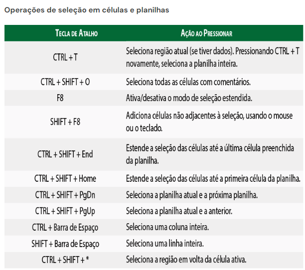 Operações de seleção em células e planilhas TECLA DE ATALHO AO PRESSIONAR Seleciona região atual (se tiver dados). Pressionando CTRL + T CTRL T novamente, seleciona a planilha inteira. CTRL + SHIFT + 0 Seleciona todas as células com comentários. F8 Ativa/desativa 0 modo de seleção estendida. Adicional células não adjacentes à seleção, usando 0 mouse SHIFT+ F8 ou 0 teclado. Estende a seleção das células até a última célula preenchida CTRL + SHIFT + End da planilha. CTRL + SHIFT + Home Estende a seleção das células até a primeira célula da planilha. CTRL + SHIFT + PgDn Seleciona a planilha atual e a próxima planilha. CTRL + SHIFT + PgUp Seleciona a planilha atual e a anterior. CTRL + Barra de Espaço Seleciona uma coluna inteira. SHIFT + Barra de Espaço Seleciona uma linha inteira. CTRL + SHIFT Seleciona a região em volta da célula ativa.