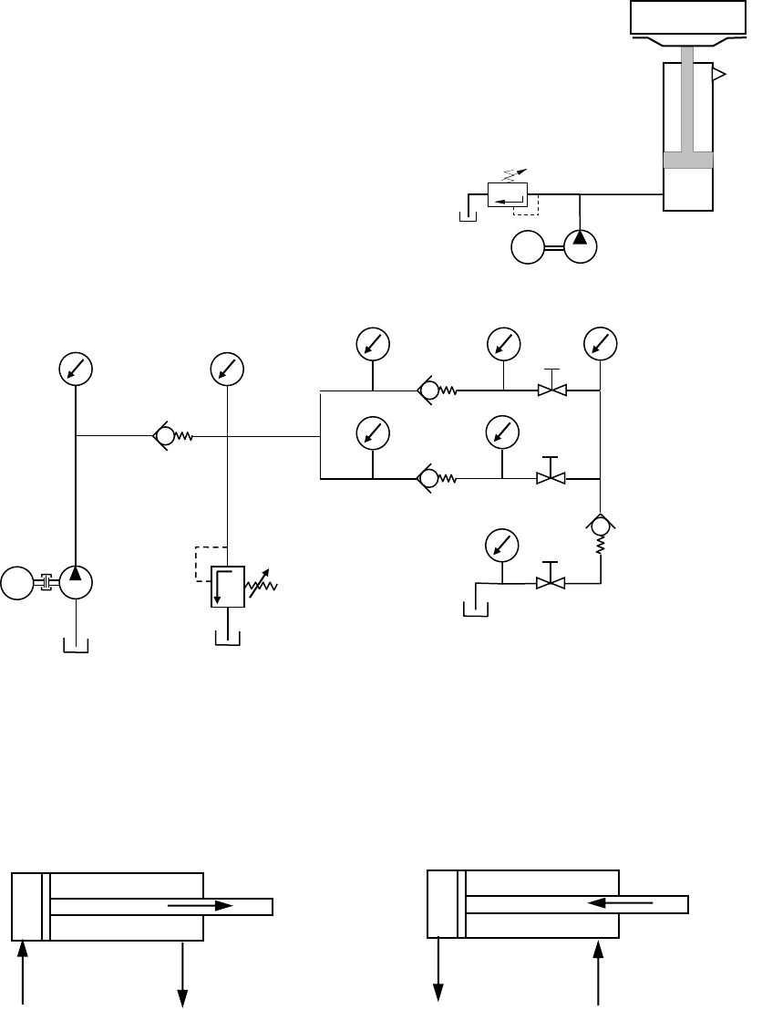 M 2 ton. =30mm Questões de Hidráulica 1) Calcular a área de um êmbolo cujo diâmetro é de 20cm 2) Calcular a área de um êmbolo do lado da haste (anular), sabendo-se que possui um diâmetro medido igual a 18cm e o raio da haste é de 6cm. 3) Sabendo-se que a área do êmbolo é de 200cm2 e que a força ou carga a ser deslocada é de 8000kgf, determine a pressão necessária de trabalho. 4) Necessitando-se elevar uma carga de 20 toneladas e sabendo-se que o sistema hidráulico é capaz de trabalhar folgadamente a 50kgf/cm2, pergunta-se: qual o diâmetro interno deverá ter o cilindro, para realizar o trabalho? 5) O que ocorre a um cilindro, cuja área do êmbolo é de 100cm2 e a área anular, lado da haste, é de 50cm2, se as mesmas forem sujeitas à mesma pressão de 100kgf/cm2? 6) O que determina basicamente a velocidade de um atuador, e o que determina a sua força? 7) O que diz a lei da Continuidade? 8) O que é a equação de Bernoulli? E o que se entende dela? 9) Em sistemas hidráulicos comerciais, as bombas suportam pressão máxima de 210bar. Verifique se a bomba do circuito abaixo suportaria a pressão imposta pelo sistema. 10) Qual deve ser a vazão da bomba do circuito ao lado se o curso da haste é de 1 metro e ela deve elevar as cargas em um minuto? 11) Que carga pode elevar um cilindro se a pressão de trabalho é 30bar e o diâmetro de seu êmbolo é de 40mm? 12) Determine as pressões nos manômetros abaixo supondo (a) registro III fechado e o outros abertos; (b) suponha agora os registros I e III abertos e o II fechado; (c) suponha os registros II e III abertos e o I fechado. 13) Calcule a vazão mínima de uma bomba, para que ela avance um cilindro 32-20-200 para que ele complete seu curso em 5 segundos. Nota: um cilindro é especificado pelo diâmetro do êmbolo, da haste e curso, em milímetros. 14) Caso a vazão da bomba seja superior à requerida pelo cilindro, como se controla então sua velocidade? 15) Calcule a vazão induzida de avanço e de retorno de um cilindro,sabendo que a vazão da bomba é de 30LPM, a Apistão=30cm2 e Aanular=18cm2, como mostra a figura abaixo. E 8 bar D A 5 bar M 7 bar 60 bar C F H 15 bar G B III II I Q=20LPM Qbomba Qia Qbomba Qir Exercício 01 Um cilindro de dupla ação tem a função de abrir e fechar a porta de uma caldeira e deverá ser controlado por uma válvula direcional com retorno por mola , sendo que , no acionamento promove-se o avanço , no desacionamento, o retorno . Projetar o circuito hidráulico para o dispositivo descrito acima Porta de Caldeira Exercício 02 Um Atuador comanda a operação de descarga de um silo para armazenagem. Deve-se poder comandar a abertura e o fechamento da porta do silo, sabendo-se que o produto armazenado pode fluir em maior ou menor quantidade , em função da posição do cilindro que controla a abertura. Projetar o esquema de comando hidráulico para o dispositivo descrito acima . Silo Exercício 03 Um Elevador de carga deverá transportar volumes de grande peso da linha de produção da plataforma A, para o estoque B ou C . Durante a retirada do material a plataforma deve ficar hidraulicamente fixada Projetar o esquema de comando hidráulico para o dispositivo descrito. Elevador Exercício 04 Numa morsa são fixadas peças de diferentes materiais para posterior furação. A pressão de fixação deverá ser regulada em função do material da peça. Projetar o circuito hidráulico para o dispositivo descrito acima . Morsa Hidráulica Exercício 05 Em um forno para tratamento térmico ,, o movimento de abertura e fechamento da porta é realizado por meio de um cilindro de dupla ação . A Abertura da porta deve ser em velocidade normal e o fechamento , executado lentamente , de forma a não promover impacto durante o processo. Projetar o esquema de comando hidráulico para o dispositivo descrito acima. Forno de Tratamento Térmico Exercício 06 Uma retífica tem o movimento da mesa realizado por um cilindro hidráulico. No processo não poderá existir alteração de velocidade em função da resistência oferecida pela peça no momento da usinagem . Por este motivo , as velocidades de avanço e retorno deverão ser compensadas quanto a pressão . Projetar o esquema de comando hidráulico para o dispositivo descrito acima. Retífica Exercício 07 Em um dispositivo, um cilindro de dupla ação está acoplado a uma esteira para executar o transporte de carga de uma plataforma à outra. A esteira é comandada por um motor hidráulico que gira em sentido único . Os movimentos se dão através de uma válvula 4/2 vias, sendo que o motor funcionará somente quando o cilindro estiver totalmente avançado. Projetar o esquema de comando hidráulico para o dispositivo descrito acima . Plataforma Automática Gabarito: 01) A = 314,16 cm2 02) A = 141,4 cm2 03) P = 40 bar 04) D = 225,6 mm 05) A haste avança com uma Força Resultante de 5000kgf 06) A velocidade de um aturador é determinada pela vazão e pela Área; a força é determinada pela Pressão e pela Área 07) A equação da continuidade trata da conservação de massa, ou seja, o somatório das vazões que entram é igual ao somatório das vazões que saem. 08) A equação de Bernoulli é uma equação que trata da conservação de energia. 09) P=282,9bar. A bomba não suporta. 10) Q=0,7LPM 11) F=377kgf 12) Caso1: registro III fechado PA=65bar, PB=PC=PD=PE=PF=PG=60 e PH=0bar Caso 2: registros I e III abertos: PA=20bar, PB=PC=PF=PG=15bar; PD=PE=7bar e PH=0bar Caso 3: registros II e III abertos: PA=27bar, PB=PC=PF=PD=22bar; PG=PE=7bar e PH=0bar 13) Q=1,93LPM 14) A velocidade de avanço da haste será controlada inserindo-se uma válvula redutora de fluxo no circuito, na conexão de avanço do cilindro. 15) Qia=18LPM e Qir=50LPM