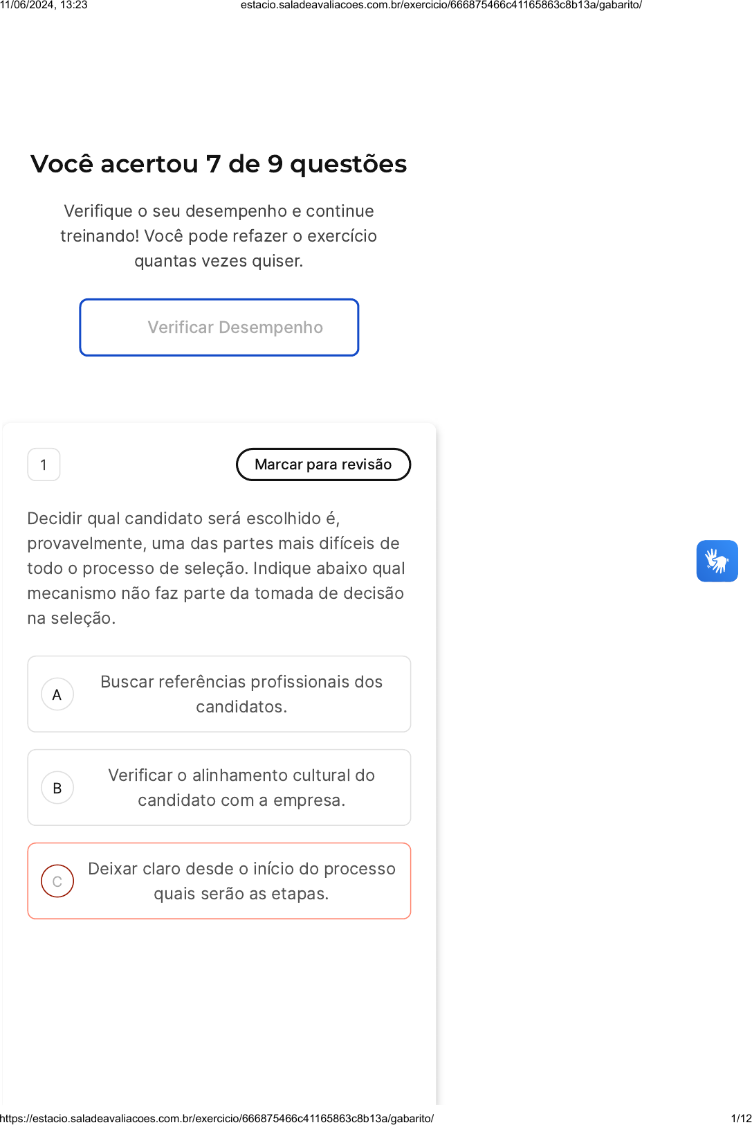 Você acertou 7 de 9 questões Verifique o seu desempenho e continue treinando! Você pode refazer o exercício quantas vezes quiser. Verificar Desempenho A B C 1 Marcar para revisão Decidir qual candidato será escolhido é, provavelmente, uma das partes mais difíceis de todo o processo de seleção. Indique abaixo qual mecanismo não faz parte da tomada de decisão na seleção. Buscar referências profissionais dos candidatos. Verificar o alinhamento cultural do candidato com a empresa. Deixar claro desde o início do processo quais serão as etapas. 11/06/2024, 13:23 estacio.saladeavaliacoes.com.br/exercicio/666875466c41165863c8b13a/gabarito/ https://estacio.saladeavaliacoes.com.br/exercicio/666875466c41165863c8b13a/gabarito/ 1/12 D E Mensurar as habilidades específicas dos candidatos. Todas as alternativas estão incorretas. Resposta incorreta Opa! A alternativa correta é a letra D. Confira o gabarito comentado! Gabarito Comentado A alternativa está incorreta porque mensurar as habilidades específicas dos candidatos é, na verdade, uma parte crucial do processo de seleção. Essa etapa permite que os recrutadores avaliem se o candidato possui as competências necessárias para desempenhar as funções do cargo. Portanto, essa ação é fundamental na tomada de decisão durante a seleção, contrariando a afirmação da questão que pedia um mecanismo que não faz parte desse processo. 2 Marcar para revisão Os jogos corporativos e as dinâmicas de grupo são atividades vivenciais e permitem que o recrutador identifique as competências em ação. Qual competência não costuma ser identificada em uma dinâmica de grupo? 11/06/2024, 13:23 estacio.saladeavaliacoes.com.br/exercicio/666875466c41165863c8b13a/gabarito/ https://estacio.saladeavaliacoes.com.br/exercicio/666875466c41165863c8b13a/gabarito/ 2/12 A B C D E Avaliar proficiência. Tomada de decisões. Exercitar planejamento. Pensar por hipóteses. Todas as alternativas estao incorretas. Resposta correta Parabéns, você selecionou a alternativa correta. Confira o gabarito comentado! Gabarito Comentado A resposta correta é: Avaliar proficiência. Avaliar proficiência é uma competência que não é identificada em uma dinâmica de grupo, pois essa competência é avaliada em uma entrevista individual, onde o recrutador pode observar o candidato em ação. As outras competências são identificadas em uma dinâmica de grupo, pois são competências que podem ser desenvolvidas e aprimoradas por meio da interação com outras pessoas. Portanto, a resposta correta é: Avaliar proficiência. ----- 11/06/2024, 13:23 estacio.saladeavaliacoes.com.br/exercicio/666875466c41165863c8b13a/gabarito/ https://estacio.saladeavaliacoes.com.br/exercicio/666875466c41165863c8b13a/gabarito/ 3/12 A B C D E 3 Marcar para revisão O primeiro passo para decidir quem contratar é determinar o CHA, que são as três dimensões da competência, variando de conhecimentos explícitos ou tácitos. Quais das respostas abaixo não se refere ao CHA? Proatividade em usar seus conhecimentos e suas habilidades. Capacidade de se comunicar assertivamente. Capacidade de usar os conhecimentos teóricos. Domínio sobre uma disciplina ou técnica específica. Todas as alternativas estão incorretas. Resposta correta Parabéns, você selecionou a alternativa correta. Confira o gabarito comentado! Gabarito Comentado O CHA é uma sigla que representa Conhecimento, Habilidade e Atitude. A alternativa "Capacidade de se comunicar assertivamente", não se enquadra em nenhuma dessas dimensões, pois a comunicação assertiva é uma habilidade interpessoal, mas não é uma dimensão do CHA. Portanto, essa alternativa é a resposta Exercicio Seleção De Pessoal Sair 11/06/2024, 13:23 estacio.saladeavaliacoes.com.br/exercicio/666875466c41165863c8b13a/gabarito/ https://estacio.saladeavaliacoes.com.br/exercicio/666875466c41165863c8b13a/gabarito/ 4/12 A B C D E correta. As outras alternativas se referem a dimensões do CHA. 4 Marcar para revisão As ferramentas que podem ser utilizadas no processo seletivo tem com o objetivo de avaliar os candidatos e selecionar os perfis mais indicados para determinado cargo/função. São ferramentas utilizadas durante o processo seletivo de seleção de pessoal, exceto: Simulações / cases. Entrevista comportamental. Dinâmicas de grupo. Debate eleitoral. Testes psicológicos. Resposta correta Parabéns, você selecionou a alternativa correta. Confira o gabarito comentado! Gabarito Comentado Diversas ferramentas podem ser utilizadas para avaliar um candidato durante uma seleção, entre elas: Entrevistas técnicas e comportamentais Questão 5 de 9 Corretas �7� Incorretas �2� Em branco �0� 1 2 3 4 5 6 7 8 9 11/06/2024, 13:23 estacio.saladeavaliacoes.com.br/exercicio/666875466c41165863c8b13a/gabarito/ https://estacio.saladeavaliacoes.com.br/exercicio/666875466c41165863c8b13a/gabarito/ 5/12 A B C Testes técnicos e psicológicos Apresentação de cases Simulações e dinâmicas de grupos O debate eleitoral não é uma ferramenta utilizada para avaliar um candidato durante uma seleção, pois não é uma ferramenta que avalia as competências técnicas e comportamentais do candidato. 5 Marcar para revisão Atualmente, os recrutadores contam com mais ferramentas de recrutamento e seleção que nunca. O avanço da tecnologia possibilitou uma melhora substancial nos processos de contratação. Dentre as ferramentas de seleção estão o(a)s ____________________________, se você necessita de um profissional que já tenha experiência no cargo oferecido. Aqui, você vai conhecer as qualificações da pessoa e tudo o que ela pode oferecer para a sua empresa. Sua aplicação, de maneira teórica e/ou de forma prática pode ser essencial para a contratação de pessoas experientes. O termo que melhor completa a frase é: Entrevistas técnicas e comportamentais. Testes técnicos. Apresentação de cases. 11/06/2024, 13:23 estacio.saladeavali