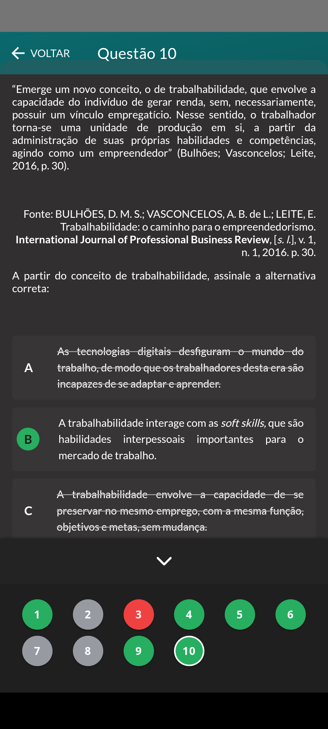 VOLTAR Questão 10 "Emerge um novo conceito, de trabalhabilidade, que envolve a capacidade do indivíduo de gerar renda, sem, necessariamente, possuir um vínculo empregatício. Nesse sentido, O trabalhador torna-se uma unidade de produção em si, a partir da administração de suas próprias habilidades e competências, agindo como um empreendedor" (Bulhões; Vasconcelos; Leite, 2016, p. 30). Fonte: D. M. VASCONCELOS, A.B. de L.; LEITE, E. Trabalhabilidade: caminho para empreendedorismo. International Journal of Professional Business Review, [s. V. 1, n. 1, 2016. p. 30. A partir do conceito de trabalhabilidade, assinale a alternativa correta: As mundo do A trabalho, de mode que trabalhadores incapazes de se adaptar e aprender. A trabalhabilidade interage com as soft skills, que são B habilidades interpessoais importantes para mercado de trabalho. A trabalhabilidade envolve a capacidade de se C preservar no mesmo com a objetivos e metas, sem mudança. 1 2 3 4 5 6 7 8 9 10