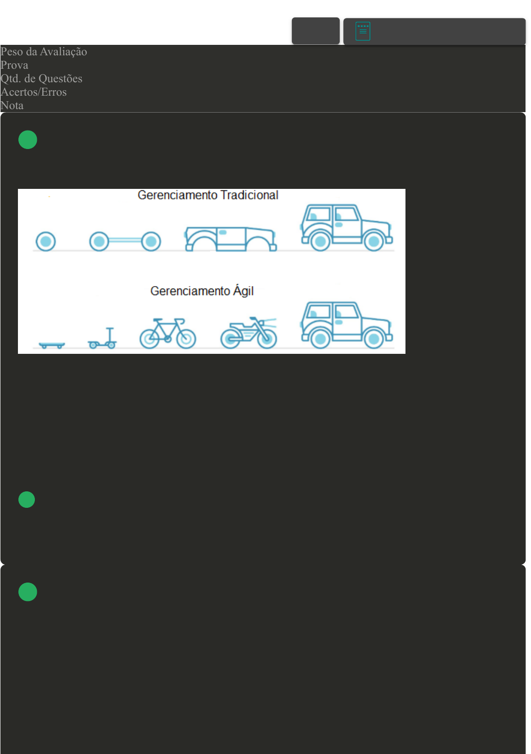 Prova Impressa GABARITO | Avaliação disciplina on-line (Cod.:987844) Peso da Avaliação 10,00 Prova 85603467 Qtd. de Questões 10 Acertos/Erros 10/0 Nota 10,00 A Figura 1, a seguir, apresenta um comparativo entre o gerenciamento tradicional e o ágil de projetos. Figura 1 - Gerenciamento Tradicional x Gerenciamento Ágil Fonte: BLOG IEEP. Metodologias Ágeis x Metodologias Tradicionais: Quais as principais diferenças? 2020. Disponível em: https://bit.ly/3Ut0UEi. Acesso em: 1° dez. 2022. A partir da figura, avalie as alternativas a seguir e indique a correta quanto às características de cada abordagem. A O planejamento, no gerenciamento tradicional, é flexível. B O desenho final do projeto é conhecido na metodologia ágil. C O gerenciamento ágil é aberto à incorporação de mudanças. D O projeto evolui consoante ao planejamento inicial na metodologia ágil. O Scrum é uma metodologia ágil de gerenciamento de projetos que enfatiza a flexibilidade, colaboração e entrega contínua de valor ao cliente. Baseado em iterações chamadas de "sprints", geralmente de duas a quatro semanas, o Scrum organiza o trabalho em ciclos curtos e focados em resultados tangíveis. Fonte: adaptado de: MCCONNELL, S.. Rapid development: Taming wild software schedules. IEEE Software, 19(2), 54-60. 2002. Com base nas informações apresentadas, avalie as asserções a seguir e a relação proposta entre elas: I. O Scrum é um modelo de gestão muito empírico. VOLTAR A+ Alterar modo de visualização 1 2 09/08/2024, 10:27 Avaliação disciplina on-line about:blank 1/6 PORQUE II. O Scrum permite que as pessoas que fazem uso dessa metodologia possam adquirir conhecimento a partir de experiências reais, a fim de tomar decisões com base nessas. A respeito dessas asserções, assinale a opção correta: A As asserções I e II são verdadeiras, mas a II não é uma justificativa correta da I. B A asserção I é uma proposição verdadeira e a II é uma proposição falsa. C As asserções I e II são verdadeiras, e a II é uma justificativa correta da I. D A asserção I é uma proposição falsa e a II é uma proposição verdadeira. O Scrum é um framework ágil para gerenciamento de projetos que se concentra na entrega rápida e incremental de valor ao cliente. É um modelo leve e flexível que permite que as equipes desenvolvam produtos de forma rápida e eficiente, adaptando-se a mudanças e priorizando a comunicação e a colaboração. Fonte: adaptado de: MCCONNELL, S.. Rapid development: Taming wild software schedules. IEEE Software, 19(2), 54-60. 2002. Com base nas informações apresentadas, avalie as asserções a seguir e a relação proposta entre elas: I. A abordagem ágil permite a visualização do progresso do projeto e a ação rápida para aprimorar a eficiência e a qualidade do trabalho. PORQUE II. A abordagem ágil oferece flexibilidade para lidar com mudanças e embasar decisões. A respeito dessas asserções, assinale a opção correta: A As asserções I e II são verdadeiras, mas a II não é uma justificativa correta da I. B A asserção I é uma proposição falsa e a II é uma proposição verdadeira. C A asserção I é uma proposição verdadeira e a II é uma proposição falsa. D As asserções I e II são verdadeiras, e a II é uma justificativa correta da I. Situação hipotética 1: João quer construir um espaço multidisciplinar em um galpão localizado no centro de sua cidade. Deste modo, contactou um engenheiro civil para a realização da obra e apresentou todos os elementos que gostaria que tivesse neste espaço, como quantidade de salas, banheiros, acabamentos, bem como definiram o orçamento, recursos e os prazos. Ao concluir o prazo, João foi ver como havia ficado a obra, isto é, após esta ser encerrada. Situação hipotética 2: 3 4 09/08/2024, 10:27 Avaliação disciplina on-line about:blank 2/6 Pedro quer construir várias salas comerciais no térreo de um determinado edifício e, deste modo, contactou um engenheiro civil. As salas foram construídas uma de cada vez, sendo que, a cada cômodo construído, o cliente avaliava junto ao engenheiro, em prol de ajustar alguns detalhes, já que ele poderia desejar construir mais salas ou mudar os acabamentos, consoante sua vontade. De posse das situações hipotéticas apresentadas e considerando que na primeira se utilizou uma abordagem tradicional e na segunda uma ágil, indique a alternativa correta quando às características da abordagem ágil. A Interação com o cliente é baixa. B Mudanças são evitadas. C Necessidades do cliente é o foco. D Planejamento é fixo. O gerenciamento ágil é ideal para projetos exploratórios, em que os requisitos precisam ser descobertos e novas tecnologias têm de ser testadas. Ele enfoca a colaboração ativa entre a equipe do projeto e os representantes do cliente, fragmentando os projetos em pequenos pedaços funcionais e adaptando-os aos requisitos em mudança. Embora princípios de desenvolvimento iterativo já circulem há algum tempo, foi apenas recentemente que as metodologias de gerenciamento ágil fincaram raízes no gerenciamento de projetos. Fonte: adaptado de: LARSON, E. W.; GRAY, C. F. Gerenciamento de projetos: o processo gerencial. 6. ed. Porto Alegre: Bookman, 2016, p. 512. De posse do excerto de texto apresentado e considerando os pressupostos do gerenciamento ágil, indique a alternativa correta. A As documentações são mais complexas e burocráticas. B Os requisitos do projeto podem sofrer alterações constantemente. C As documentações são mais complexas e burocráticas. D As mudanças não são bem-vindas, já que atrasam a entrega do projeto. As metodologias ágeis são um conjunto de práticas e princípios que visam tornar o gerenciamento de projetos mais flexível, adaptável e eficiente. Em contraste com as metodologias tradicionais, como o Waterfall, as metodologias ágeis enfatizam a colaboração, a entrega frequente de valor e a