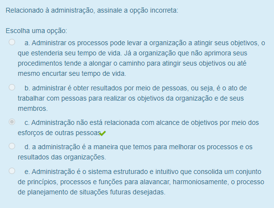 Relacionado à administração, assinale a opção incorreta: Escolha uma opção: a. Administrar os processos pode levar a organização a atingir seus objetivos, que estenderia seu tempo de vida. Já a organização que não aprimora seus procedimentos tende a alongar caminho para atingir seus objetivos ou até mesmo encurtar seu tempo de b. administrar é obter resultados por meio de pessoas, ou seja, é ato de trabalhar com pessoas para realizar os objetivos da organização e de seus membros. C. Administração não está relacionada com alcance de objetivos por meio dos esforços de outras pessoas d. a administração é a maneira que temos para melhorar os processos e os resultados das organizações. e. Administração é sistema estruturado e intuitivo que consolida um conjunto de processos e funções para alavancar, processo de planejamento de situações futuras desejadas.