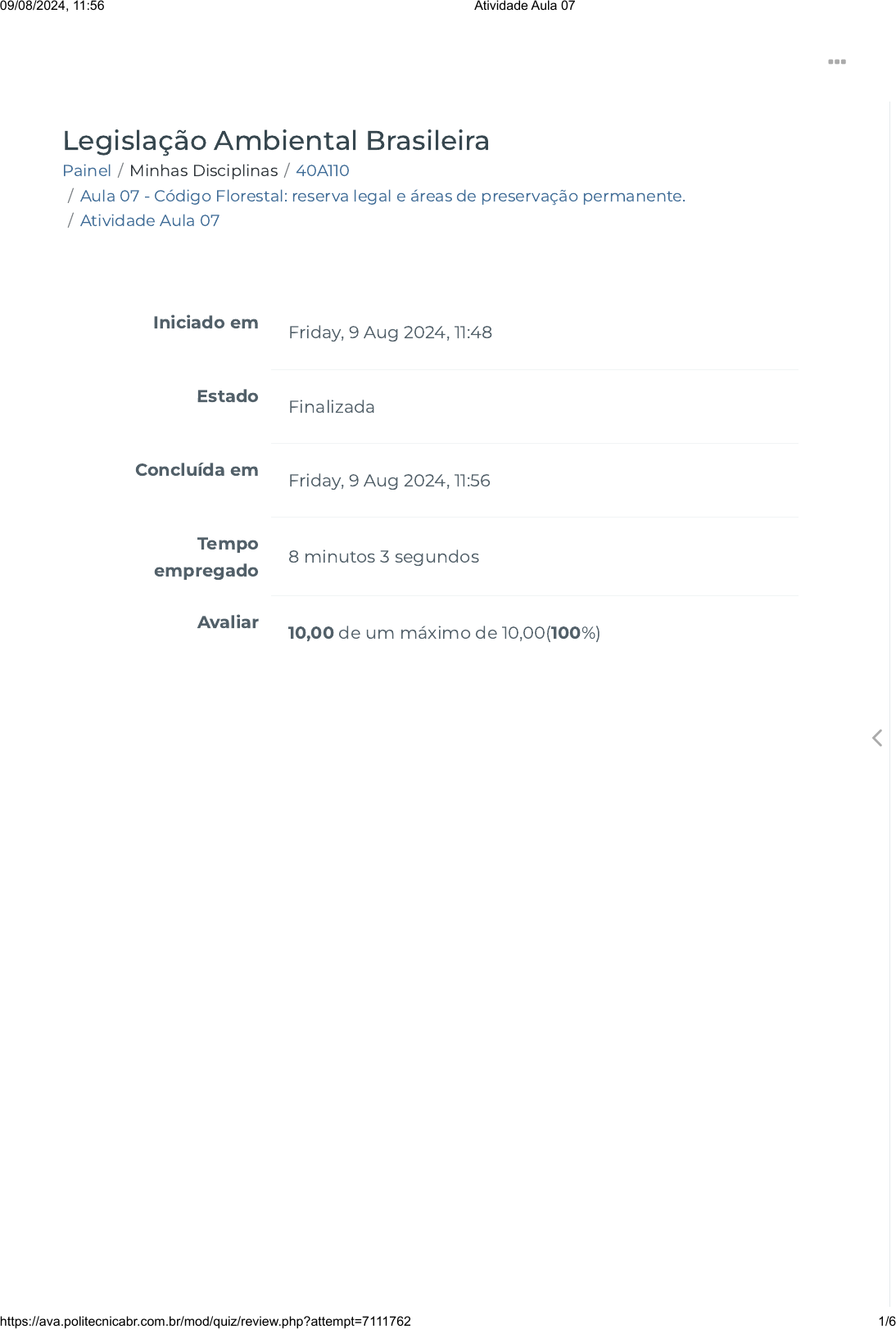 Painel / Minhas Disciplinas / 40A110 / Aula 07 - Código Florestal: reserva legal e áreas de preservação permanente. / Atividade Aula 07 Legislação Ambiental Brasileira Iniciado em Friday, 9 Aug 2024, 11:48 Estado Finalizada Concluída em Friday, 9 Aug 2024, 11:56 Tempo empregado 8 minutos 3 segundos Avaliar 10,00 de um máximo de 10,00(100%) 09/08/2024, 11:56 Atividade Aula 07 https://ava.politecnicabr.com.br/mod/quiz/review.php?attempt=7111762 1/6 https://ava.politecnicabr.com.br/my/ https://ava.politecnicabr.com.br/my/ https://ava.politecnicabr.com.br/course/view.php?id=1051 https://ava.politecnicabr.com.br/course/view.php?id=1051#section-9 https://ava.politecnicabr.com.br/mod/quiz/view.php?id=33896 https://ava.politecnicabr.com.br/ Questão 1 Correto Atingiu 2,00 de 2,00 De acordo com o Código Florestal, quais percentuais devem ser registrados como reserva legal em uma propriedade rural que se localiza na Amazônia Legal e no Cerrado, respectivamente? Escolha uma opção: a. 70% e 45%. b. 80% e 35% c. 70% e 35%. d. 80% e 45%. e. 70% e 30%. 09/08/2024, 11:56 Atividade Aula 07 https://ava.politecnicabr.com.br/mod/quiz/review.php?attempt=7111762 2/6 https://ava.politecnicabr.com.br/ Questão 2 Correto Atingiu 2,00 de 2,00 No Código Florestal atual, o percentual da propriedade que deve ser registrado como reserva legal é variável: Associe corretamente. Na propriedade em área de campos gerais em qualquer região do País. _______ na propriedade e ______ na forma de compensação ambiental em outra área, mas na mesma microbacia Em propriedades rurais localizadas em área de �oresta na chamada Amazônia Legal. Na propriedade situada em área de �oresta, outras formas de vegetação nativa nas demais regiões do País. Em propriedades situadas em áreas de Cerrado na Amazônia Legal. 20% 20% e 15 80% 20% 35% 09/08/2024, 11:56 Atividade Aula 07 https://ava.politecnicabr.com.br/mod/quiz/review.php?attempt=7111762 3/6 https://ava.politecnicabr.com.br/ Questão 3 Correto Atingiu 2,00 de 2,00 Em que ano o Código Florestal passou a vigorar no ordenamento jurídico brasileiro ? Escolha uma opção: Questão 4 Correto Atingiu 2,00 de 2,00 A desobrigação da inscrição do imóvel no CAR só ocorrerá com a apresentação da certidão de registro de imóveis ao órgão ambiental competente, onde consta a averbação da reserva legal ou o termo de compromisso, em caso de propriedade. Marque verdadeiro ou falso. Escolha uma opção: a. 1950 b. 2012 c. 1934 d. 1988 Verdadeiro Falso 09/08/2024, 11:56 Atividade Aula 07 https://ava.politecnicabr.com.br/mod/quiz/review.php?attempt=7111762 4/6 https://ava.politecnicabr.com.br/ Questão 5 Correto Atingiu 2,00 de 2,00 Marque a alternativa que corresponde ao conceito de Reserva Legal. Escolha uma opção: a. É uma das ferramentas de preservação do direito fundamental ao meio ambiente equilíbrio. b. É a parte de cada propriedade urbana. c. É preservar os locais considerados mais vulneráveis, como beiras de rios, topos de morros e encostas, que, de acordo com a previsão legal, não podem ser desmatados para não causar deslizamentos e erosões. d. É a parte de cada propriedade rural que deve ser mantida preservada, em virtude de abrigar parcela importante do ambiente natural da região onde se encontra, e que, por isso, é essencial para a manutenção da biodiversidade. e. Nenhuma alternativa correta. Entre em Contato https://www.politecnicabr.com.br 0800 084 2627 0800 084 2627 Links Úteis Dicas da nossa Diretora Acadêmica Planner de Estudos Declaração de Matrícula Orientações do AVA Abertura de Ticket Fale com o Tutor Cronograma de Estudos 09/08/2024, 11:56 Atividade Aula 07 https://ava.politecnicabr.com.br/mod/quiz/review.php?attempt=7111762 5/6 https://www.politecnicabr.com.br/ https://soundcloud.com/user-501638417/sets/escola-politecnica-brasileira https://soundcloud.com/user-501638417/sets/escola-politecnica-brasileira https://storage.googleapis.com/sirius-pubstore/semestre_plannerdeestudo%20poli.pdf https://storage.googleapis.com/sirius-pubstore/semestre_plannerdeestudo%20poli.pdf https://storage.googleapis.com/sirius-pubstore/declaracao_matricula.pdf https://storage.googleapis.com/sirius-pubstore/declaracao_matricula.pdf https://storage.googleapis.com/sirius-pubstore/orientacoes_ava.pdf https://storage.googleapis.com/sirius-pubstore/orientacoes_ava.pdf https://storage.googleapis.com/sirius-pubstore/abertura_ticket.pdf https://storage.googleapis.com/sirius-pubstore/abertura_ticket.pdf https://storage.googleapis.com/sirius-pubstore/fale_com_tutor.pdf https://storage.googleapis.com/sirius-pubstore/fale_com_tutor.pdf https://storage.googleapis.com/sirius-pubstore/cronograma_estudos.pdf https://storage.googleapis.com/sirius-pubstore/cronograma_estudos.pdf https://ava.politecnicabr.com.br/ © 2022 - Escola Politécnica Brasileira Manual de Estágio Manual de Competência Siga-nos nas redes sociais 09/08/2024, 11:56 Atividade Aula 07 https://ava.politecnicabr.com.br/mod/quiz/review.php?attempt=7111762 6/6 https://ava.politecnicabr.com.br/mod/quiz/0 https://ava.politecnicabr.com.br/mod/quiz/0 https://storage.googleapis.com/sirius-pubstore/manual_estagio.pdf https://storage.googleapis.com/sirius-pubstore/manual_estagio.pdf https://storage.googleapis.com/sirius-pubstore/manual_competencia.pdf https://storage.googleapis.com/sirius-pubstore/manual_competencia.pdf https://www.facebook.com/politecnicabr https://www.instagram.com/politecnicabr_oficial https://ava.politecnicabr.com.br/