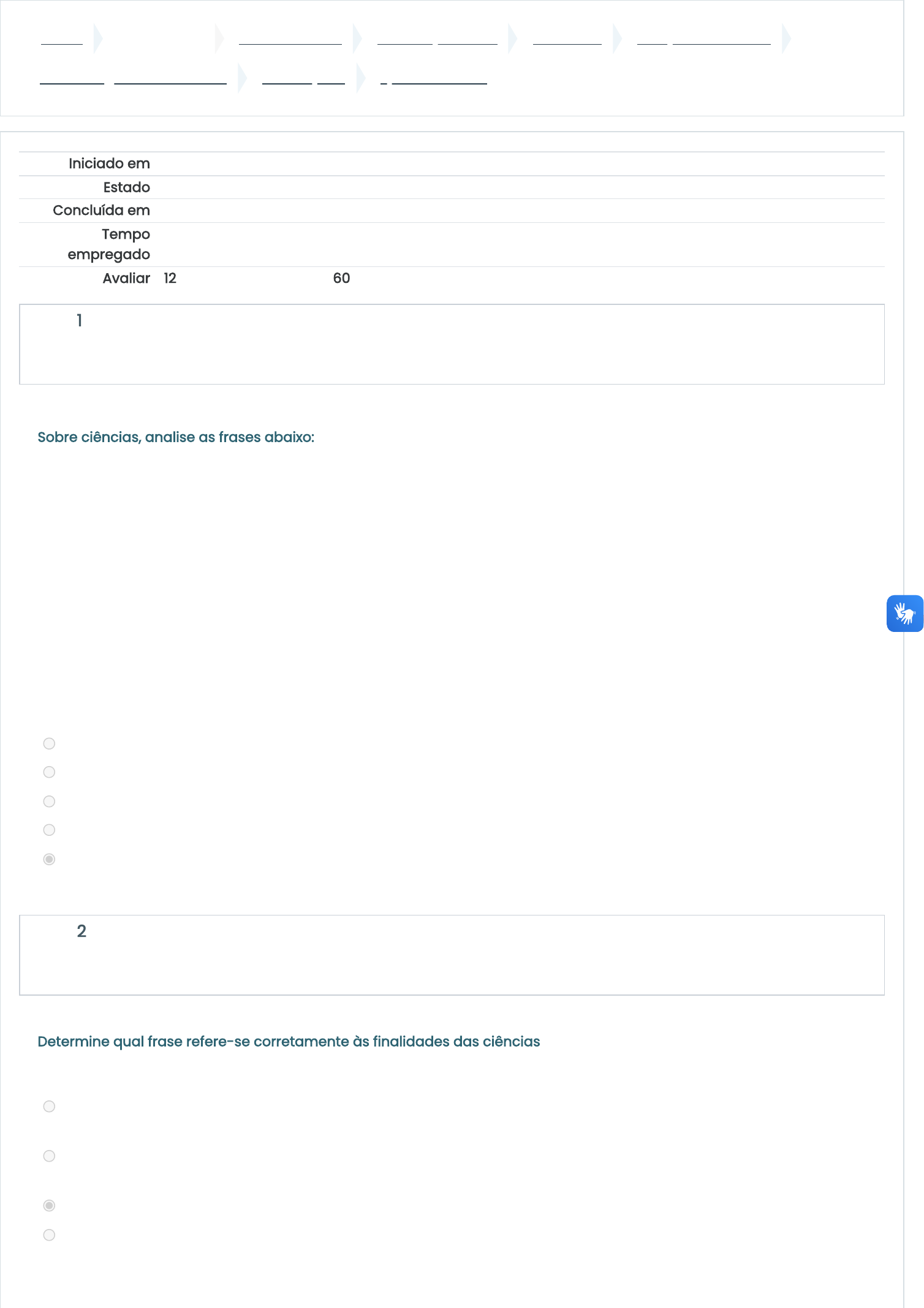 Painel Meus cursos CURSOS FUNEC Graduação - EAD Aluno EAD JUNÇÕES DE TURMA Metodologia Científica - Gr AVALIAÇÕES QUESTIONÁRIO 1 Iniciado em Monday, 15 Jul 2024, 16:22 Estado Finalizada Concluída em Monday, 15 Jul 2024, 17:19 Tempo empregado 56 minutos 18 segundos Avaliar 12 de um máximo de 20(60%) Questão 1 Completo Atingiu 2 de 2 Questão 2 Completo Atingiu 0 de 2 Sobre ciências, analise as frases abaixo: I - Refere-se ao sistema de adquirir conhecimento baseado no método científico bem como ao corpo organizado de conhecimento conseguido através de tais pesquisas. II - Conhecimento das causas pelas causas. É o conhecimento demonstrativo. III - Representa todo o conhecimento conquistado por meio de estudo ou prática. IV - É inquestionável, pois é fundamentada em testes científicos. Estão corretas as frases: Escolha uma opção: a. I, II e IV b. I e IV c. II e III d. I e II, e. I, II e III Determine qual frase refere-se corretamente às finalidades das ciências Escolha uma opção: a. Ciência aplicada não se preocupa com a aplicação da teoria e a ciência pura elabora previsões em relação aos problemas práticos. b. Ciência pura preocupa-se, única e exclusivamente, com a aplicação da teoria e a ciência aplicada elabora previsões em relação aos problemas práticos. c. Ciência aplicada é usada para responder e explicar fenômenos naturais e ciência pura nunca é absoluta ou final. d. Ciência pura não se preocupa com a aplicação da teoria e a ciência aplicada elabora previsões em relação a problemas práticos. https://ava.funec.br/my/ https://ava.funec.br/course/index.php?categoryid=10 https://ava.funec.br/course/index.php?categoryid=17 https://ava.funec.br/course/index.php?categoryid=19 https://ava.funec.br/course/index.php?categoryid=77 https://ava.funec.br/course/view.php?id=291 https://ava.funec.br/course/view.php?id=291#section-3 https://ava.funec.br/mod/quiz/view.php?id=1695 Questão 3 Completo Atingiu 2 de 2 Questão 4 Completo Atingiu 0 de 2 No momento atual estamos vivenciando uma pandemia provocada pelo COVID-19 e várias teorias tem provocado debates acalorados no meio científico. Sob o ponto de vista da ciência, teoria é: Escolha uma opção: a. Uma ideia sem base em observação e experimentação, que usa o senso comum para explicar fatos do cotidiano. b. Uma ideia, apoiada pelo conhecimento científico, que, de tão comprovada pelos cientistas, já é considerada uma verdade incontestável. c. Sinônimo de hipótese, ou seja, uma suposição ainda sem comprovação experimental. d. Uma ideia, apoiada no conhecimento científico, que tenta explicar fenômenos naturais relacionados, permitindo fazer previsões sobre eles. e. Sinônimo de lei científica, que descreve regularidades de fenômenos naturais, mas não permite fazer previsões sobre eles. Ao examinar o comportamento da letalidade do COVID-19, o cientista sugere uma explicação para o seu mecanismo de infecção, baseando-se na causa e no efeito observados. Esse procedimento: 01. Faz parte do método científico. 02. É denominado formulação de hipóteses. 04. Deverá ser seguido de uma experimentação. 08. Deve ser precedido por uma conclusão. Dê como resposta a soma dos números das asserções corretas. Escolha uma opção: a. 7. b. 12. c. 5. d. 3. e. 11. Questão 5 Completo Atingiu 2 de 2 Questão 6 Completo Atingiu 2 de 2 A partir das informações dadas, enumere as, em ordem sequencial, de acordo com as etapas do método científico: ( ) Conclusões. ( ) Possíveis respostas para a pergunta em questão (hipótese). ( ) Etapa experimental. ( ) Dúvida sobre determinado fenômeno da natureza. ( ) Levantamento de deduções. A ordem é: Escolha uma opção: a. 2, 4, 1, 3 e 5. b. 5, 4, 1, 2 e 3. c. 5, 4, 1, 3 e 2. d. 5, 2, 4, 1 e 3 e. 5, 2, 1, 3 e 4. Em relação à procura de respostas científicas para uma vacina que ainda não foi implementada para a cura da COVID-19, qual deve ser o primeiro passo que os cientistas devem fazer de acordo com o método científico? Escolha uma opção: a. Generalizar. b. Fazer deduções. c. Criar uma teoria. d. Observar. e. Produzir hipóteses. Questão 7 Completo Atingiu 0 de 2 Questão 8 Completo Atingiu 0 de 2 Leia o texto Diferentemente dos países ricos, que têm altos investimentos em pesquisas científicas, as nações em desenvolvimento como o Brasil apresentam baixo nível de inovação! O que é um obstáculo para o crescimento da produtividade da economia e do conhecimento científico. A atual situação de falta de recursos e de uma burocracia sem fim por trás da pesquisa científica brasileira, faz com que os principais problemas enfrentados pelos pesquisadores sejam os baixos salários e as dificuldades para se conseguir financiamento e se dedicar integralmente à pesquisa científica. Após ler o texto acima verifique as afirmativas a seguir que estão relacionadas com pesquisas científicas. Analise-as e assinale a incorreta. Escolha uma opção: a. No Brasil, a pesquisa sempre parte de uma problemática, no qual o repertório de conhecimento disponível não gera resposta adequada. b. Toda pesquisa brasileira baseia-se em uma teoria que serve como ponto de partida para a investigação. c. Nenhuma pesquisa no Brasil gerar subsídios para o surgimento de novas teorias d. Para solucionar um problema, são levantadas hipóteses que podem ser confirmadas ou refutadas pelos pesquisadores brasileiros. e. A pesquisa brasileira sempre partiu de hipóteses, de interrogações, situações para a qual o repertório de conhecimento disponível não gera resposta adequada. Sobre experiências empíricas está(ão) correta(s) a(s) frase(s): I – Levaram a descoberta de várias substâncias químicas e reações químicas, que constituem o ensino da química moderna. II - Analisam uma só variável do problema por vez. III – Utilizam o padrão ensaio-erro para se ter controle da experiência. Escolha uma opção: a.