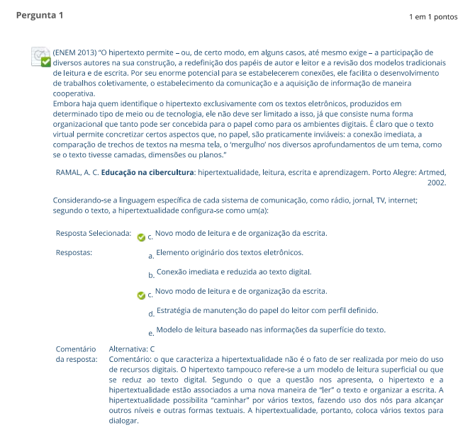 Pergunta 1 1 em 1 pontos (ENEM 2013) "O hipertexto permite ou, de certo modo, em alguns casos, até mesmo exige a participação de diversos autores na sua construção, a redefinição dos papéis de autor e leitor e a revisão dos modelos tradicionais de leitura e de Por seu enorme potencial para se estabelecerem conexões, ele facilita desenvolvimento de trabalhos coletivamente, estabelecimento da comunicação e a aquisição de informação de maneira cooperativa. Embora haja quem identifique hipertexto exclusivamente com os textos eletrônicos, produzidos em determinado tipo de meio ou de tecnologia, ele não deve ser limitado a isso, já que consiste numa forma organizacional que tanto pode ser concebida para papel como para os ambientes digitais. É claro que 0 texto virtual permite concretizar certos aspectos que, no papel, são praticamente inviáveis: a conexão imediata, a comparação de trechos de textos na mesma tela, O nos diversos aprofundamentos de um tema, como se texto tivesse camadas, dimensões ou planos." C. Educação na cibercultura: hipertextualidade, leitura, escrita e Porto Alegre: 2002. Considerando-se a linguagem de cada sistema de como rádio, jornal, TV, segundo texto, a hipertextualidade configura-se como um(a): Resposta Selecionada: Novo modo de leitura e de organização da escrita. Respostas: a. Elemento originário dos textos b. Conexão imediata e reduzida ao texto digital Novo modo de leitura e de organização da d. Estratégia de manutenção do papel do leitor com perfil definido. Modelo de leitura baseado nas informações da superficie do texto. e. Comentário Alternativa: C da resposta: Comentário: que caracteriza a hipertextualidade não é 0 fato de ser realizada por meio do uso de recursos O hipertexto tampouco refere-se a um modelo de leitura superficial ou que se reduz ao texto digital. Segundo que a questão nos apresenta, hipertexto e a hipertextualidade estão associados a uma nova maneira de texto e organizar a escrita. A hipertextualidade possibilita "caminhar" por vários textos, fazendo uso dos para alcançar outros níveis e outras formas textuais. A hipertextualidade, portanto, coloca vários textos para dialogar.