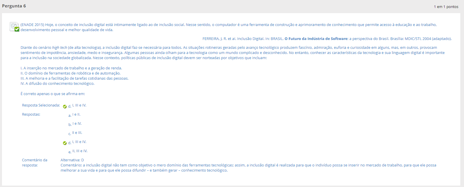 Pergunta 6 1 (ENADE 2015) o conceito de inclusão digital está intimamente ligado ao de inclusão social. Nesse sentido. o computador é uma ferramenta de construção e aprimoramento de conhecimento que permite acesso à educação e ao trabalho, desenvolvimento pessoal e melhor qualidade de vida. R. et al. Inclusão Digital. In: Futuro da Indústria de Software: a perspectiva do Brasil. Brasília: MDIC/STI. 2004 Diante do cenário high tech (de alta a inclusão digital faz-se necessária para As situações rotineiras geradas pelo avanço tecnológico produzem admiração, euforia e curiosidade em alguns, em outros, provocam sentimento de ansiedade, medo e insegurança. Algumas pessoas ainda olham para a tecnologia como um mundo complicado e No entanto, conhecer as características da tecnologia e sua linguagem digital é import para a inclusão na sociedade globalizada. Nesse contexto, políticas públicas de inclusão digital devem ser norteadas por objetivos que incluam: I. A inserção no mercado de trabalho e a geração de renda. II. domínio de ferramentas de robótica e de automação. III. A melhoria e a facilitação de tarefas cotidianas das pessoas. IV. A difusão do conhecimento tecnológico. correto apenas o que se afirma em: Resposta Selecionada: d. III e IV. Respostas: a. III. d. III e IV. e. III e IV Comentário da Alternativa: D resposta: Comentário: a inclusão digital não tem como objetivo mero domínio das ferramentas assim, a inclusão digital é realizada para que indivíduo possa se inserir no mercado de trabalho, para que ele possa melhorar a sua vida e para que ele possa difundir e também gerar conhecimento tecnológico.