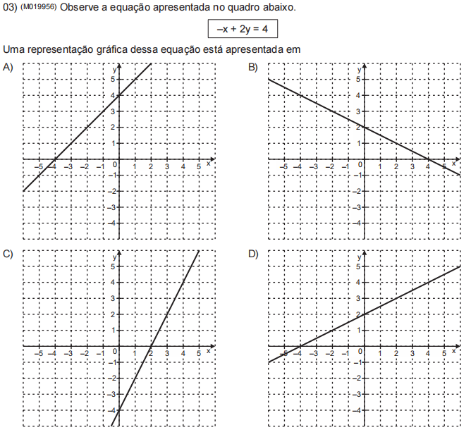 03) (M019956) Observe a equação apresentada no quadro abaixo. -X + 2y=4 Uma representação gráfica dessa equação está apresentada em A) y B) y 5 5 4 4 3 3 2 2 1 1 -5 4 -3 -2 0 1 2 3 4 5 -5 -4 -3 0 2 3 4 1 1 -3 3 -4 C) D) y y 5 5 4 4 3 3 2 2 1 1 -5 -4 -3 2 1 0 1 2 3 4 5 3 2 0 1 2 3 4 5 1 1 2 2 -3 3 -4 -4