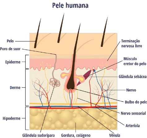 Fisioterapia – Dermatofuncional Unidade 1 • Anatomia e fisiologia dermatológica - Epiderme - Derme - Tela subcutânea (hipoderme) - Anexos da pele • Envelhecimento - Tipos de envelhecimento - Teorias sobre o envelhecimento - Modificações da pele com o envelhecimento - Técnicas de revitalização da pele • Acne - Etiopatogenia da acne - Classificação da acne -Tratamento da acne • Cosméticos -Classificação da pele - Higienizantes - Esfoliantes - Nutrição - Fotoprotetores Anatomia e fisiologia dermatológica Você sabia que a pele é um órgão? Aliás, é o maior órgão do corpo humano – e, assim como nossos demais órgãos (coração, estômago, pulmões etc.), é uma estrutura viva que desempenha funções específicas. Então, vamos começar aprendendo sobre a anatomia e a fisiologia da pele e de outras estruturas que compõem o sistema tegumentar. A pele reveste toda a parte externa do nosso corpo, com exceção dos órgãos genitais. Sua principal função é de proteção, funcionando como uma barreira entre o meio externo e o interno. As proteínas e os lipídeos presentes na camada mais externa da pele impedem o atrito, a entrada de sujeira e de microrganismos, e a saída de água. Já a melanina, pigmento produzido pelos melanócitos, protege a pele da radiação ultravioleta. Finalmente, as células de Langerhans, presentes na epiderme, auxiliam na nossa imunidade celular, protegendo o organismo de ataques microbianos. Outra importante função da pele é regular a temperatura do corpo, auxiliando a manter nossa temperatura interna estável (em torno de 36 ºC). Essa função é exercida principalmente pelos vasos sanguíneos subcutâneos, que se contraem para conservar o calor e se dilatam para auxiliar na eliminação de calor, e pelas glândulas sudoríparas, que produzem suor para baixar nossa temperatura. A pele também age como uma reserva de nutrientes: armazena gordura na forma de triglicérides nos adipócitos da tela subcutânea (hipoderme). Finalmente, a moderação de impactos sensitivos é outra função da pele. Receptores de tato, pressão, calor, frio e dor presentes na pele captam esses estímulos e os transmitem até o sistema nervoso central (SNC). A pele é composta por três camadas: epiderme, derme e tela subcutânea (Figura 1). Na sequência, estudaremos cada camada, assim como os anexos cutâneos. EPIDERME A epiderme é a camada mais superficial da pele, com espessura muito delgada: menos de 0,12 mm na maior parte do corpo, segundo Guirro e Guirro (2003). É formada por tecido epitelial, composto por células chamadas queratinócitos (que produzem a queratina, uma proteína insolúvel, fibrosa, resistente e impermeável), por melanócitos (células que produzem a melanina, que dá pigmento à pele e aos pelos), pelas células de Langerhans (células de proteção e defesa) e pelas células de Merkel (responsáveis pela sensibilidade tátil). A epiderme não tem vasos sanguíneos, e as células de sua camada basal recebem nutrientes e oxigênio dos vasos sanguíneos presentes na derme por difusão. Apesar de sua pequena espessura, a epiderme é composta por células que se dispõem em quatro a cinco camadas, conforme demonstra a Figura 2. A camada mais profunda é chamada basal ou germinativa, e é constituída por células vivas, que estão constantemente se dividindo. Essas células empurram as células maduras para cima e vão perdendo água até morrerem e descamarem para a superfície. Em um indivíduo jovem, esse ciclo de renovação celular acontece a cada 28 a 30 dias. Acima da camada germinativa, temos as camadas espinhosa, granulosa e lúcida (presente apenas na pele espessa), e, mais externamente, a camada córnea. Essa última é formada por vários planos de células mortas, achatadas, ricas em queratina, que conferem impermeabilidade e proteção à pele e são eliminadas regularmente. DERME Logo abaixo da epiderme, encontramos a derme. Segundo Guirro e Guirro (2003), a derme tem espessura média de 2 mm, é formada por tecido conjuntivo e, sobre ela, está apoiada a epiderme. É na derme que encontramos as fibras elásticas, colágenas e reticulares, os vasos sanguíneos, os vasos linfáticos e os nervos. Ela também contém as glândulas sebáceas e sudoríparas, que produzem, respectivamente, o sebo e o suor. A derme tem duas camadas: a derme papilar e a derme reticular. Na camada papilar, formada por tecido conjuntivo frouxo, encontramos as papilas dérmicas, projeções digitiformes que, por aumentarem a área de contato entre derme e epiderme, permitem a troca de nutrientes entre essas duas camadas. A camada reticular é constituída por tecido conjuntivo denso não modelado, e é nela que encontramos a maior parte das fibras (MARIEB; WILHELM; MALLAT, 2014). TELA SUBCUTÂNEA (HIPODERME) Abaixo da derme, encontra-se a tela subcutânea, também denominada hipoderme. Camada mais profunda da pele, é formada por tecido adiposo e tecido conjuntivo frouxo. Guirro e Guirro (2003) listam as funções desse tecido adiposo: reservatório de energia, isolante térmico, modelagem da superfície corporal, absorção de choque e fixação de órgãos. A principal célula do tecido adiposo é o adipócito (Figura 3), capaz de armazenar gordura em seu interior sob a forma de triglicerídeos. Com o ganho de peso, a tela subcutânea fica mais espessa. Nas mulheres, a gordura subcutânea acumula-se inicialmente nas coxas e mamas. Nos homens, acumula-se inicialmente na parte anterior do abdômen (MARIEB; WILHELM; MALLAT, 2014, p. 115). ANEXOS DA PELE Completam as estruturas do sistema tegumentar os chamados anexos da pele, ou cutâneos: pelos, unhas, glândulas sebáceas e glândulas sudoríparas. Os pelos nascem dos folículos pilosos e são excelentes receptores táteis. Também servem para manter o corpo aquecido – função que, porém, foi diminuída ao longo da evolução humana. As unhas são feitas de queratina – por isso,