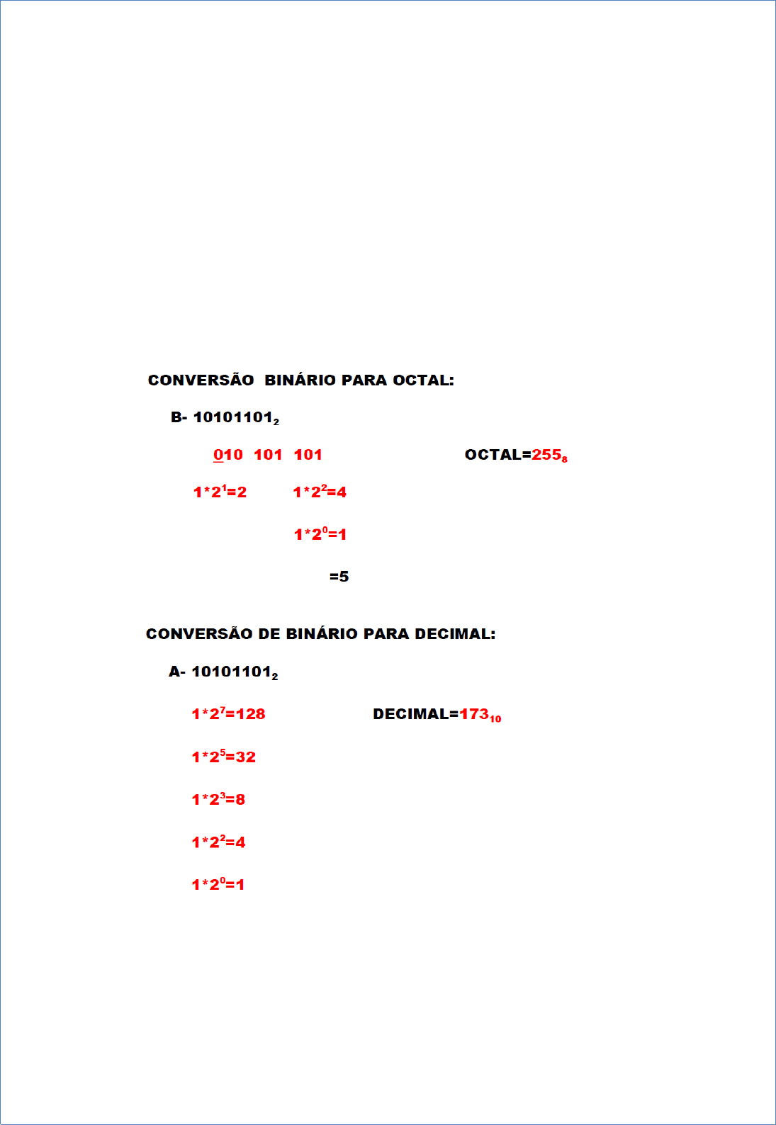 Atividades Extra – Conversão Numérica Olá Alunos, Antes de começarmos a resolver os exercícios, é importante estudar o capítulo II que trata da conversão binária. Além disso, lembre de assistir nossa Segunda aula conceitual que exemplifica algumas conversões que irão auxiliá-los nestes exercícios. Porém antes de iniciarmos os exercícios, disponibilizamos abaixo alguns exemplos de conversão. Leiam com atenção e verifiquem corretamente como foi feito cada passo para conversão dos números. Vamos começar? Segue abaixo alguns exemplos: Agora que observamos estes exemplos, vamos praticar? Abaixo segue uma vasta lista de exercícios, onde daremos uma semana de prazo para sua realização e pratica. Após esse prazo, iremos disponibilizar no material extra as respostas destes exercícios. OBS: Lembramos que esta lista de exercício NÃO vale nota para a disciplina. Vamos para a lista: 1 – Converta os seguintes números para a base decimal. a) 102 b) 648 c) 12116 d) 12C16 e) 5128 f) FFF16 g) 111110000111102 h) 778 i) 11111111112 2 – Converta os seguintes números para as bases binárias, octal e hexadecimal. a)1010 b) 6410 c) 12110 d) 125510 e) 51210 f) 49710 3 – Converta os Seguintes números para as bases indicadas. 4 – Analise os problemas abaixo e resolva as conversões. 5) Converta para a base decimal: a) 1010102 b)10108 c) 10218 d) 10258 e) 21658 f) 1FA216 g) E1A16 h) 7078 6) Converta para a base binária: a) 7210 b) 12710 c) 3510 d) 2310 e) 16510 f) 4010 g) 2210 h) 1410 7) Converta para a base decimal: a) 1000012 b) 110112 c) 11001002 d) 100000002 e) 110010112 f) 101100012 g) 101100012 h) 1001100002 8) Converta para a base octal a) 56710 b) 98310 c) 102010 d) 6510 e) 68010 f) 10510 g) 29410 h) 67910 9) Converta para a base Hexadecimal a) 56710 b) 98310 c) 102010 d) 6510 e) 68010 f) 10510 g) 29410 h) 67910 10) Converta para a base Octal os seguintes números em base Hexadecimal: a) F516 b) AB716 c) 98A16 d) F1E216 e) E22916 f) 13516 g) 71016 h) CE116 11) Converta para a base Binária os seguintes números em base Octal: a) 33658 b) 7528 c) 6258 d) 137038 e) 671058 f) 20048 g) 3218 h) 76548 12) Converta para a base Octal os seguintes números em base Binária: a) 11101012 b) 111100112 c) 10100111001011101110002 d) 1111011102 e) 101010101010102 f) 1111010010102 g) 1101000102 h) 101111100112 13) Converta para a base Hexadecimal os seguintes números em base Binária: a) 11001010010110102 b) 11111010110010102 c) 110100000001110110102 d) 11101101000100012 e) 1001101010111100110111102 f) 100100011010001012 g) 11001111000100110102 h) 10110000110010102 image2.emf image3.emf image4.emf image5.emf image6.emf image7.emf image8.png image9.png image10.png image11.png image12.png image1.emf