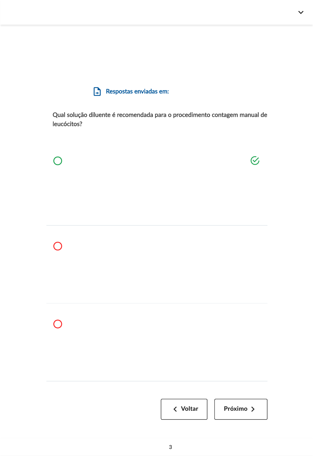 Pós Teste Respostas enviadas em: 09/08/2024 18:21 3. Qual solução diluente é recomendada para o procedimento contagem manual de leucócitos? Você acertou! A. Reagente de Turk; Esse reagente é recomendado para diluição na contagem manual de leucócitos e causa hemólise. Resposta incorreta. B. Reagente de Gower; Esse reagente é recomendado para diluição na contagem manual de eritrócitos. Resposta incorreta. C. Reagente panó�co. Esse reagente é u�lizado para coloração dos elementos do sangue em distensão sanguínea. Voltar Próximo 3 de 5 perguntas Anterior U2